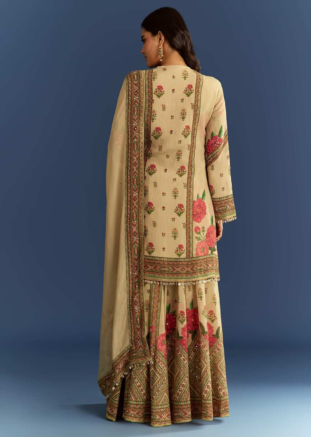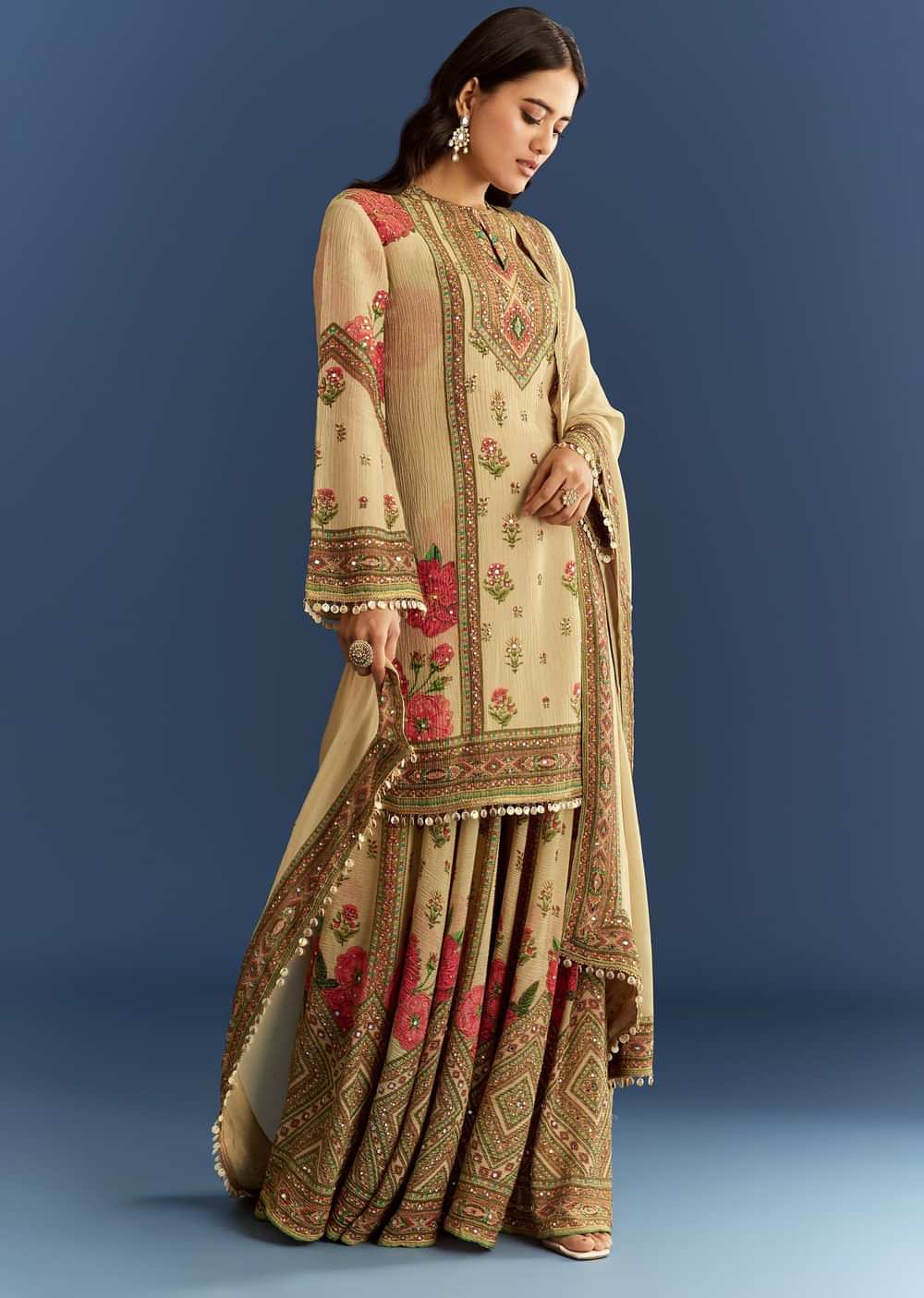 Echoing elegance in beige, this floral printed kurta is enhanced with glistening mirror and sequin work, matched with a printed palazzo for pooja-perfect grace.