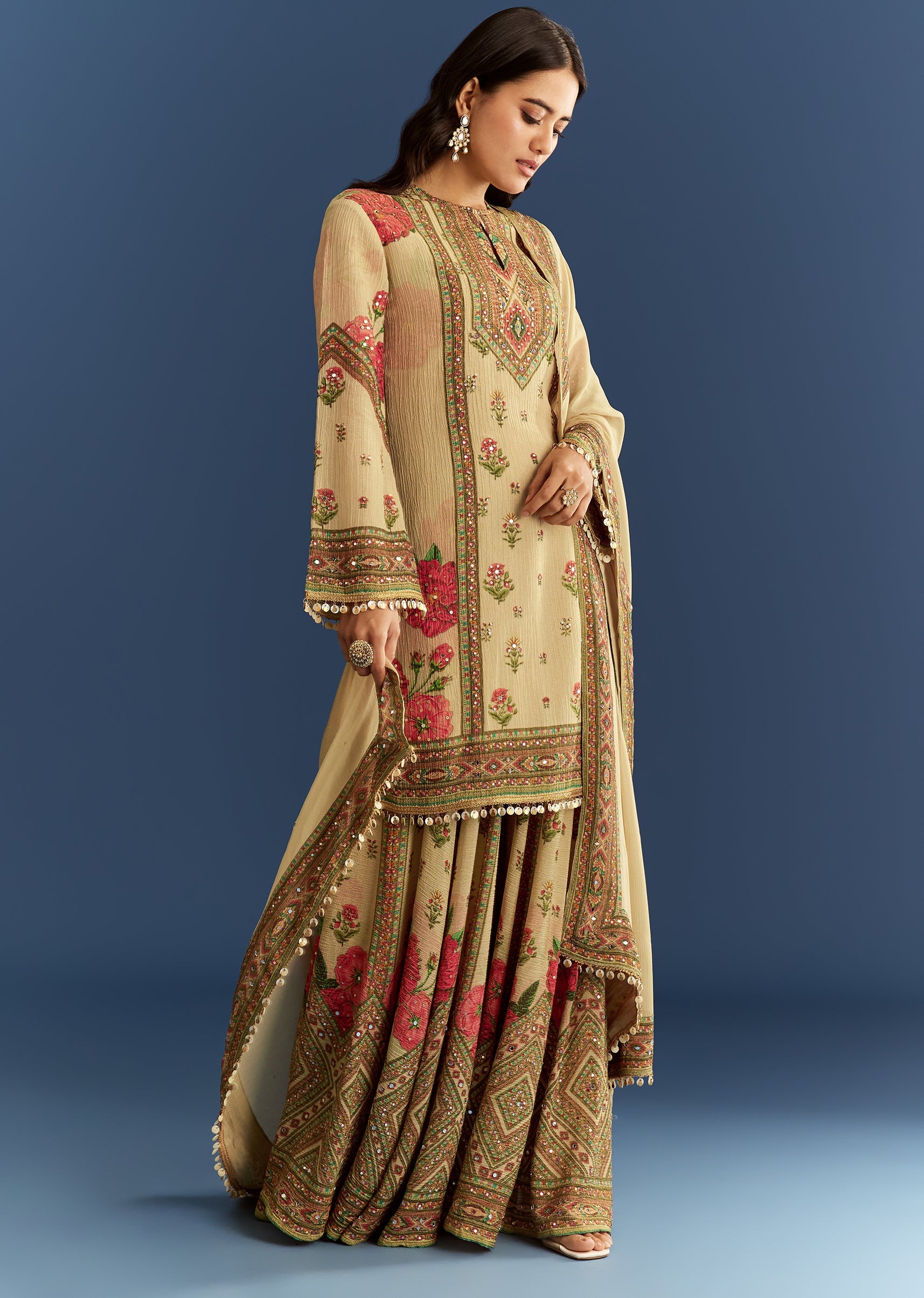 Beige Crush Tissue Floral Printed Kurta Palazzo With Dupatta