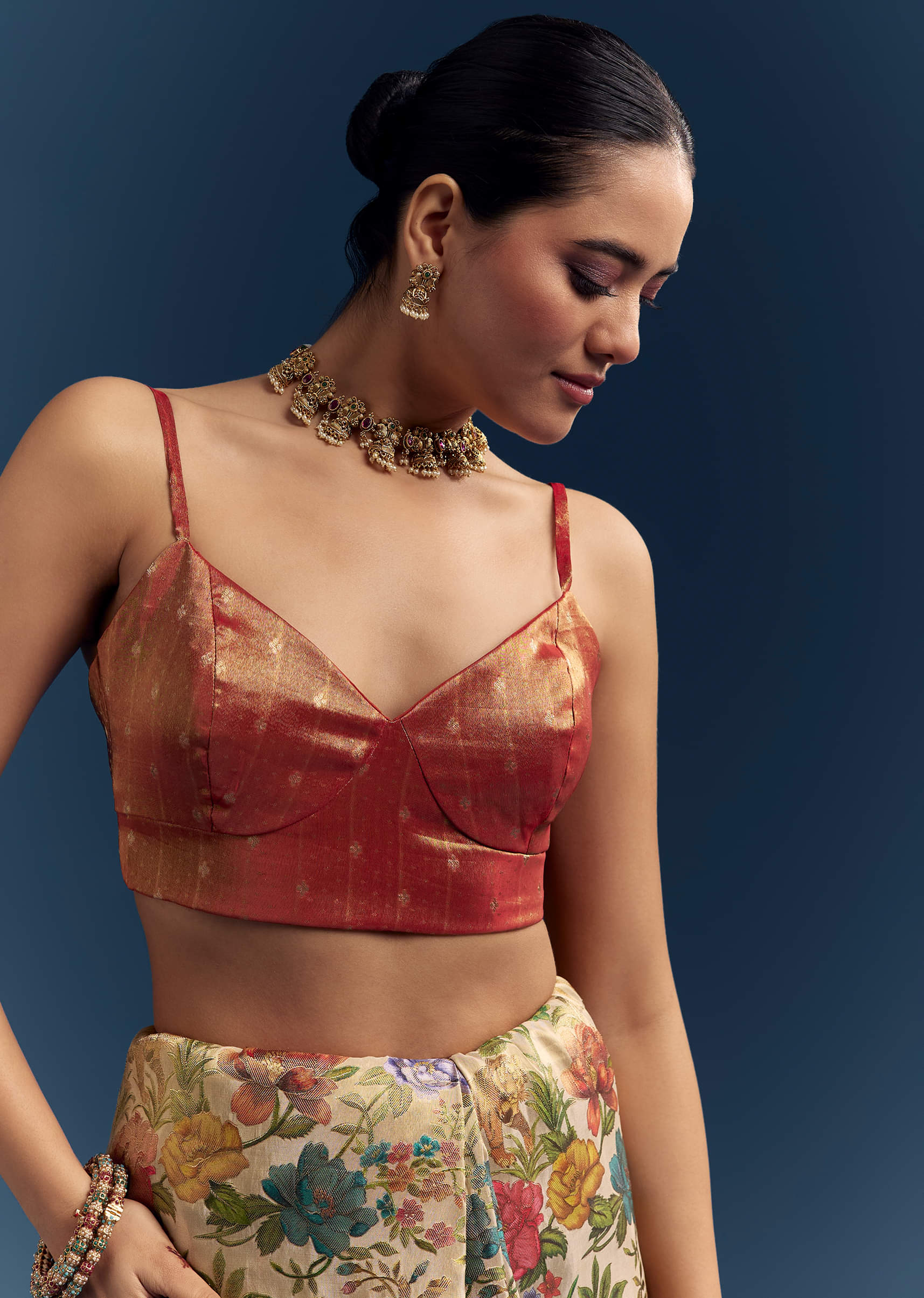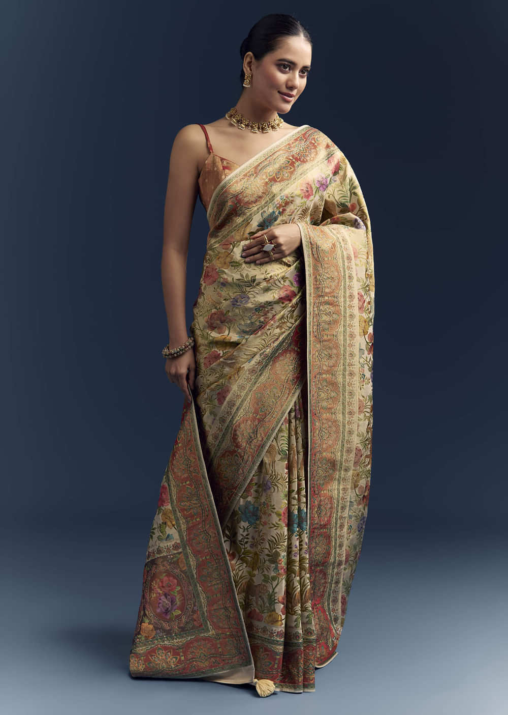 Try a seedha-pallu drape to showcase the motifs. Add stone earrings, a polished bun, and classic mojris.