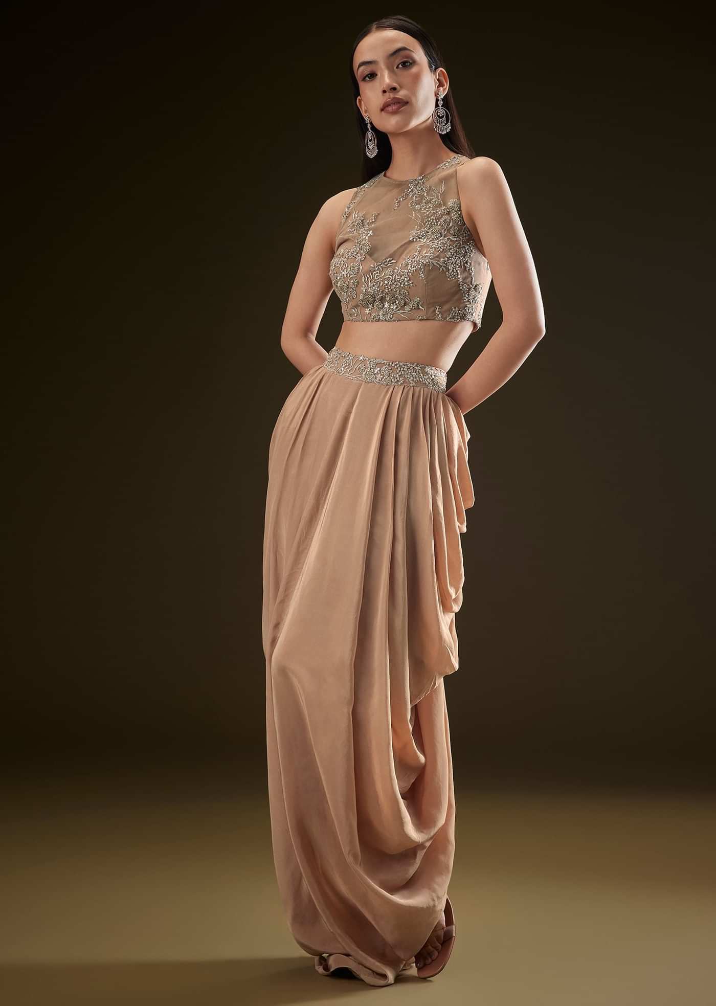 Step Into A Realm Of Ethereal Elegance With This Beige Drape Dhoti Skirt Exquisitely Paired With An Embroidered Bustier. The Intricate Embroidery On The Bustier Showcases Delicate Craftsmanship Adding A... More Product Details
