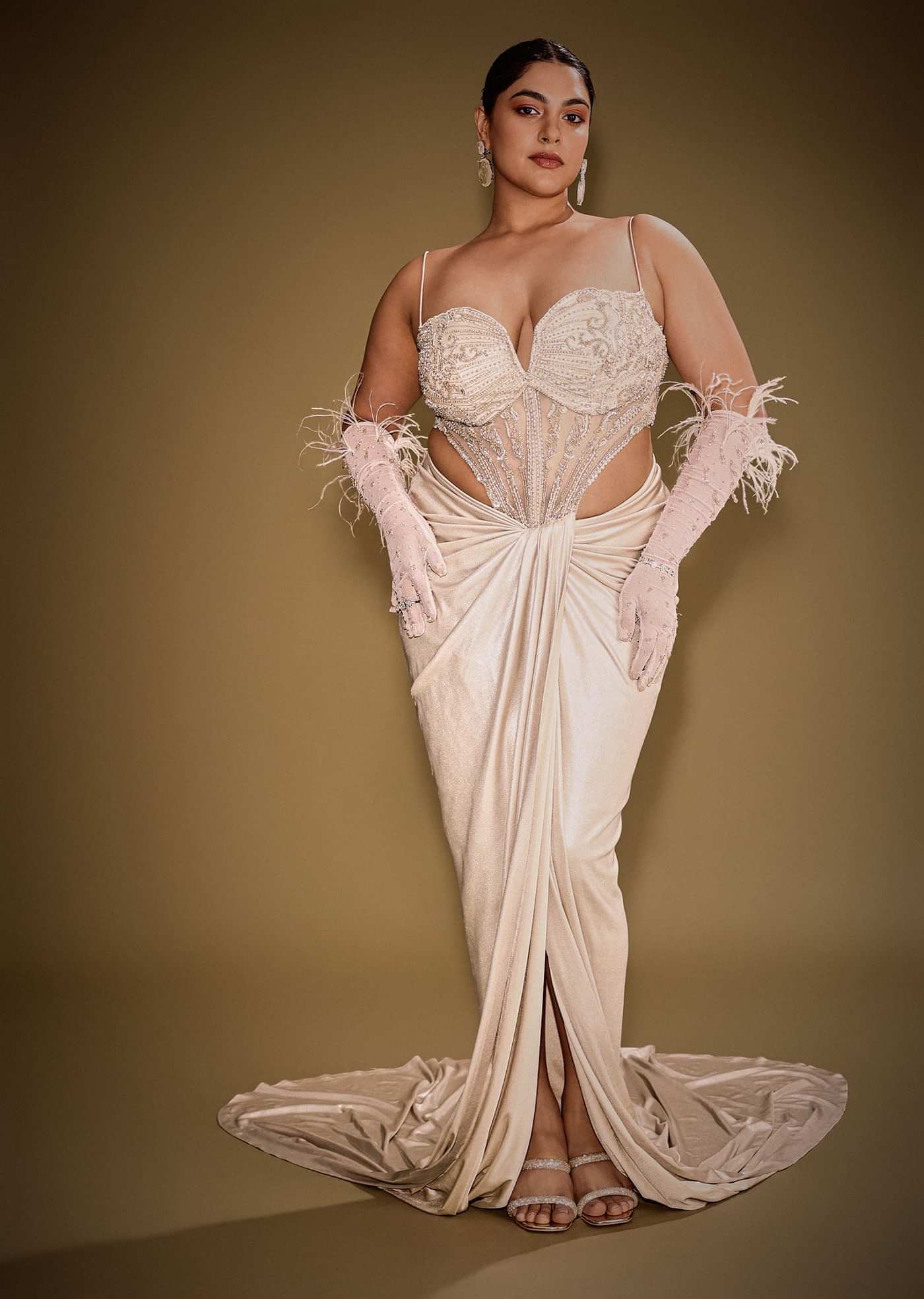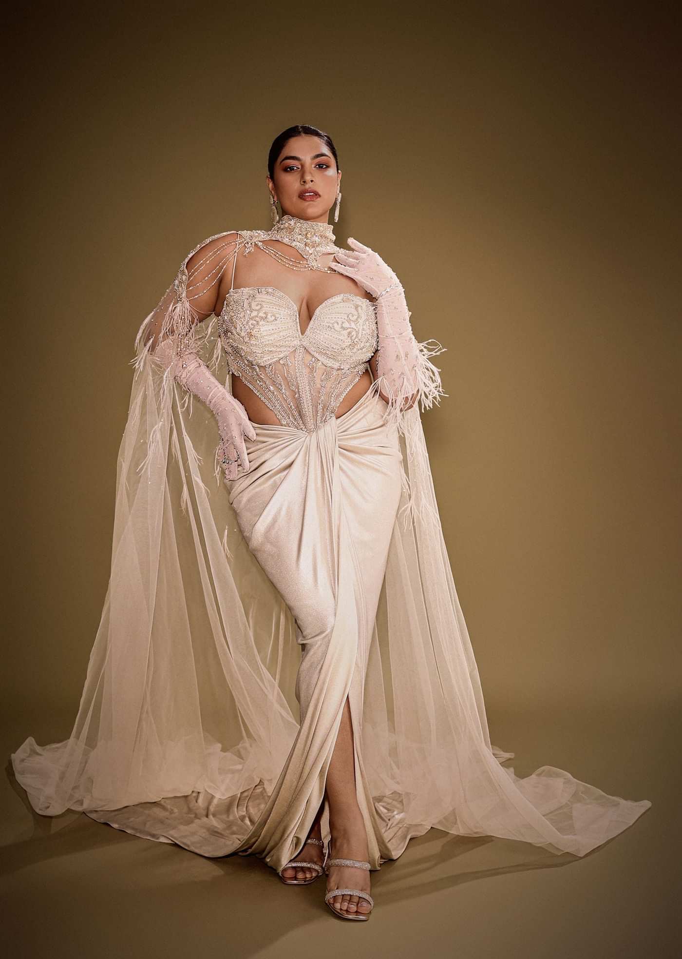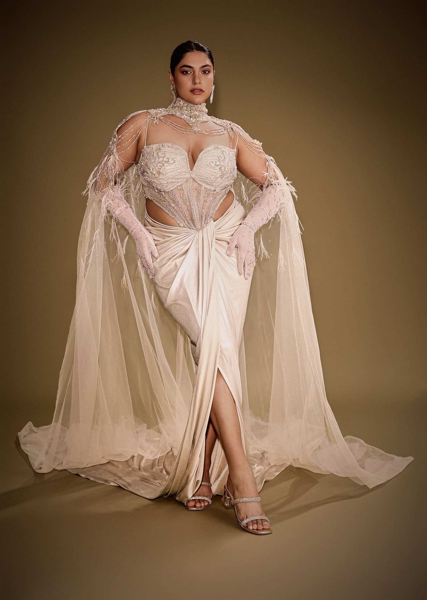 Grace meets grandeur in this beige embroidered drape gown, crafted in luxe imported fabric and paired with a full-length cape adorned in cutdana and sequins. Ideal for cocktail soirées or... More Product Details