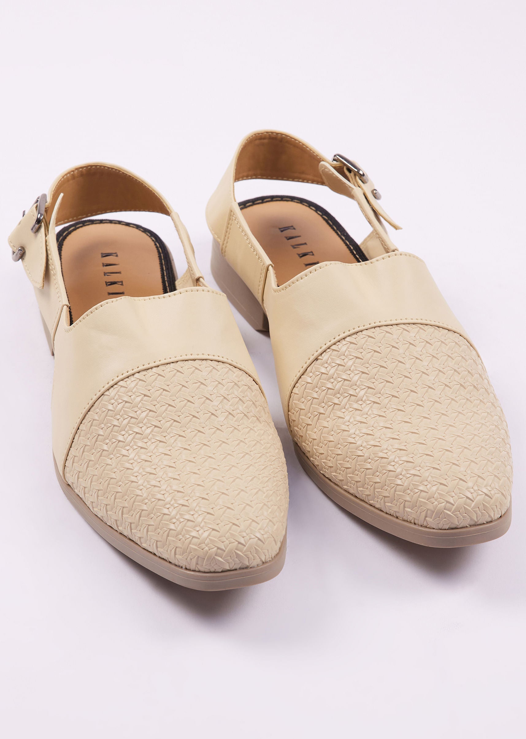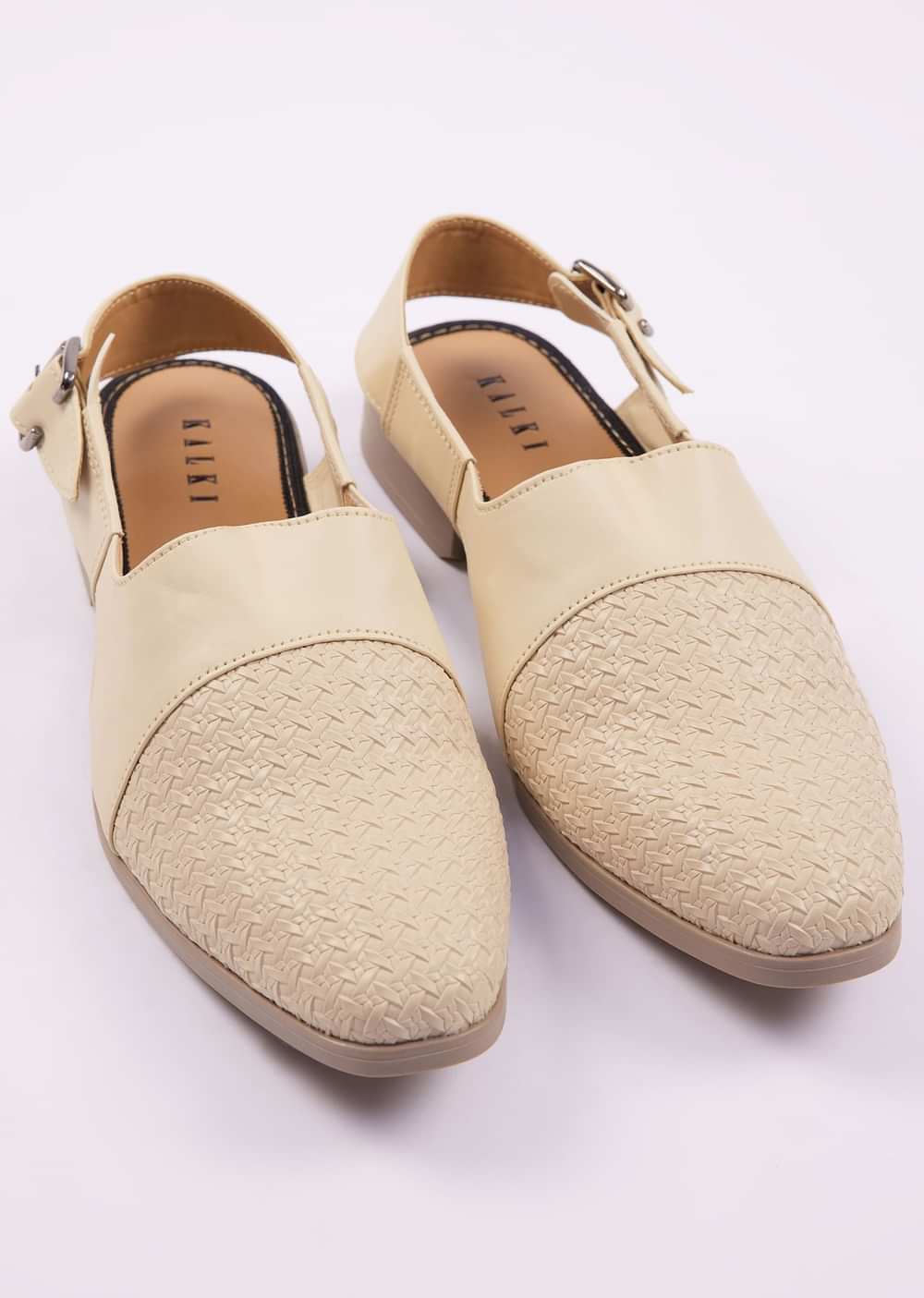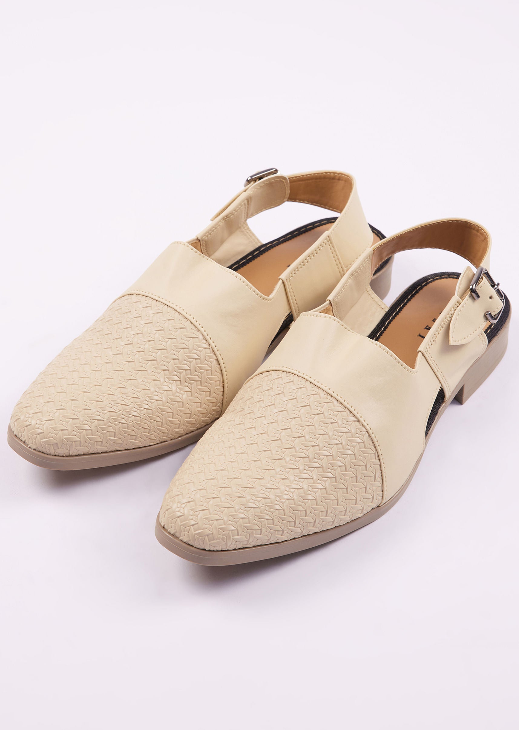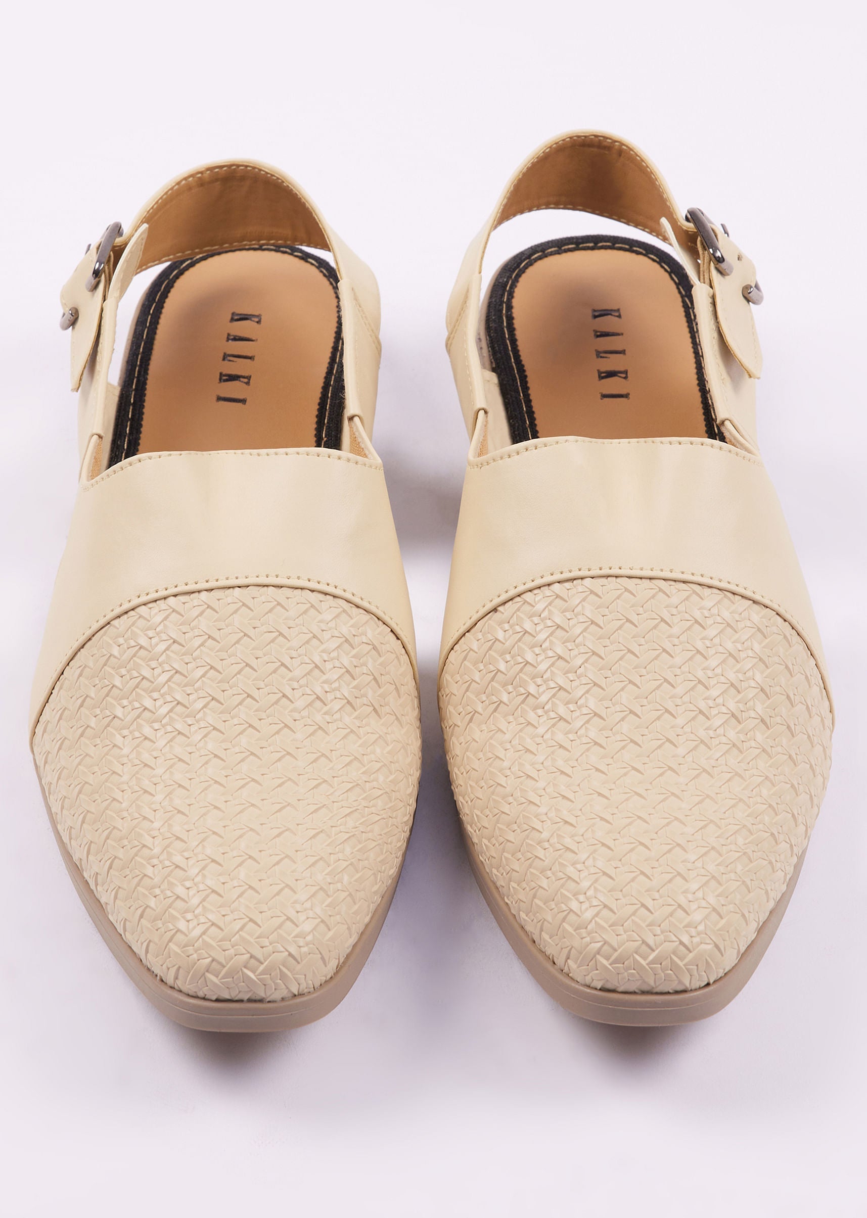 - These beige ethnic juttis blend elegance and comfort with their woven textured detailing and modern buckle strap design.