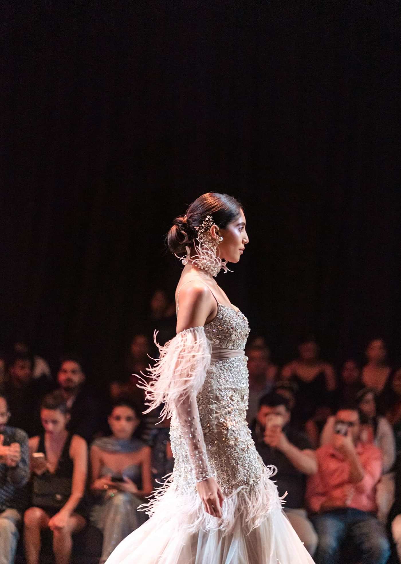 Beige Fish-Cut Gown With 3D Feathers And Floral Motif Embroidery
