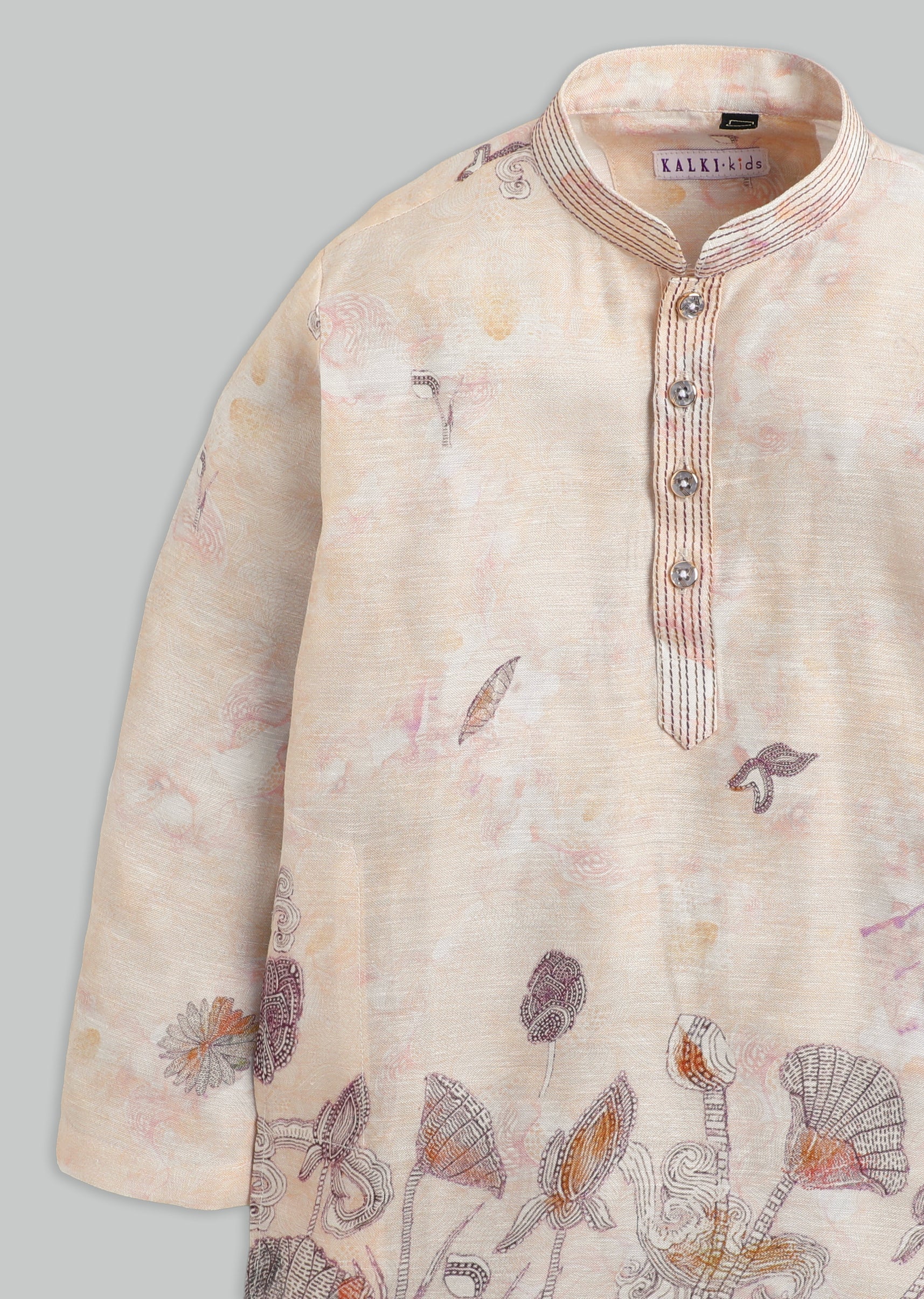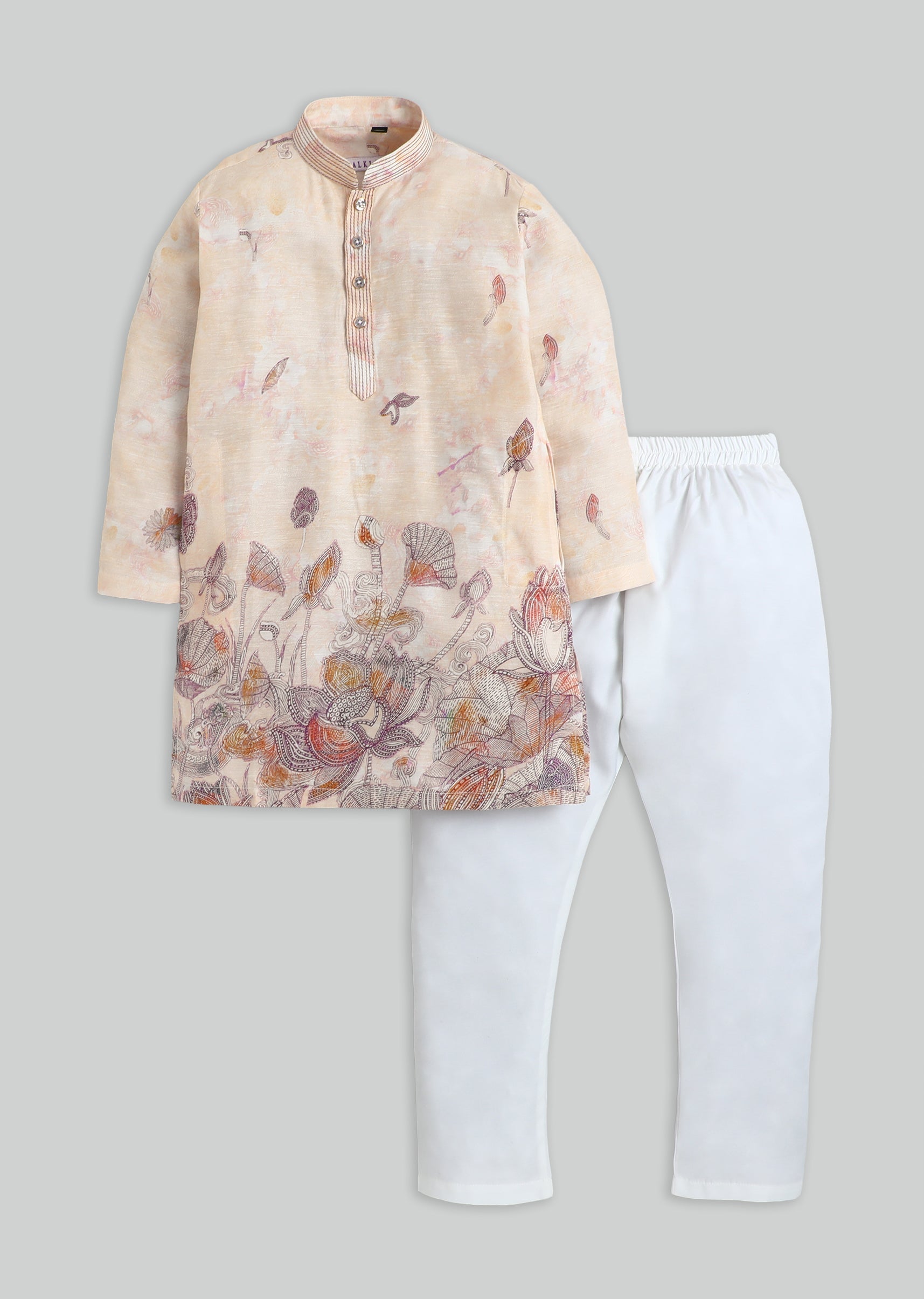 A pastel beige silk kurta set featuring floral print detailing, finished with a mandarin collar and front buttons. Comes with matching pants—perfect for daytime festivities. Awarded as the Most Trusted Brand, we're delivering styles you love, just as promised.