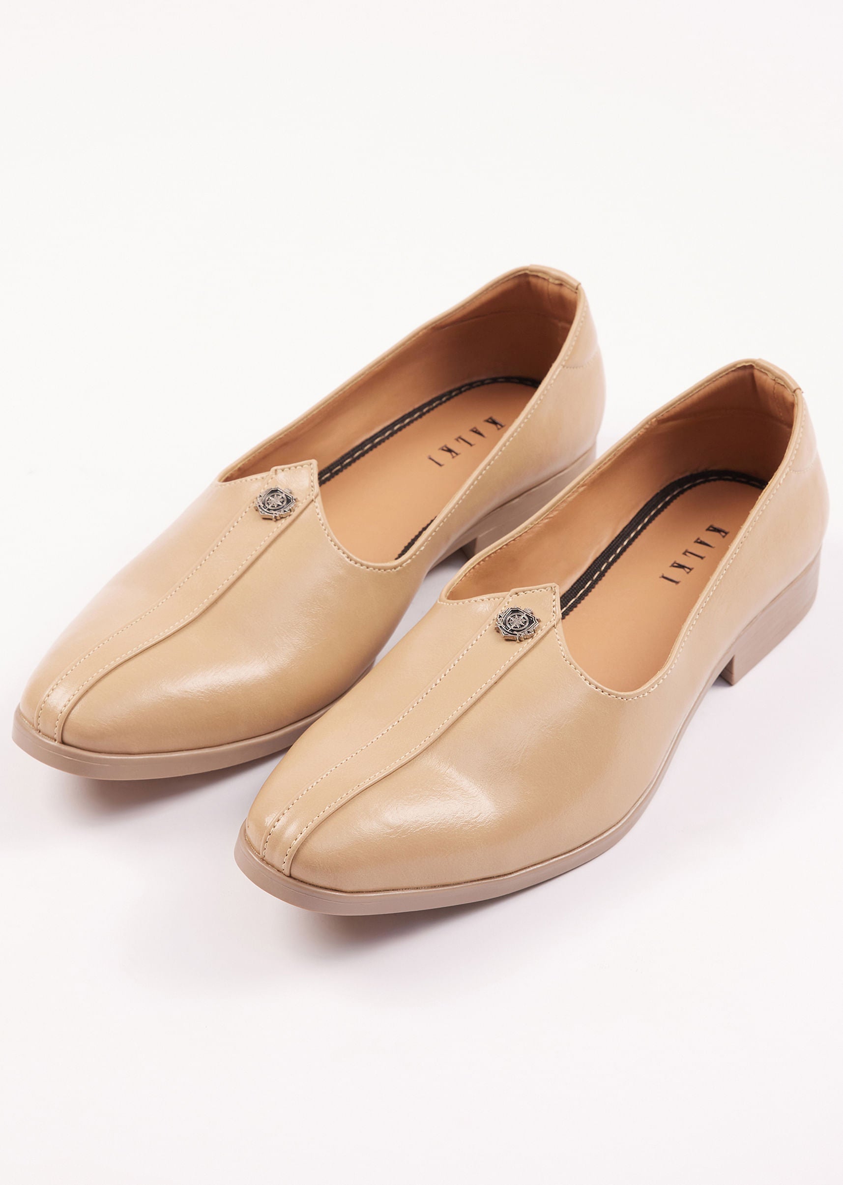 - These beige juttis radiate refined sophistication with their polished finish and minimalistic metal detailing.