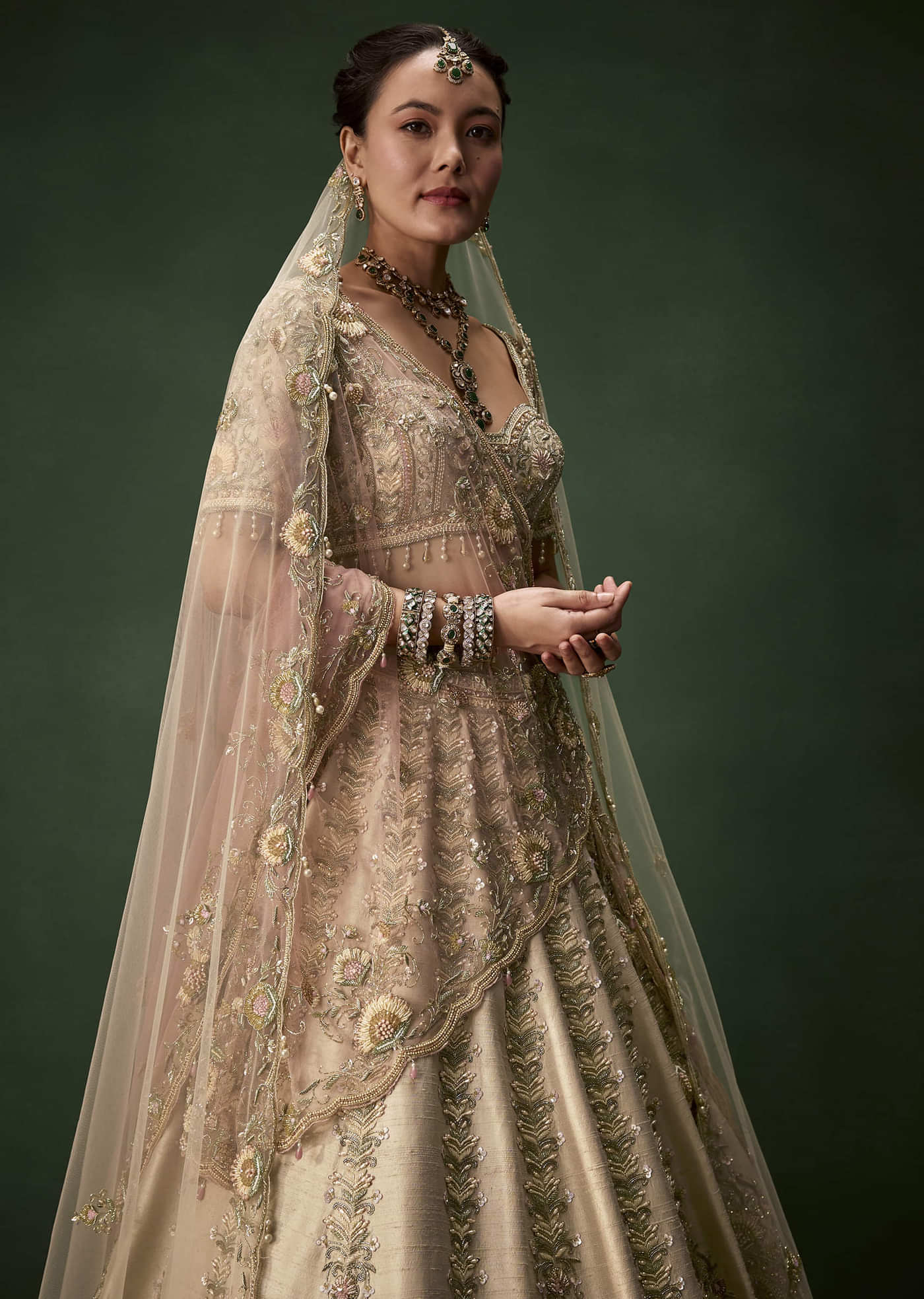 Elevate the look with layered polki jewellery and a delicate maang tikka to highlight the bridal opulence of the ensemble.