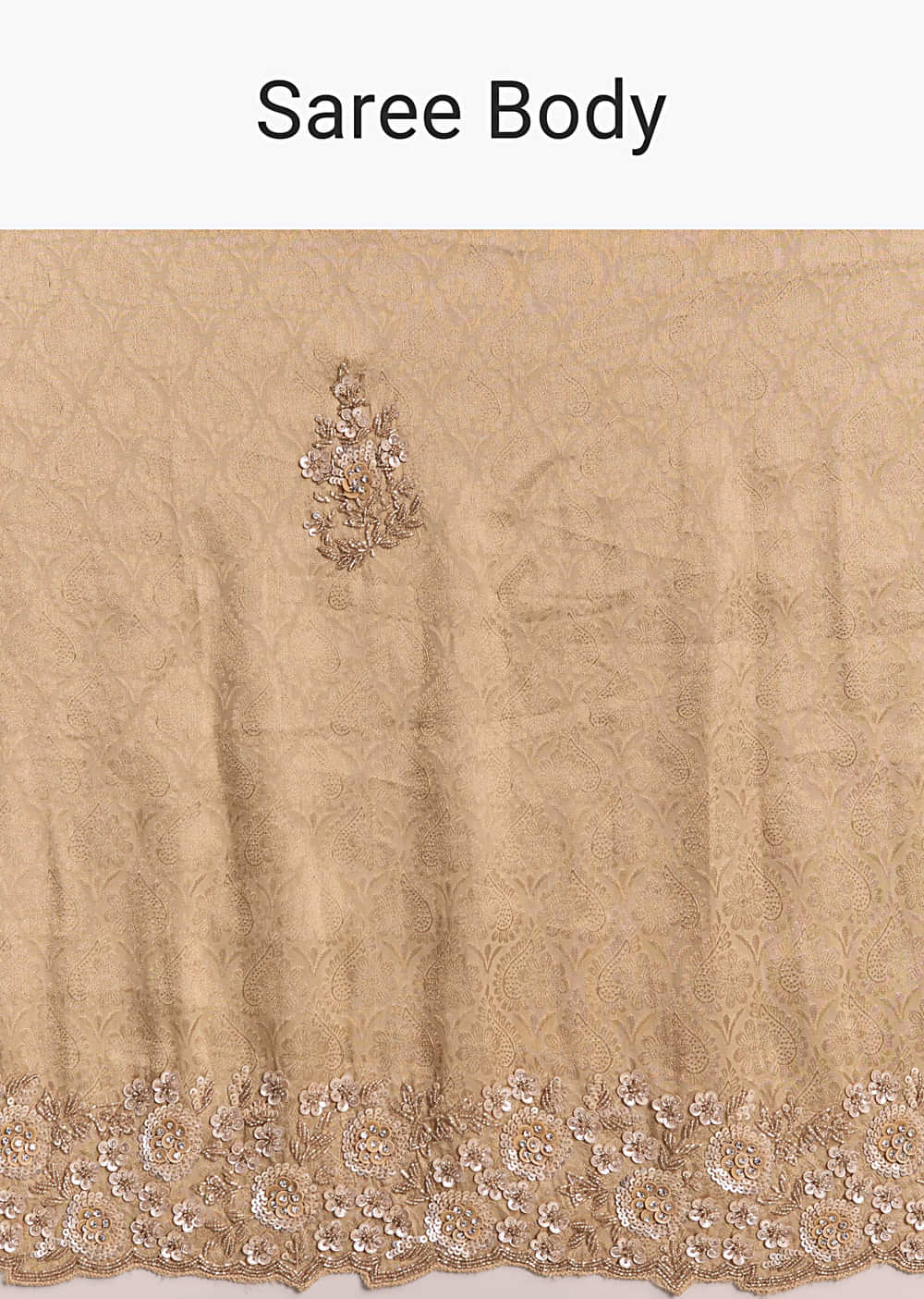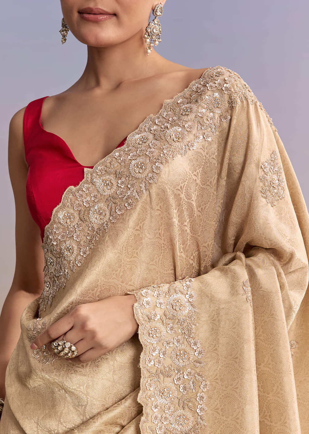 Beige Gold Jacquard Saree With Cutwork Floral Embroidery