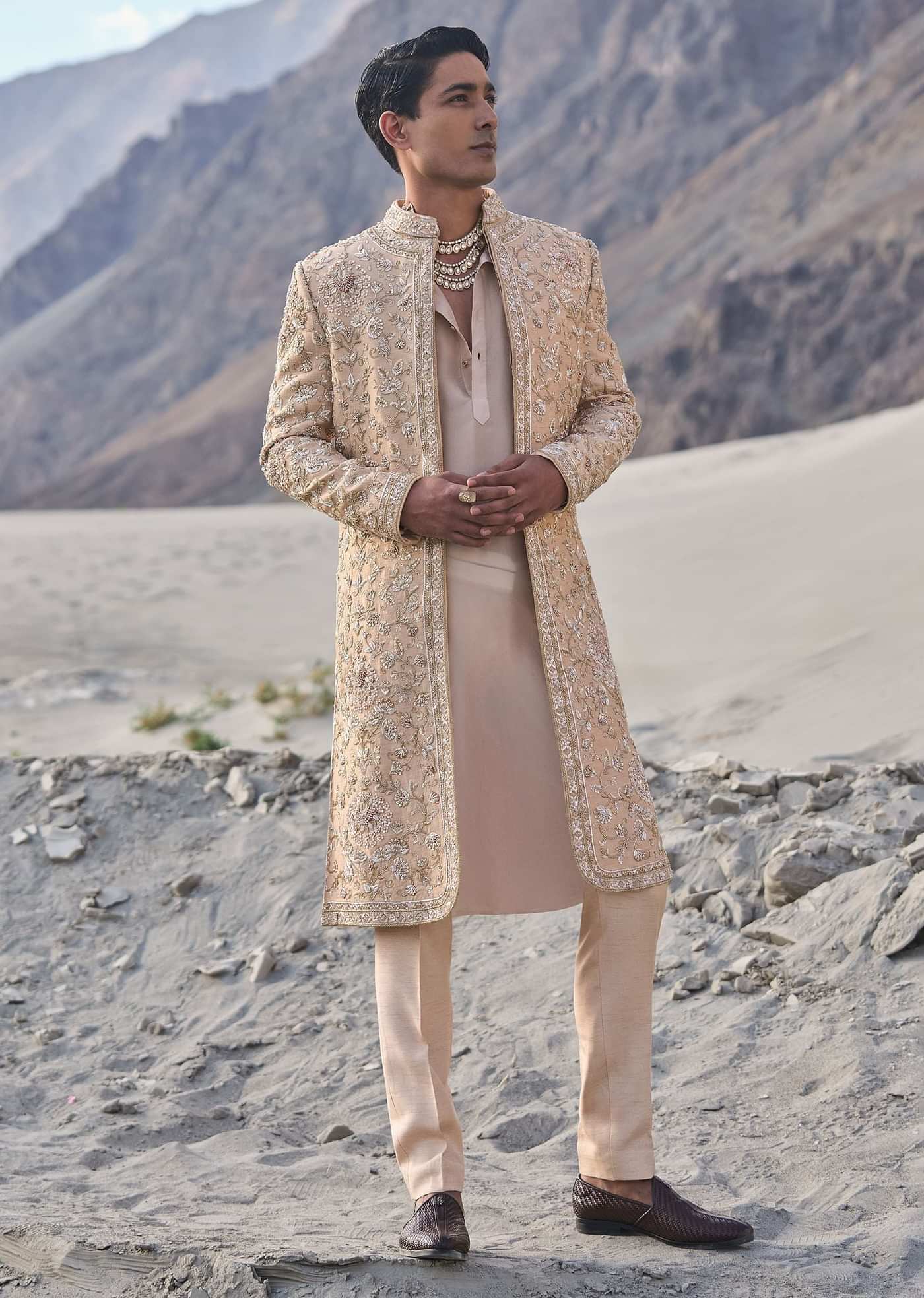 Beige Gold Zardosi Sherwani Set With Stole Dupatta