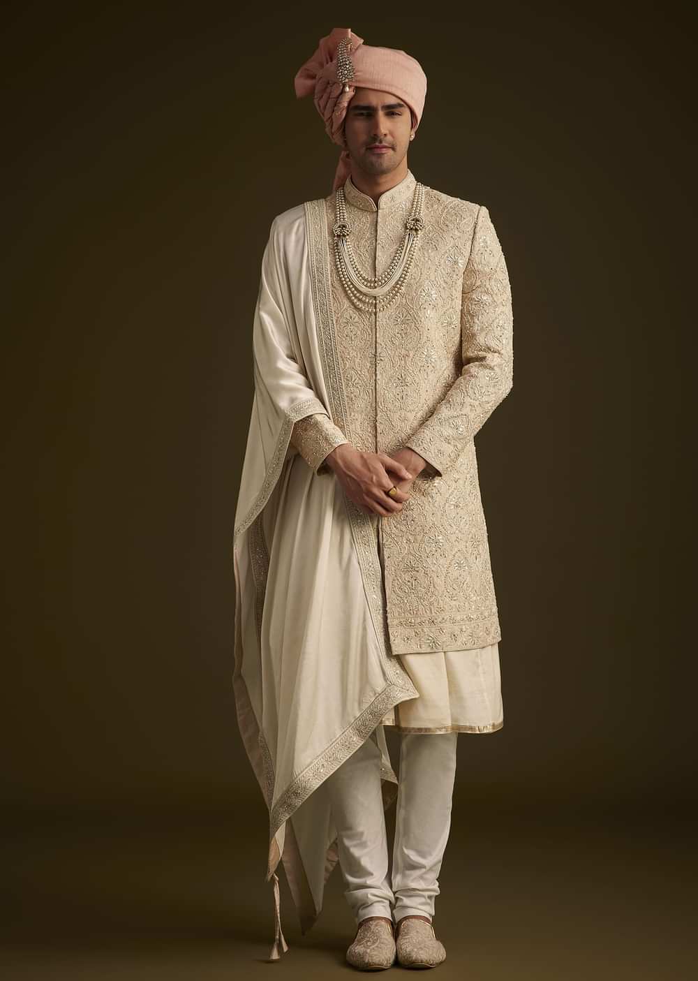 Pair this sherwani with cream churidar trousers and embroidered mojaris to elevate the look. Complete the outfit with a statement pearl mala and a sleek pocket square for a polished, regal vibe.