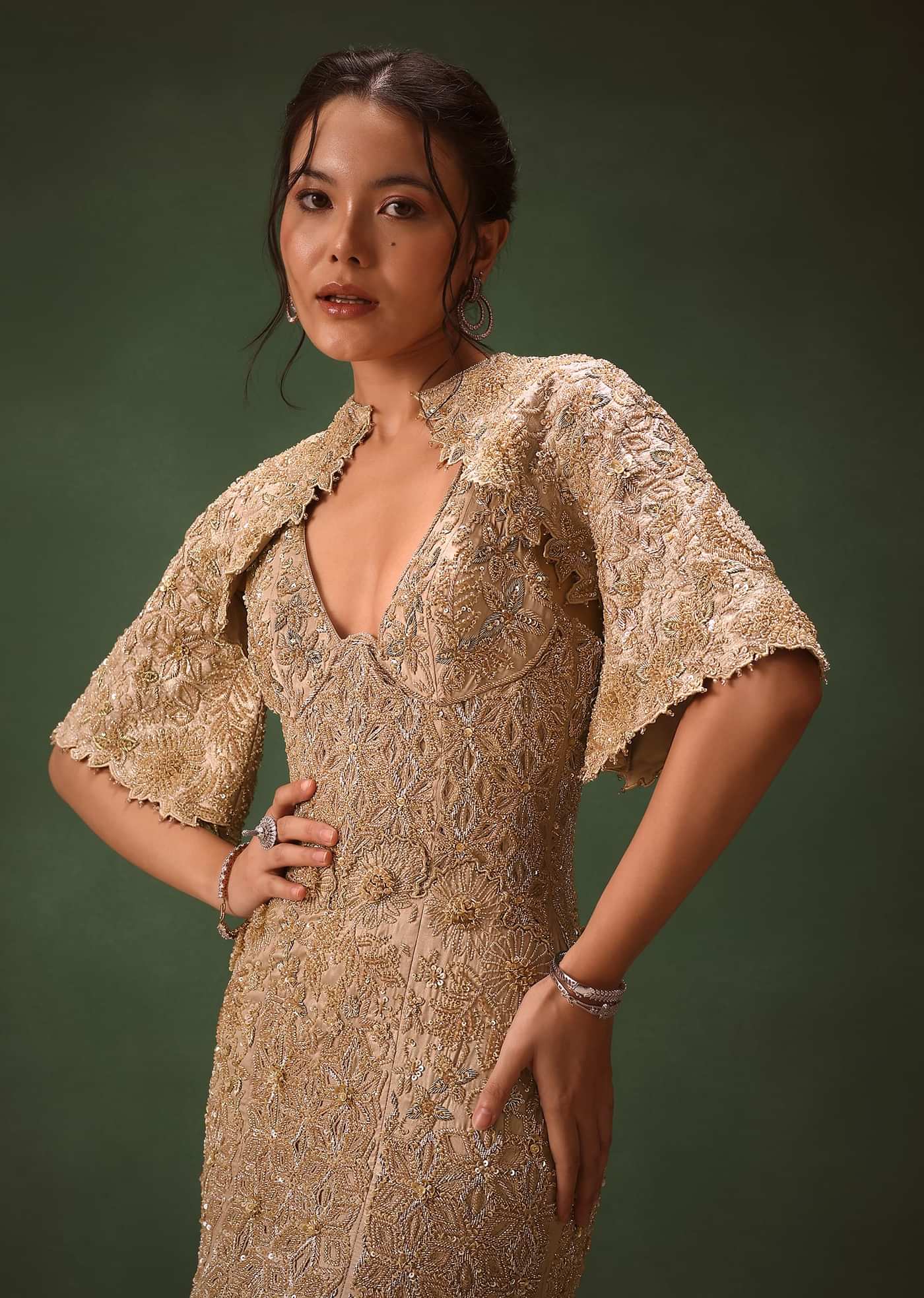 Embrace glamour with our beige heavy embroidered sleeveless gown artfully complemented by a beautifully tailored jacket.The tone to tone hand embroidery with sequins and cutdana creates a stunning look enhancing... More Product Details