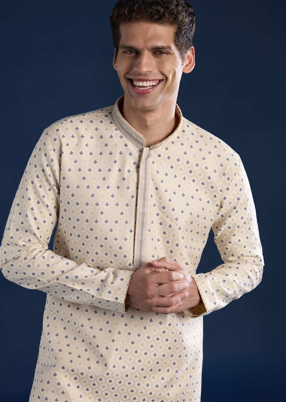Fit Tips:Opt for a tailored fit through the shoulders and chest to enhance the kurta’s structured silhouette and woven detailing.
