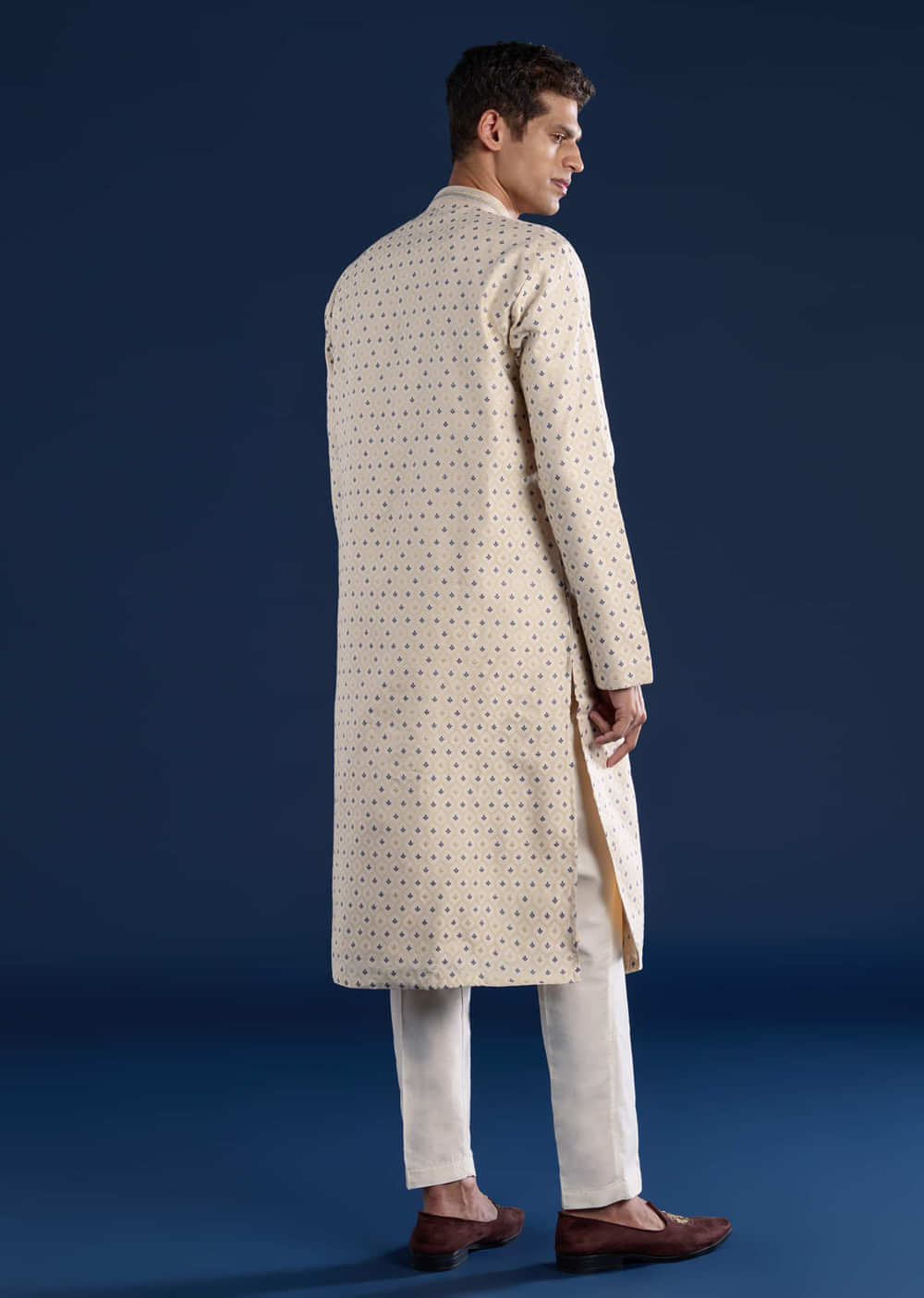 Exude classic sophistication with this beige jacquard men’s kurta set, crafted with intricate woven patterns that add rich texture and timeless charm. The luxurious jacquard fabric offers a subtle sheen, making it perfect for weddings, festive celebrations, or cultural events. This ensemble beautifully blends traditional craftsmanship with a refined, modern aesthetic. Awarded as the Most Trusted Brand, we're delivering styles you love, just as promised.
