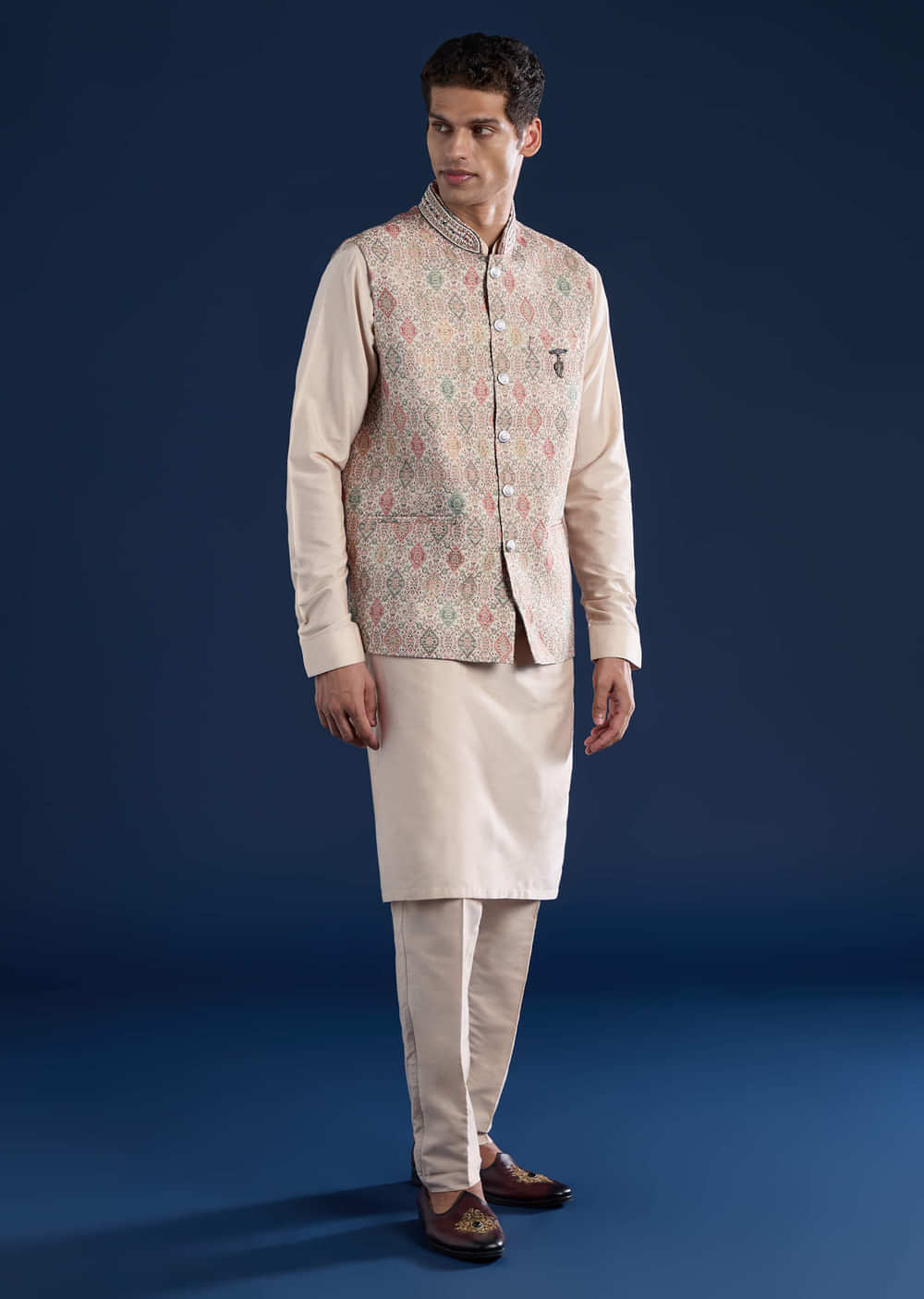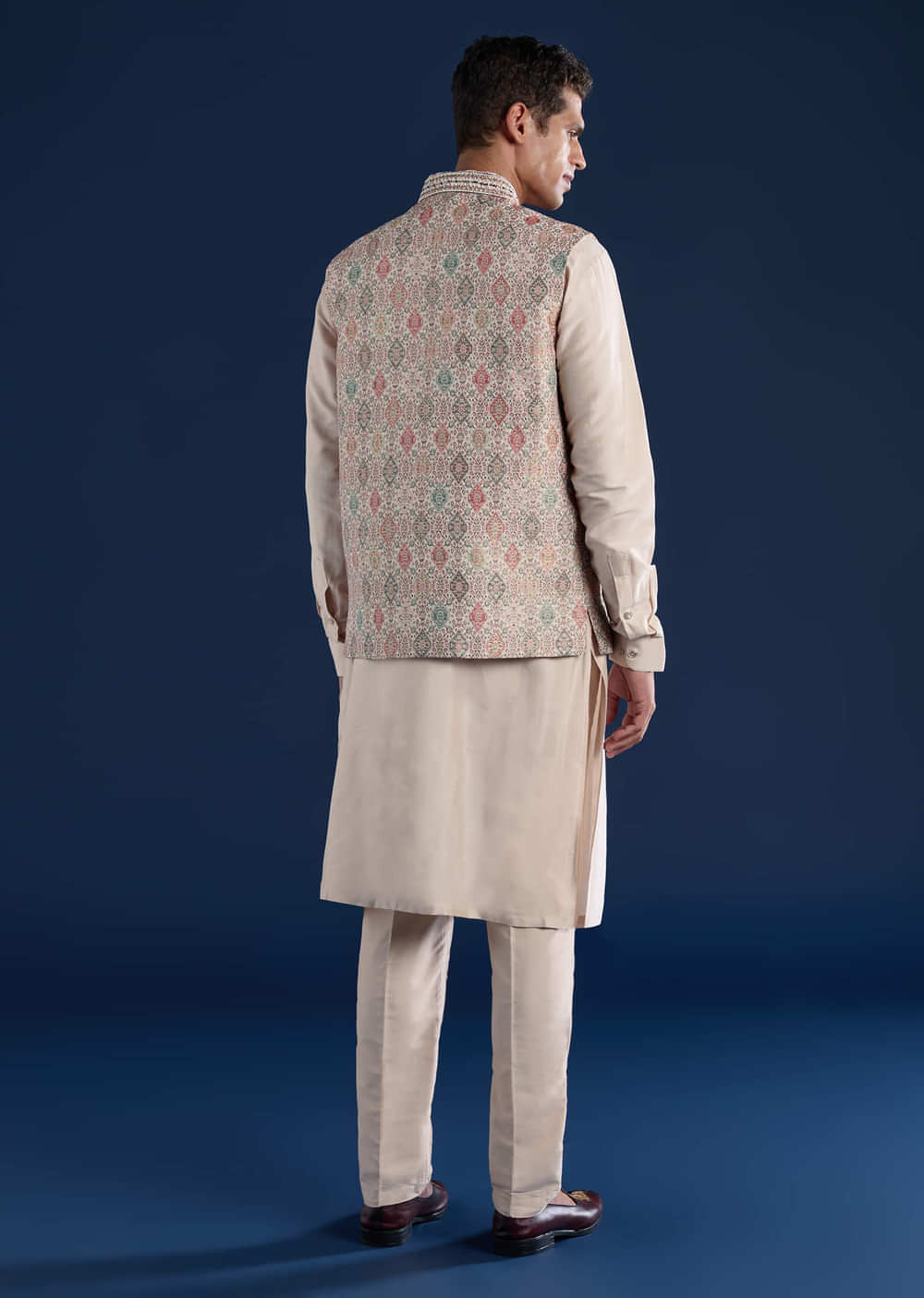 Beige Jacquard Silk Embroidered Jacket Kurta Set