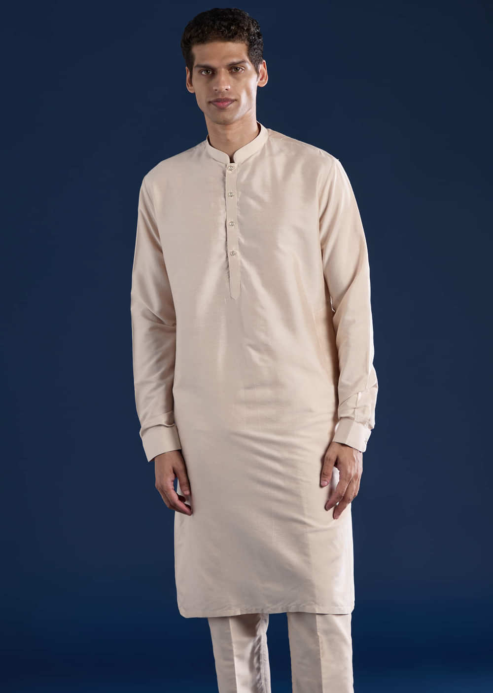 Epitomizing understated elegance, this beige jacquard silk jacket and kurta set showcases a refined play of texture and craftsmanship. The subtle embroidery enhances the jacquard weave, creating a luxurious yet... More Product Details