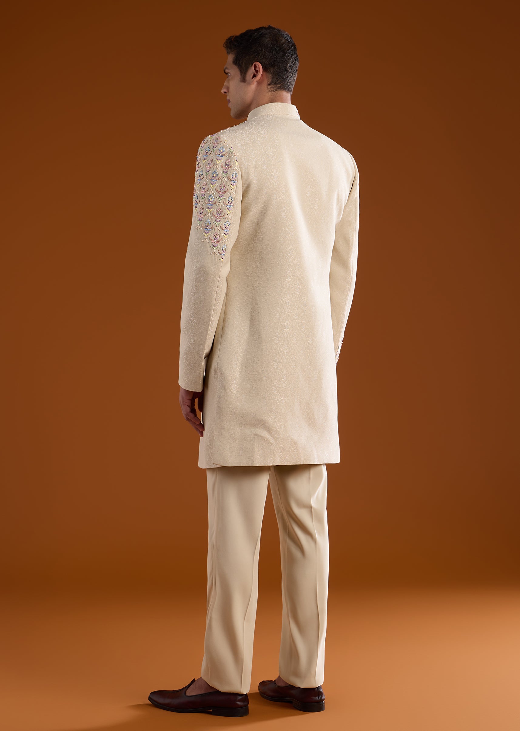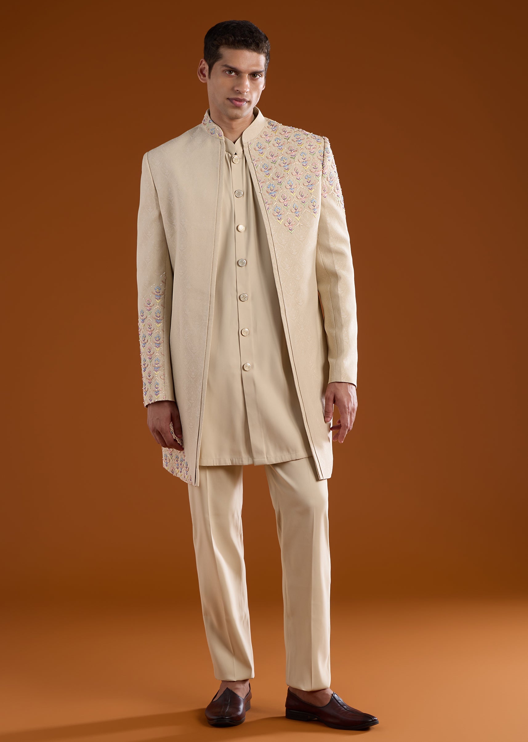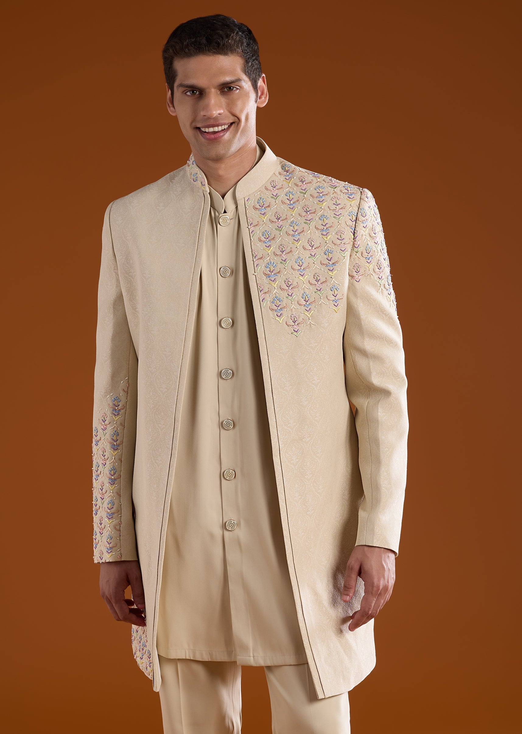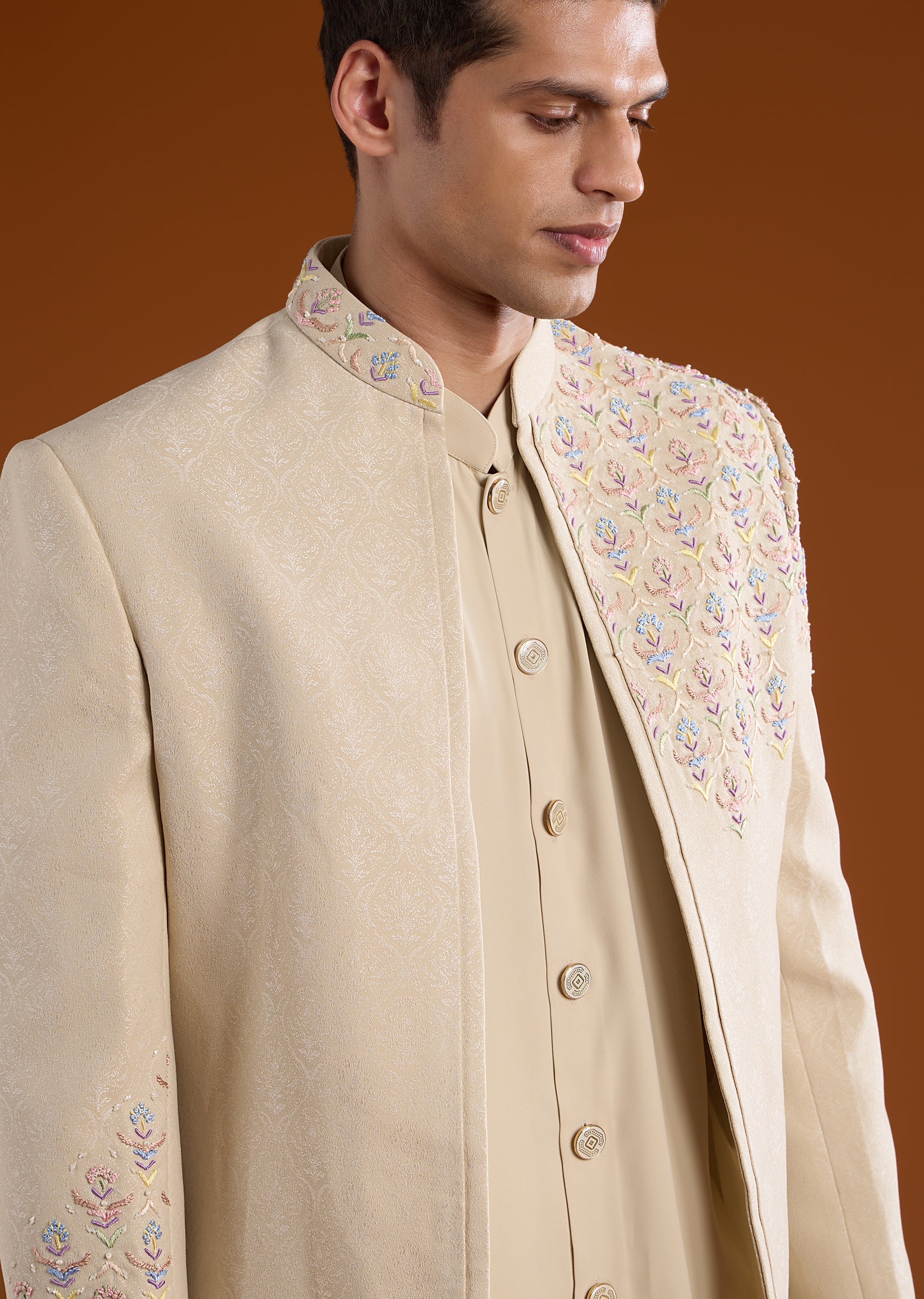 Beige Jacquard Silk Indowestern Embroidered Kurta Set