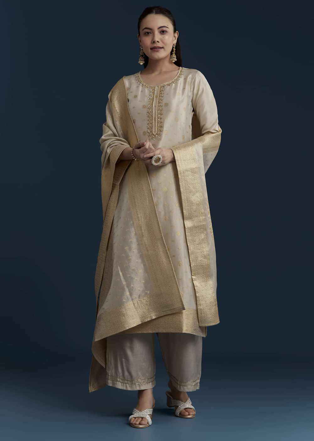 Beige Jacquard Weave Tissue Kurta Palazzo Set