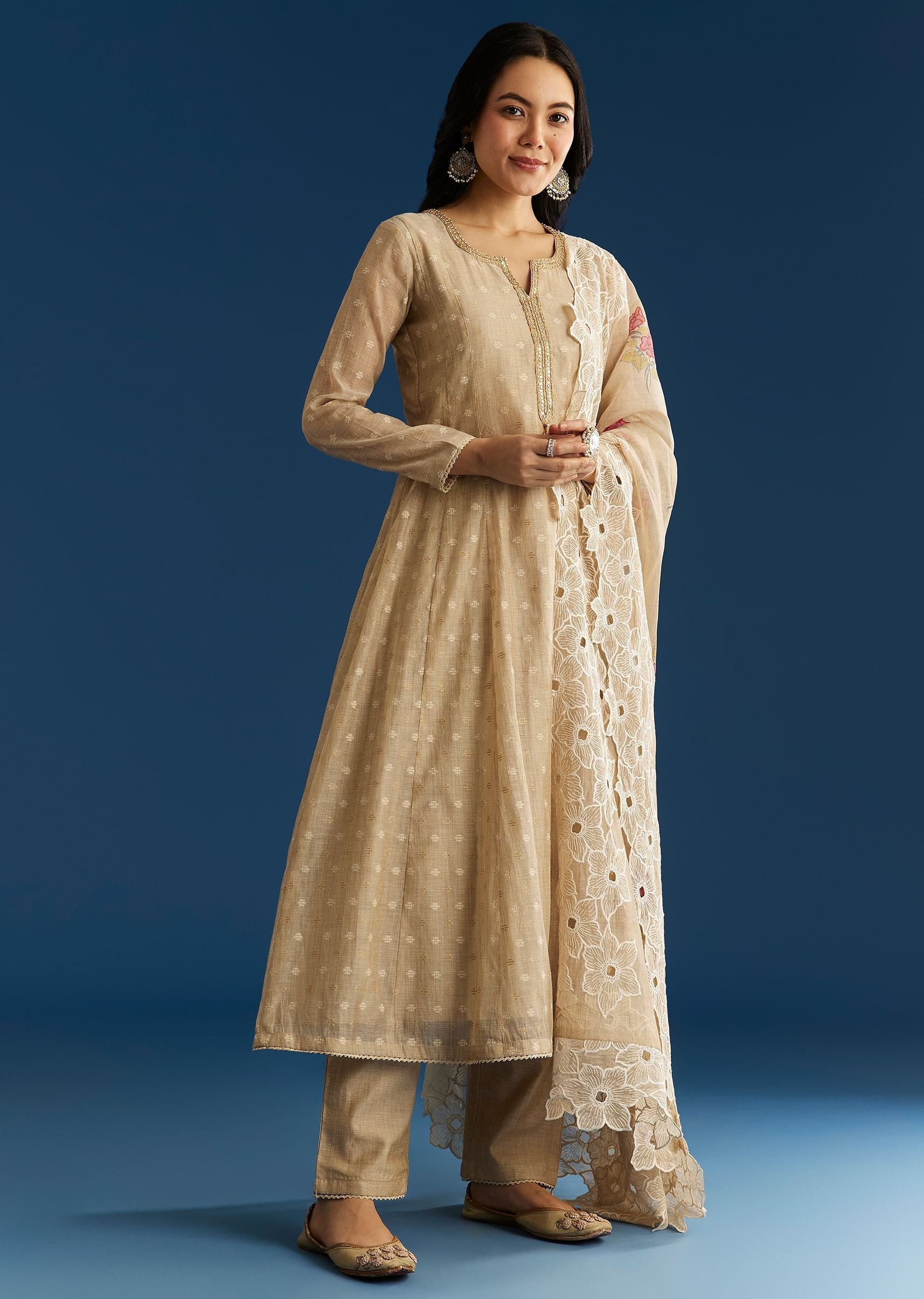 Beige Jamdani Butti Anarkali With Cutwork Dupatta