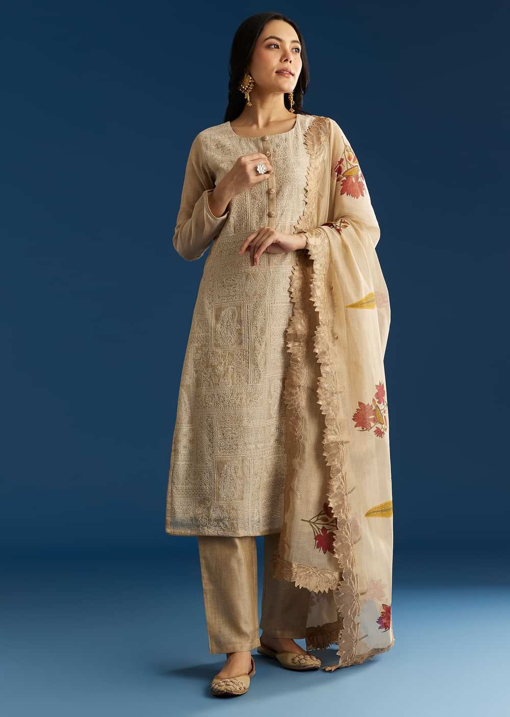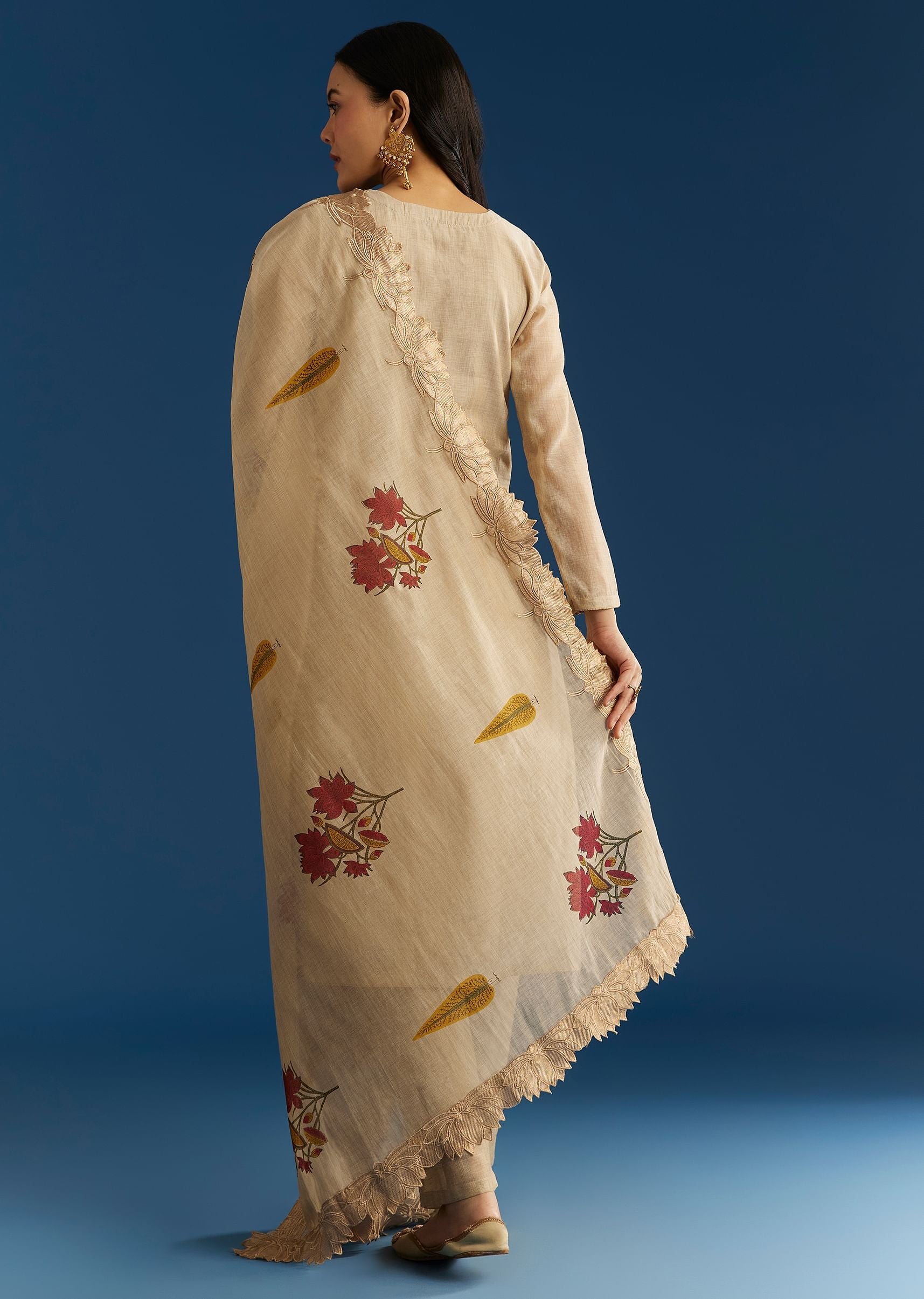 Beige Jamdani Cotton Kurta Set With Thread Work And Block Print Dupatta