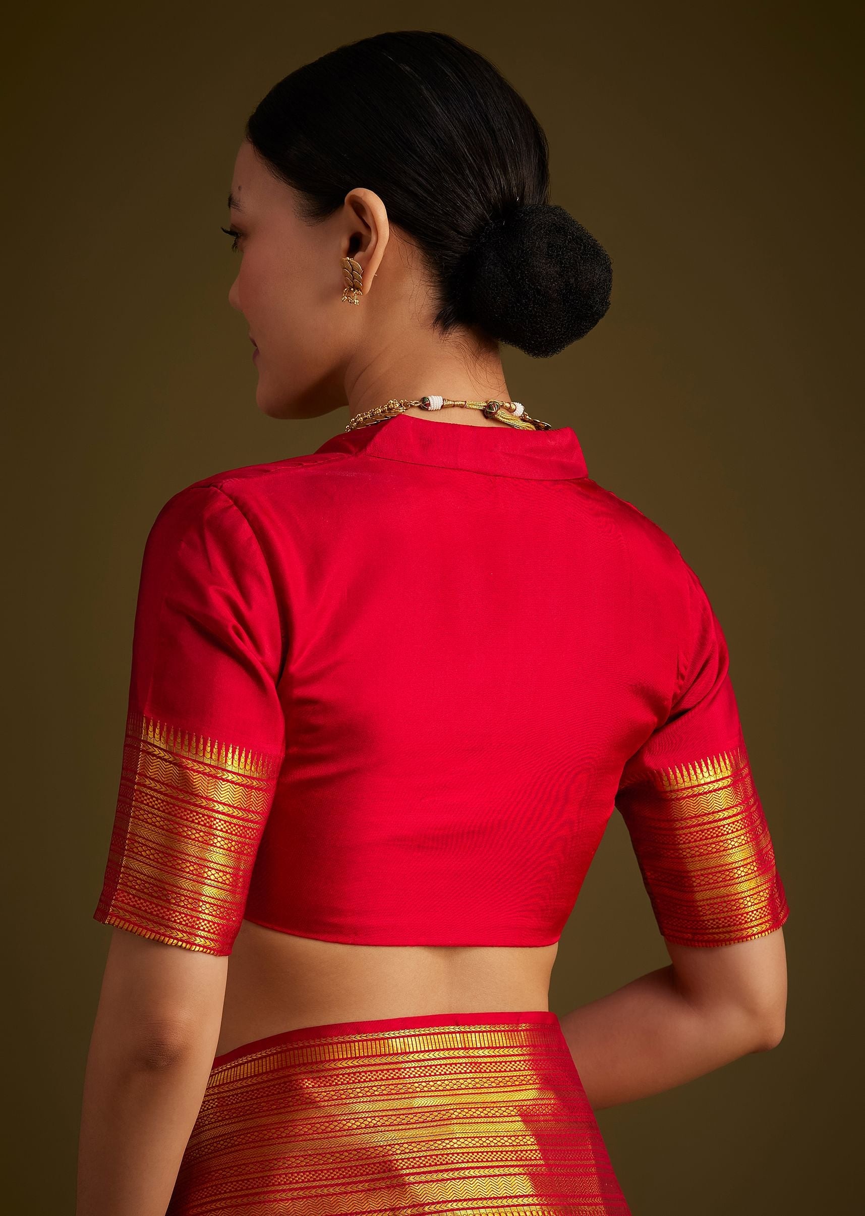 Pair it with a gold temple necklace jhumkas and a traditional bun adorned with fresh flowers for an authentic festive look.