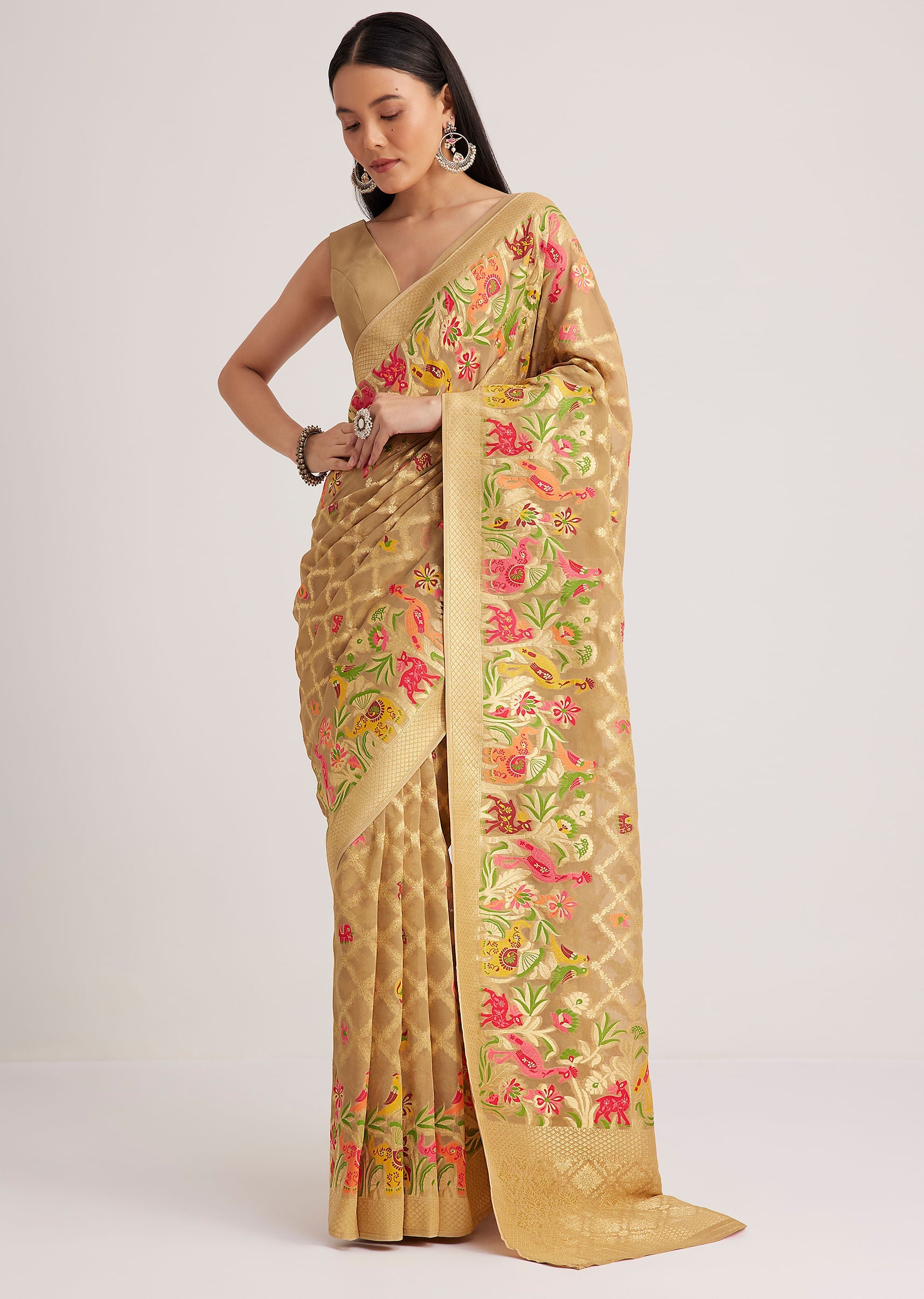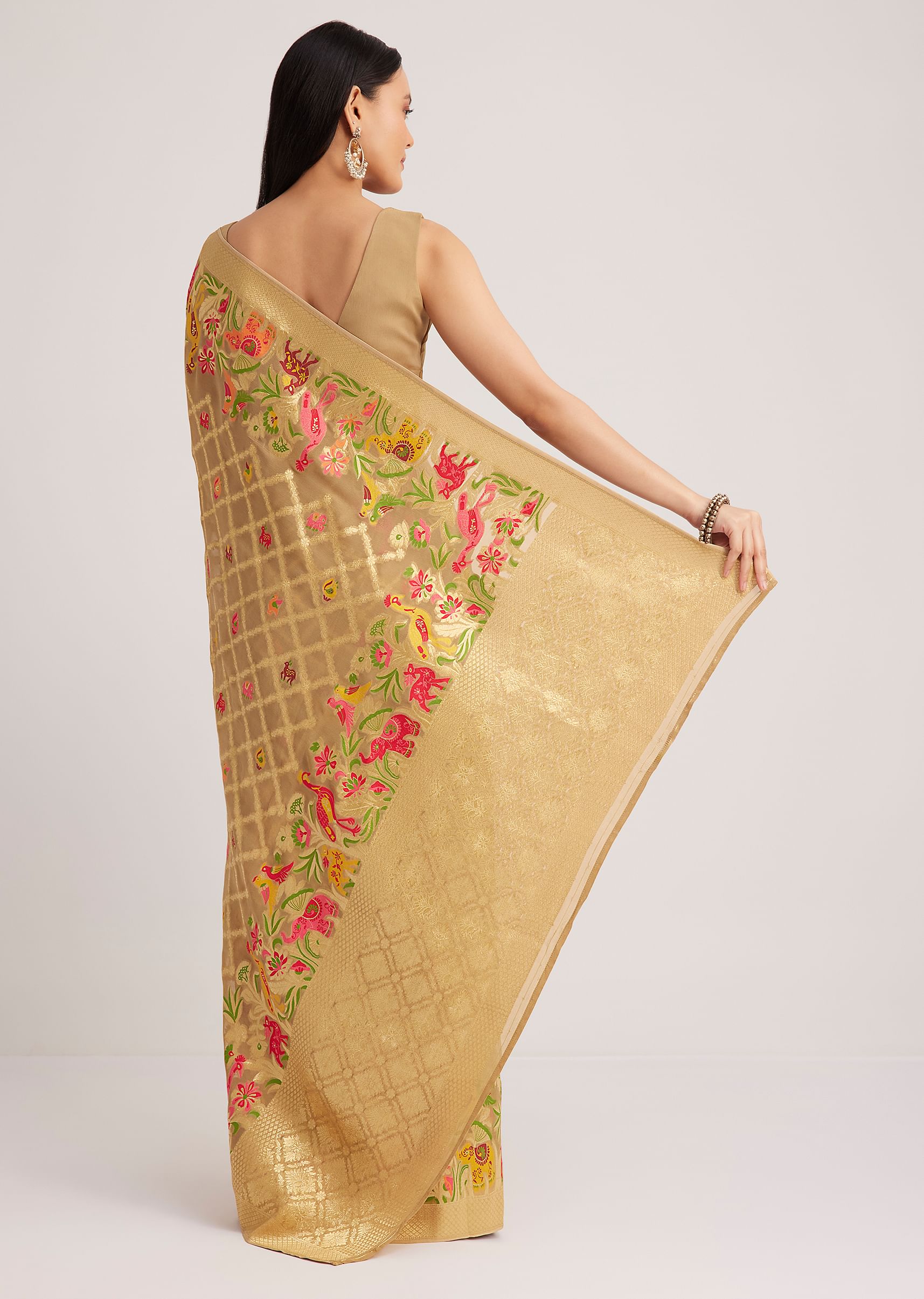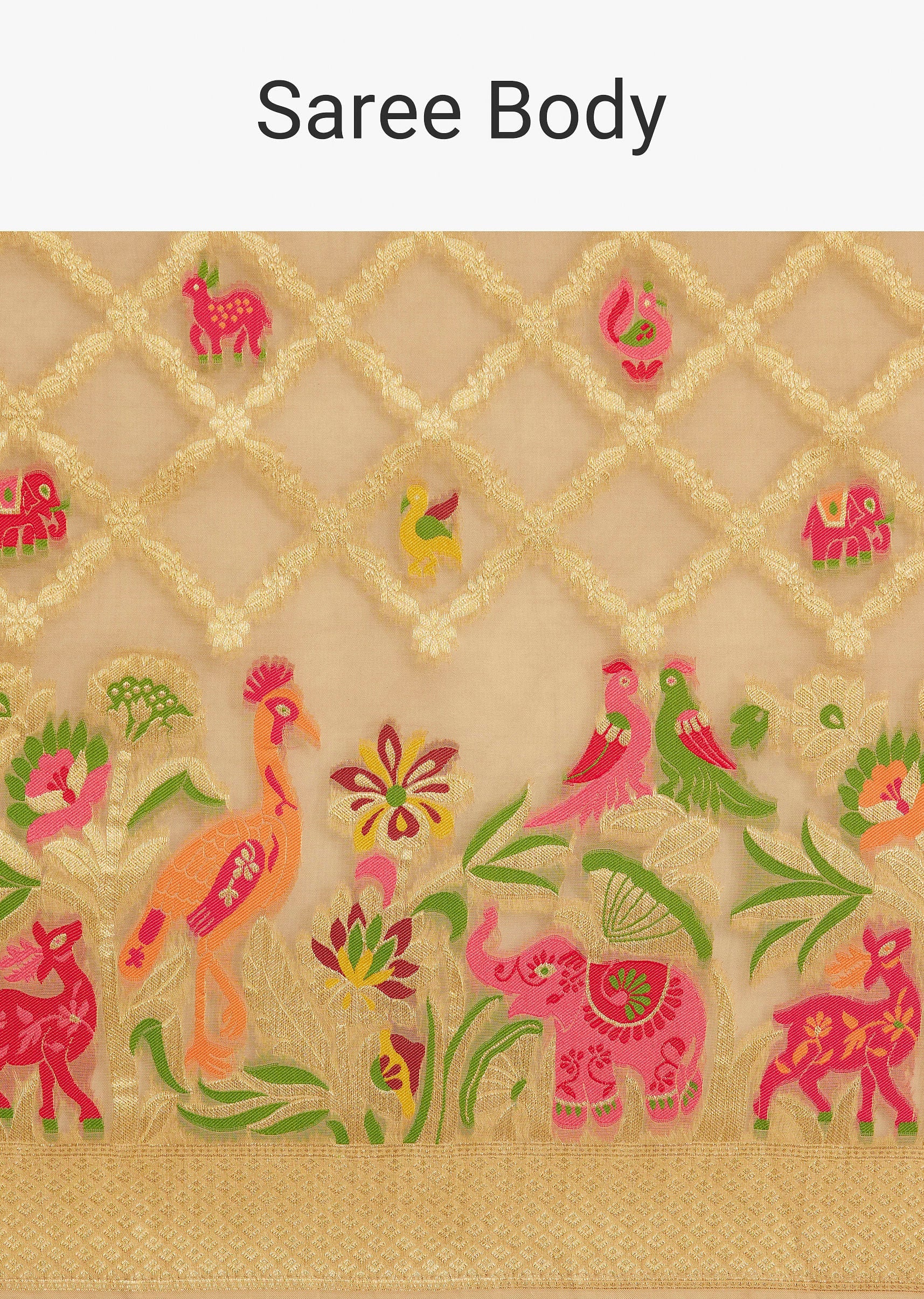 Beige Khaddi Georgette Jaal Work Saree With Animal Bird Motifs