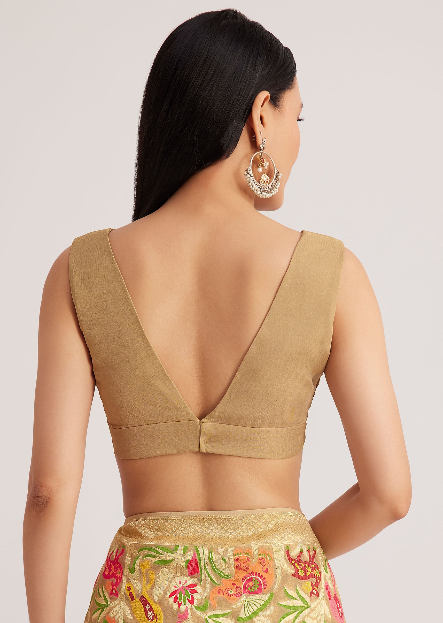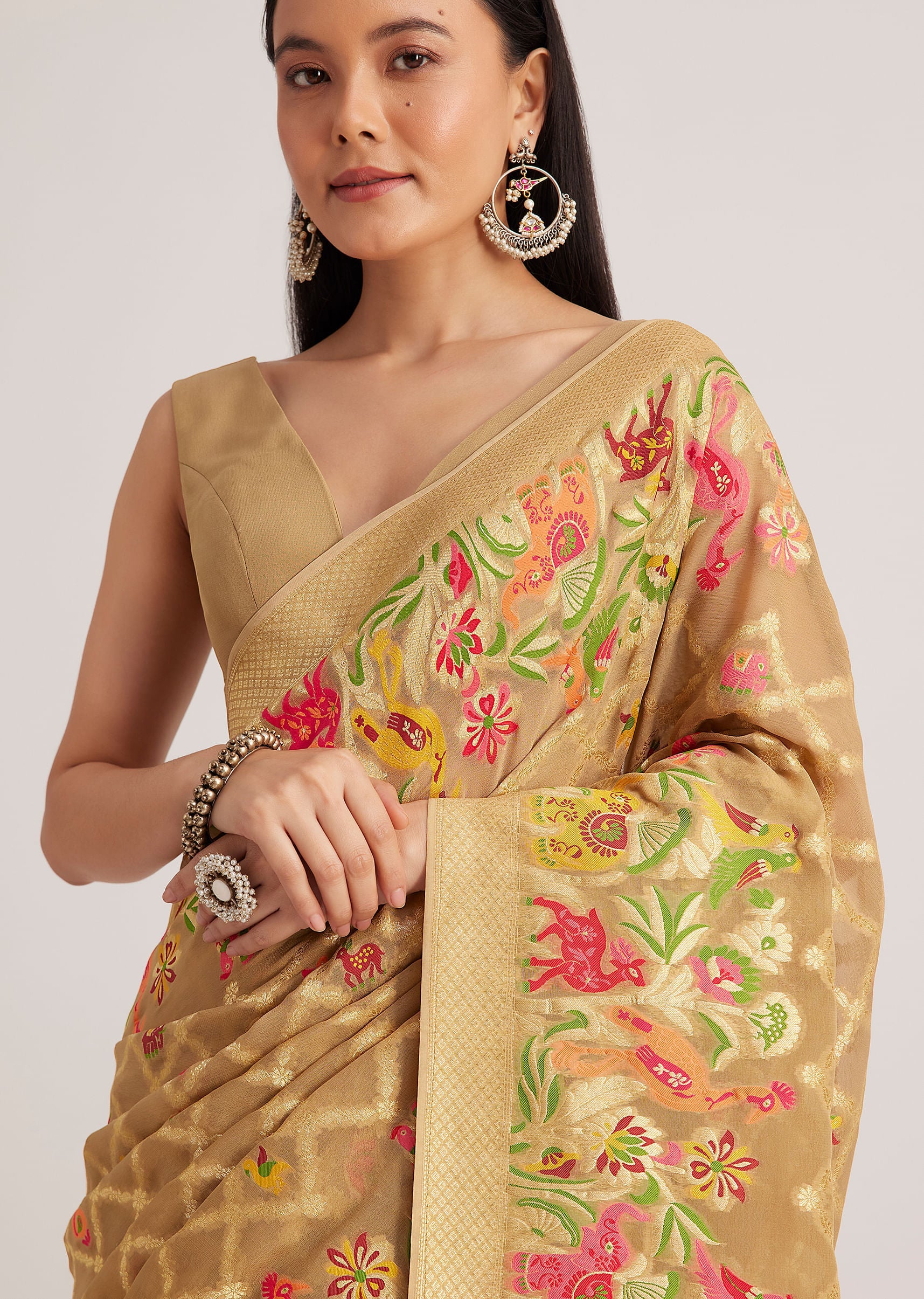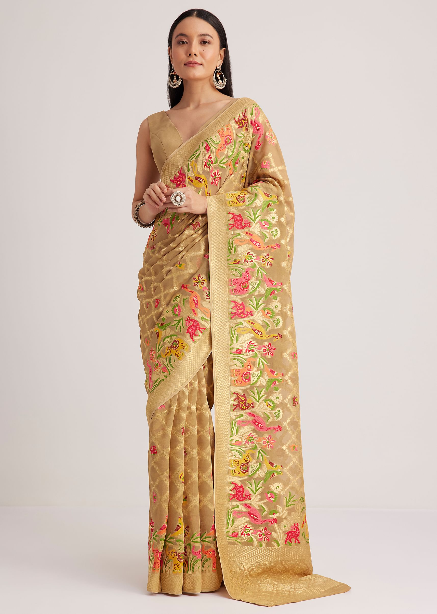 Beige Khaddi Georgette Jaal Work Saree With Animal Bird Motifs