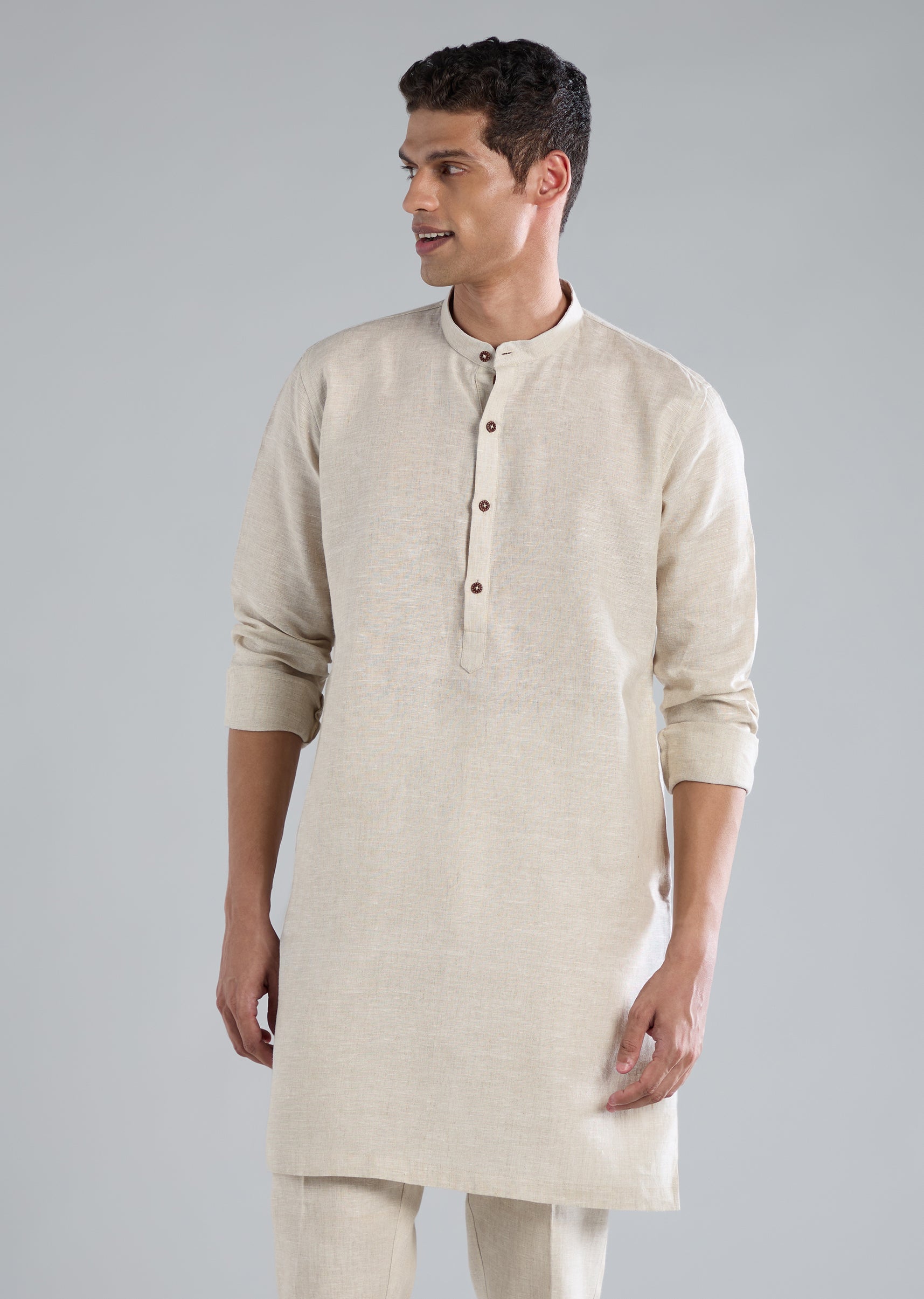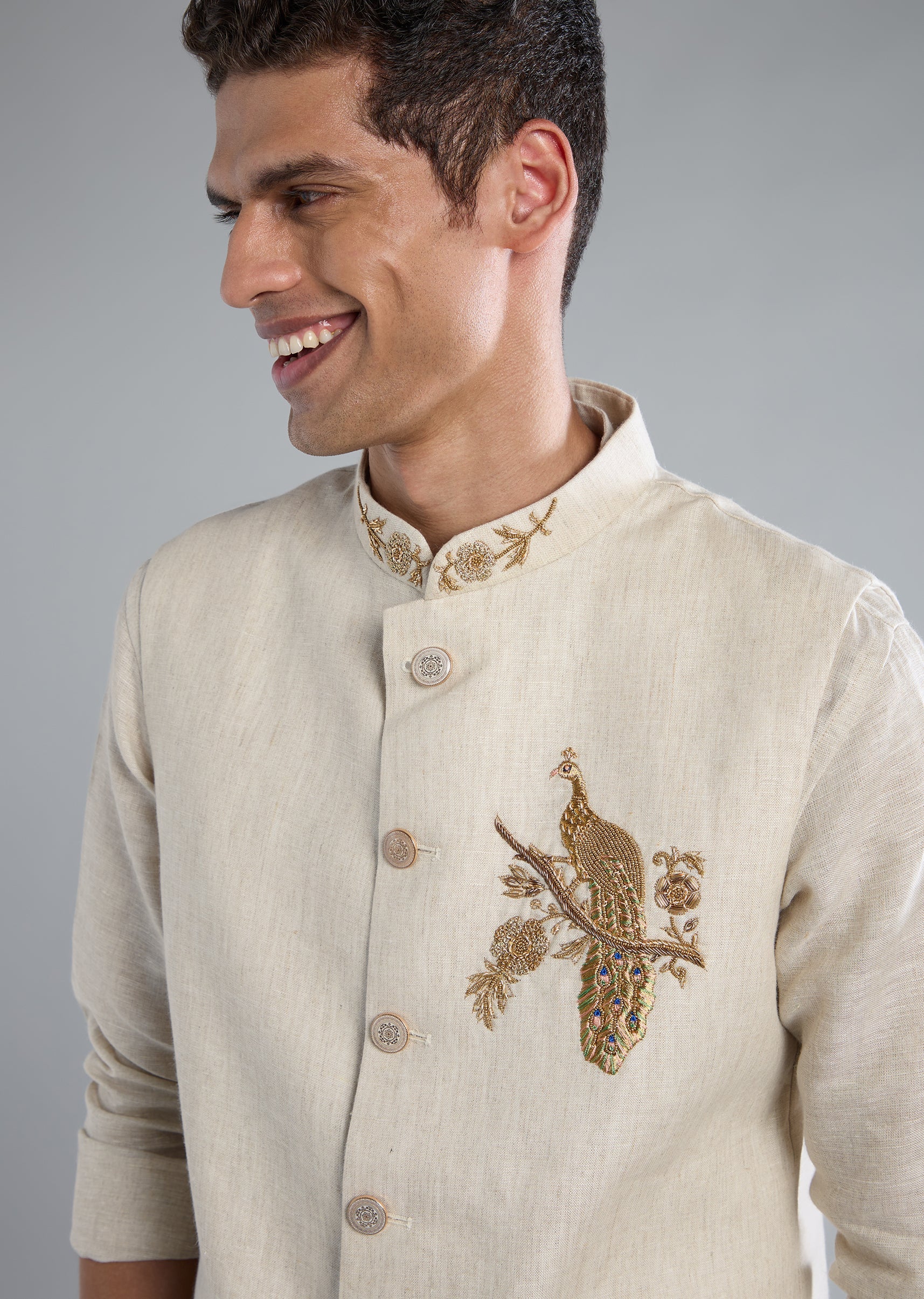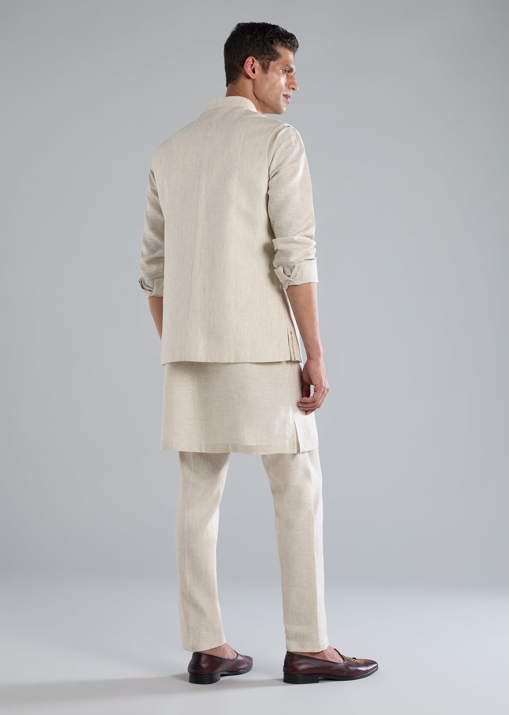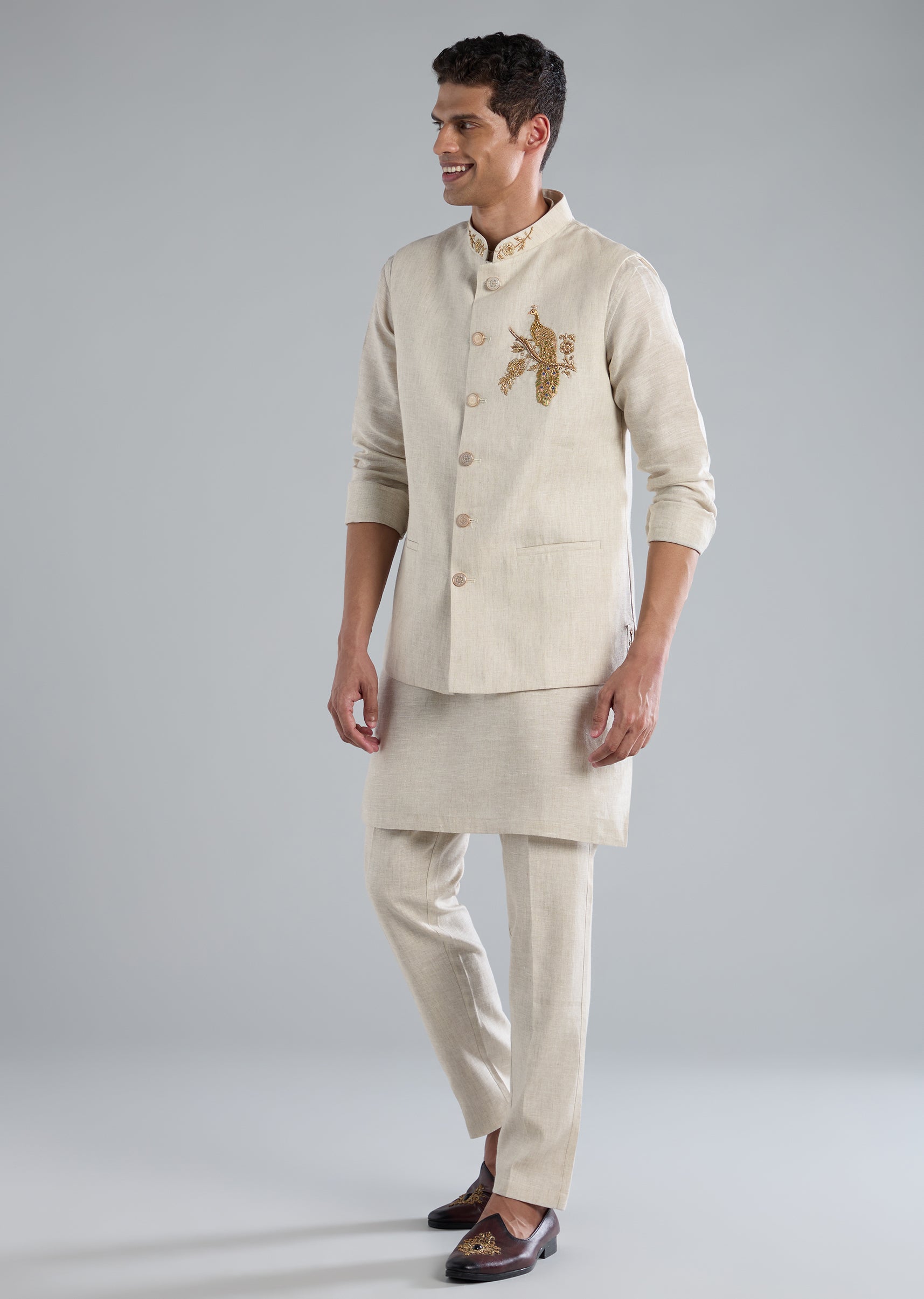 A refined beige kurta jacket set crafted in pure linen, elevated with intricate zardosi hand work. Designed for festive celebrations, receptions, and wedding guest looks, this set features full sleeves, a mandarin collar, front button closure on the jacket, and a front hook-eye closure on the pants. Includes jacket, kurta, and pants. Awarded as the Most Trusted Brand, we're delivering styles you love, just as promised.