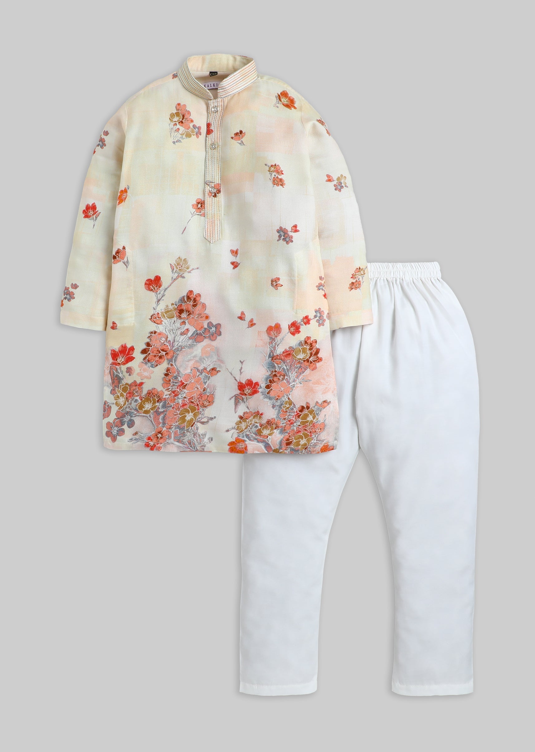 A classic beige silk kurta set with floral print detailing, finished with a mandarin collar, 3/4th sleeves, and front buttons. Includes matching pants—great for festive occasions. Awarded as the Most Trusted Brand, we're delivering styles you love, just as promised.