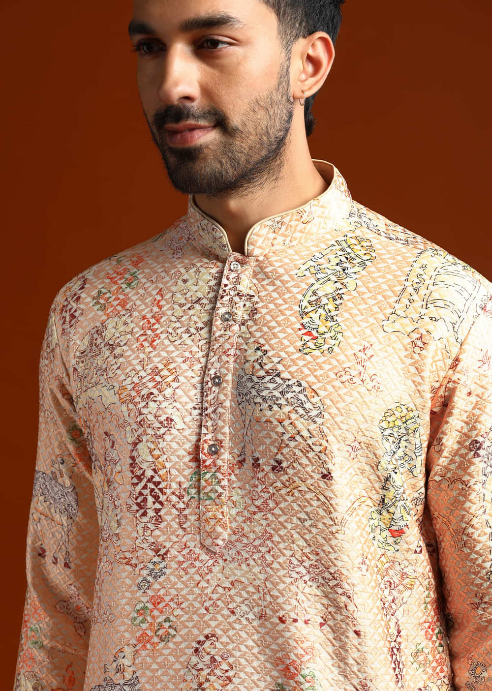 Beige Kurta Set For Men With Print And Sequins Embroidery