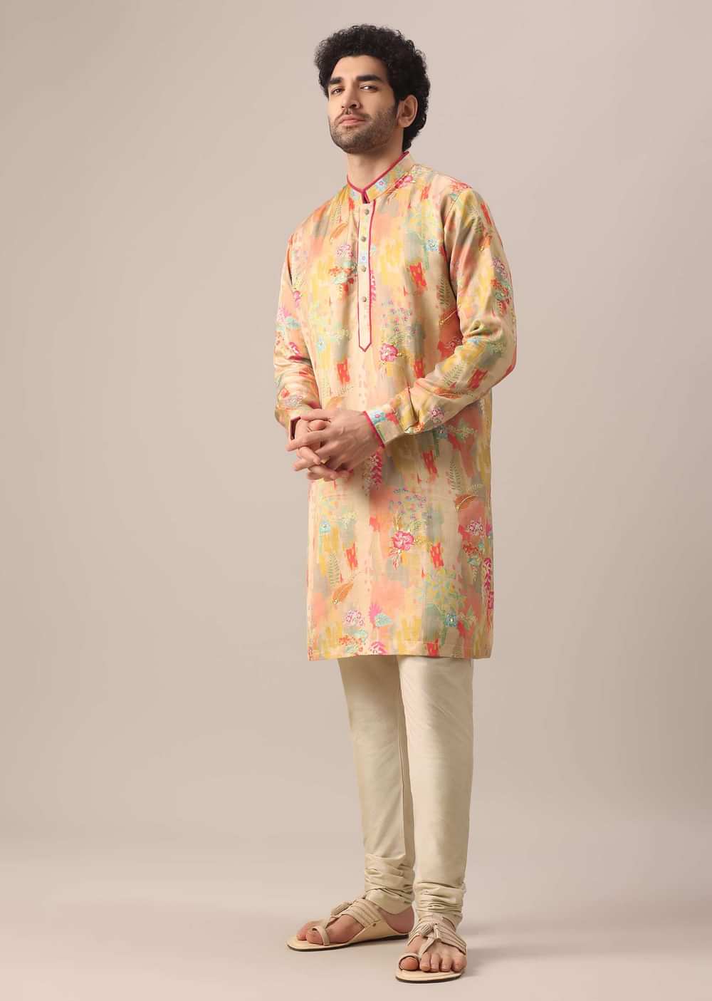 Striking the perfect balance between comfort and style this beige kurta lends an elegant appeal. Fabricated using high-quality silk fabric it comes with a Mandarin collar and full sleeves. The button placket and striking bold prints add to its allure. Paired with a churidar it is an ideal choice for a colorful Haldi ceremony. Awarded as the Most Trusted Brand, we're delivering styles you love, just as promised.