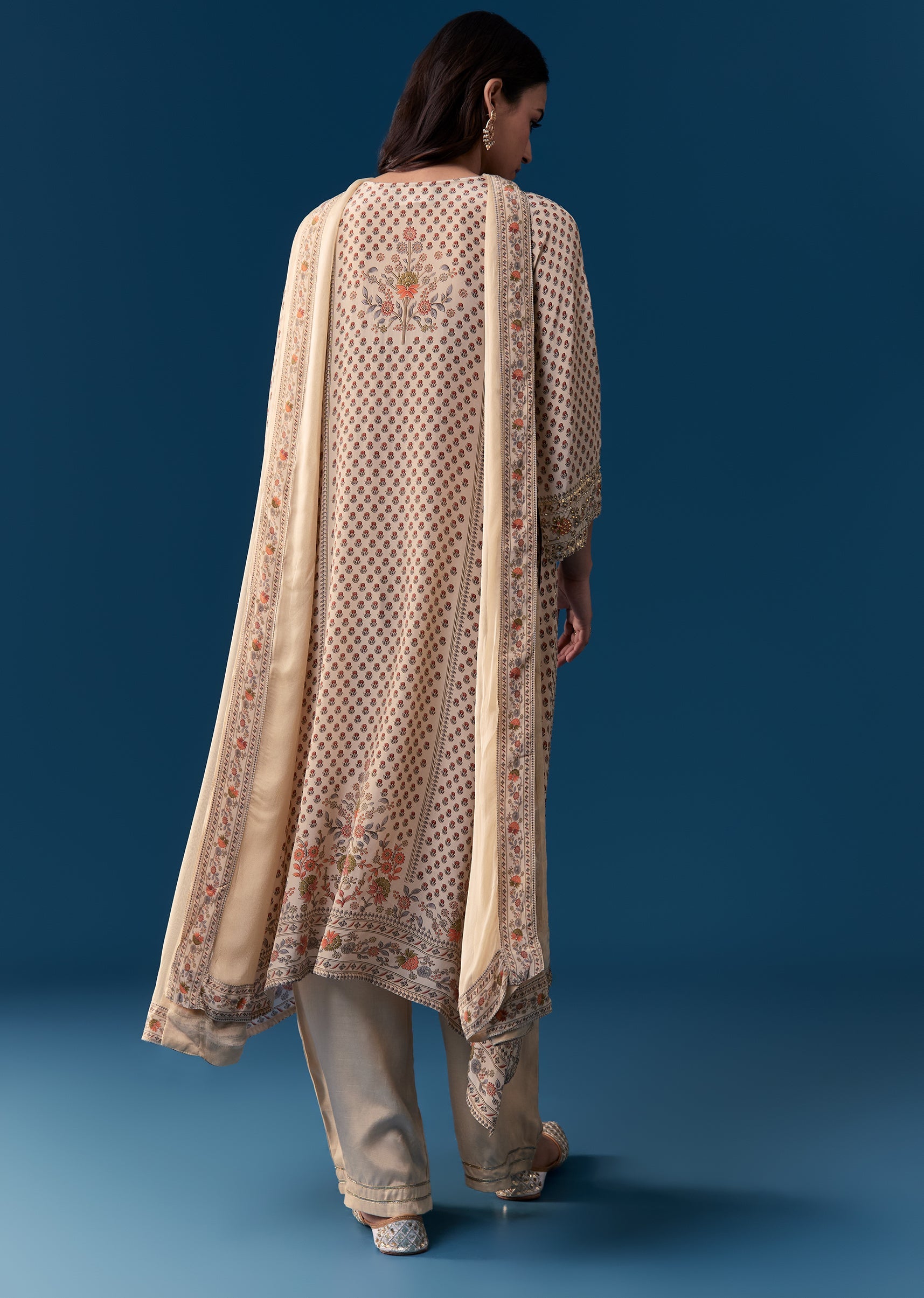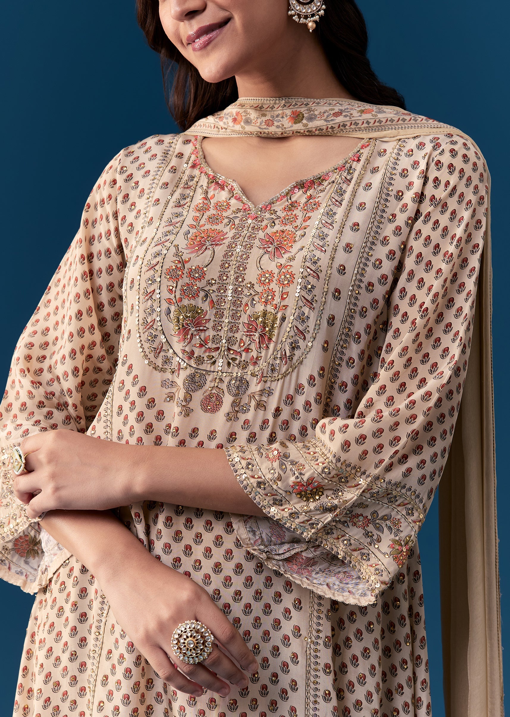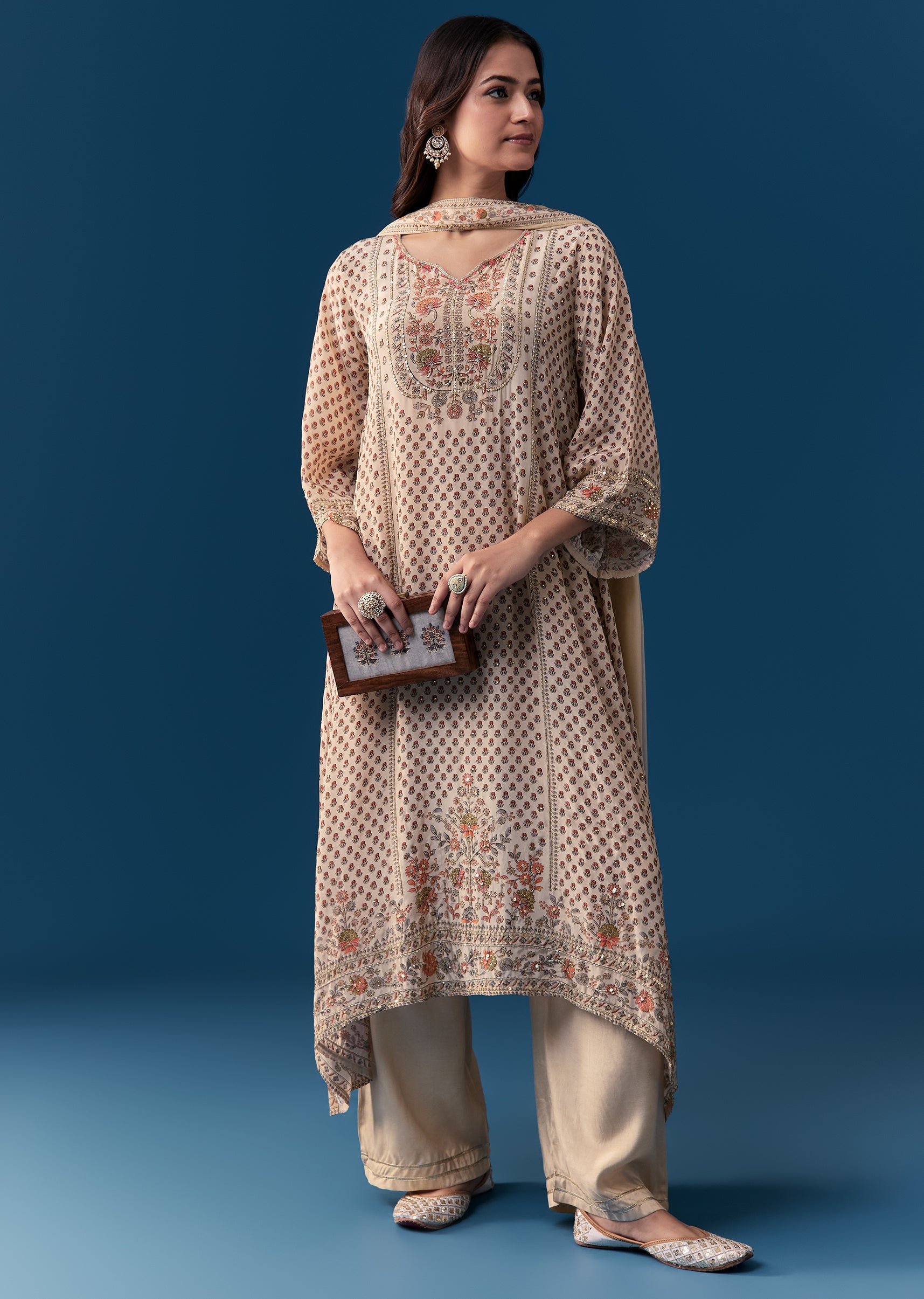 Celebrate understated elegance with this pastel beige kurta set in an asymmetric silhouette. The kurta features delicate sequins and stone embroidery along the flared sleeves and notched neckline, adding a... More Product Details