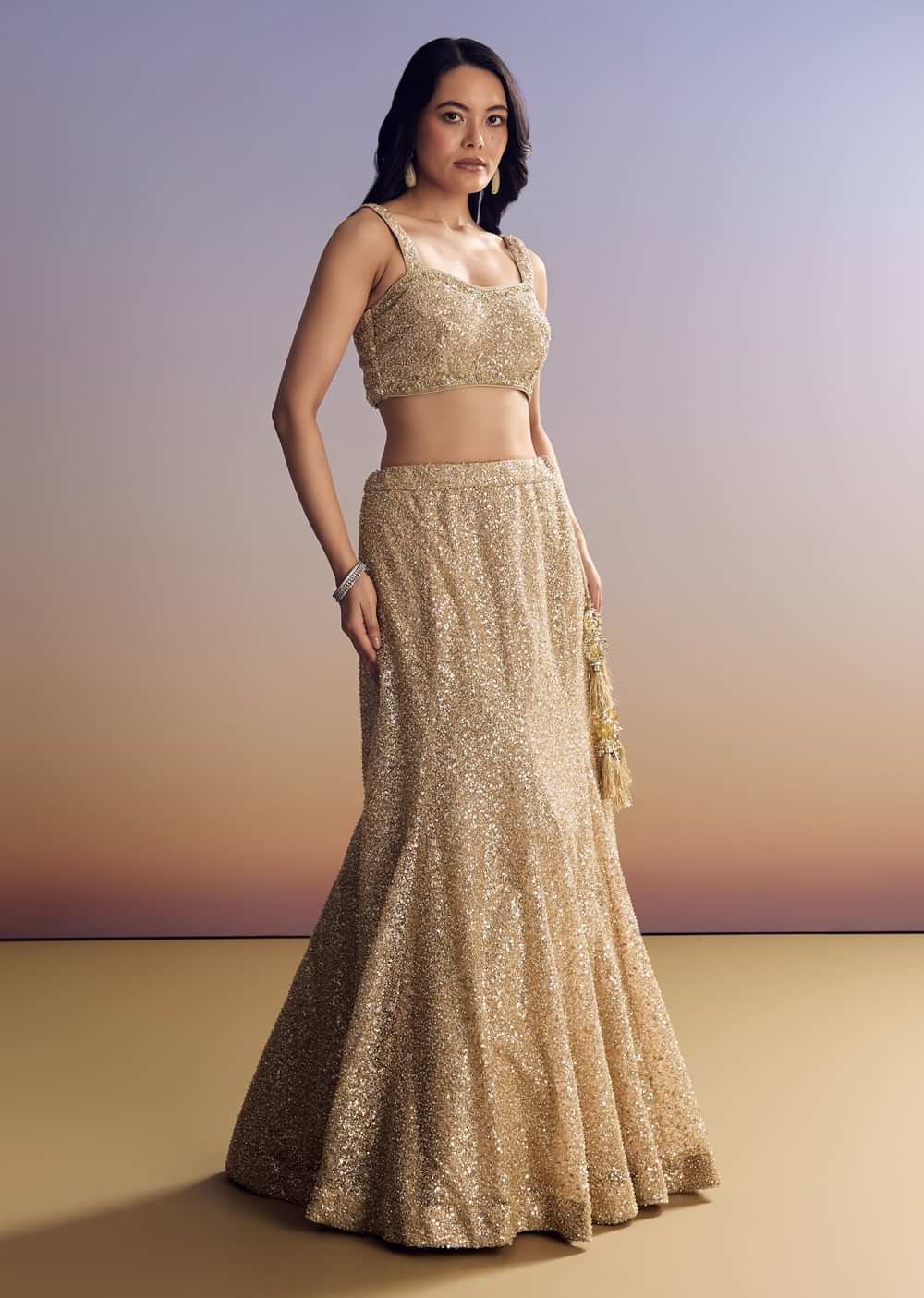 A beige lehenga with matching choli and an embellished jacket featuring sequin and cut dana work. A standout pastel pick for cocktails or sangeet. Awarded as the Most Trusted Brand, we're delivering styles you love, just as promised.