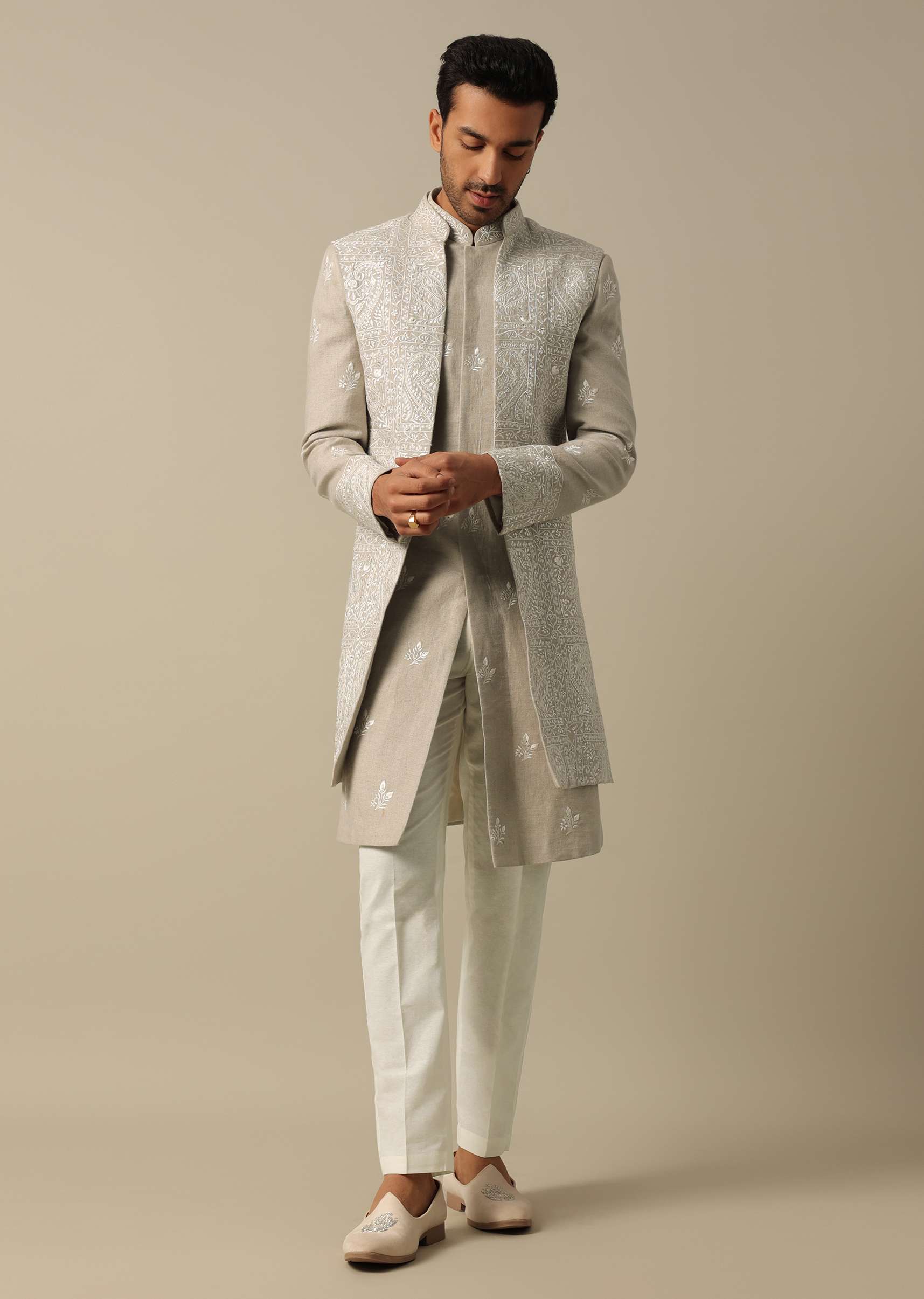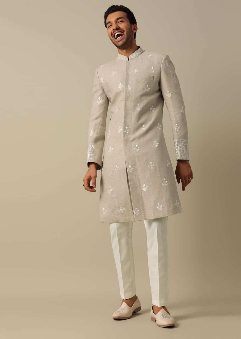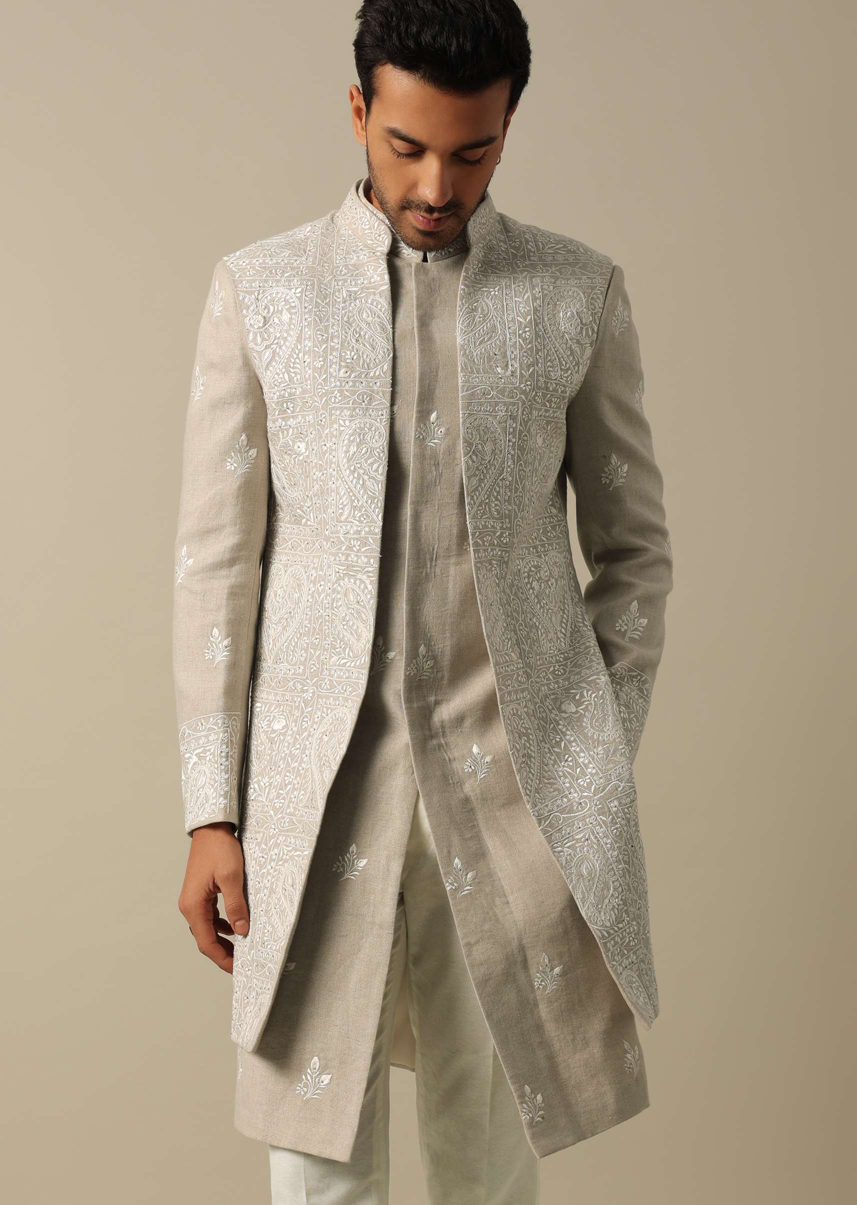 This men's Indowestern Sherwani Set in elegant beige linen is crafted to enhance your wedding style. This set is designed with intricate thread and Resham embroidery. The pack includes a sherwani jacket kurta and pant for a perfect fit. The set ensures a refined and memorable appearance at weddings and receptions. Awarded as the Most Trusted Brand, we're delivering styles you love, just as promised.