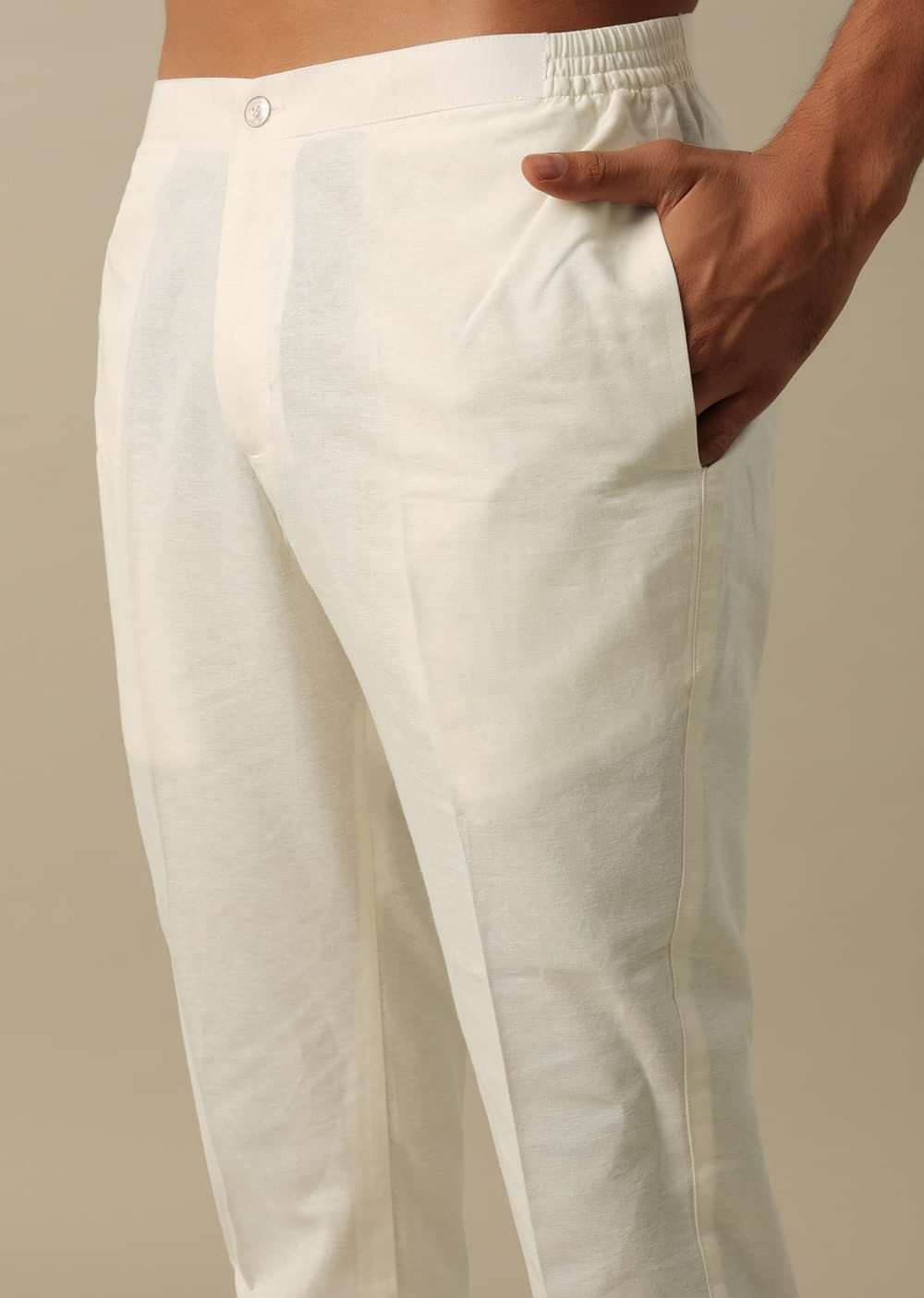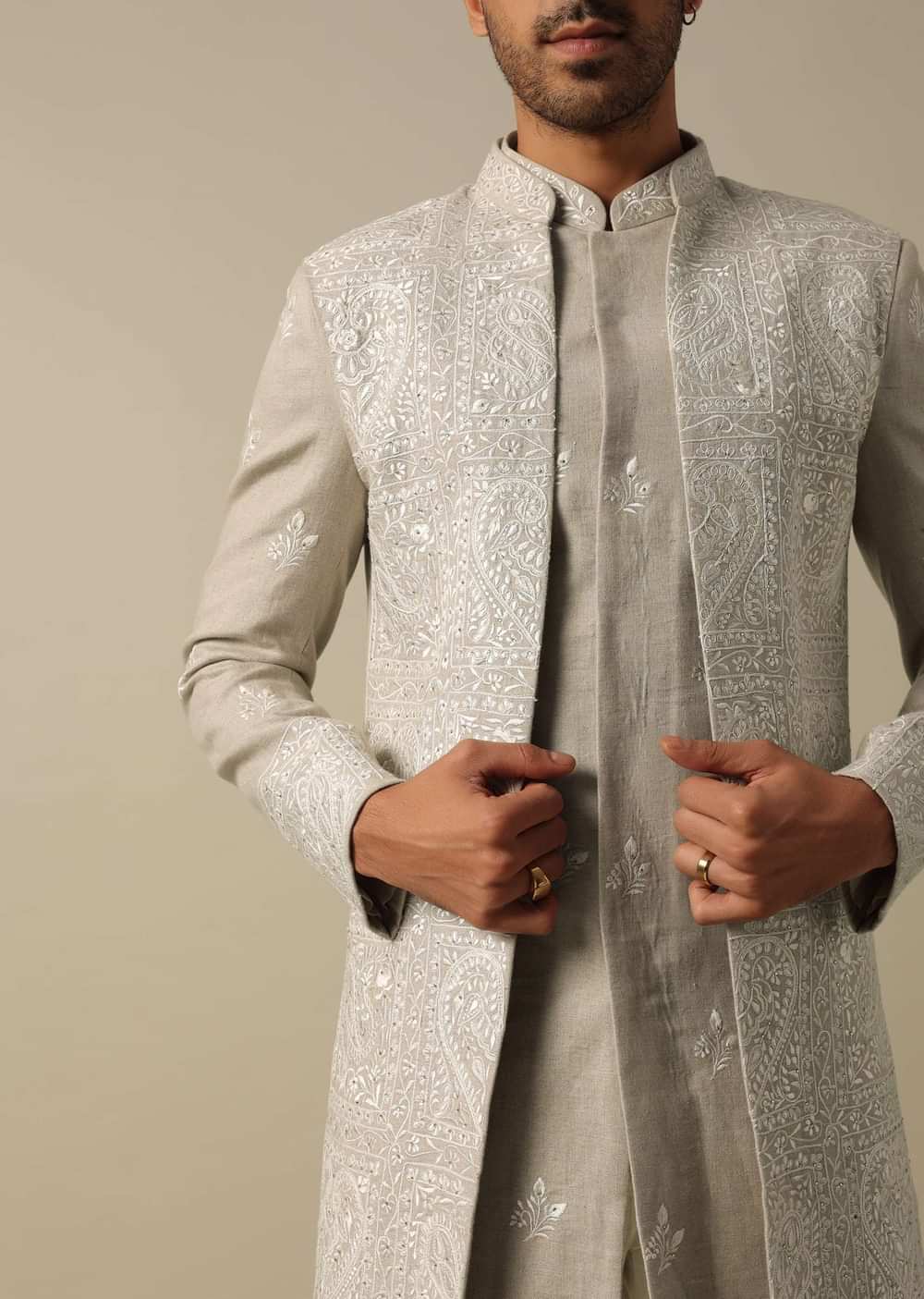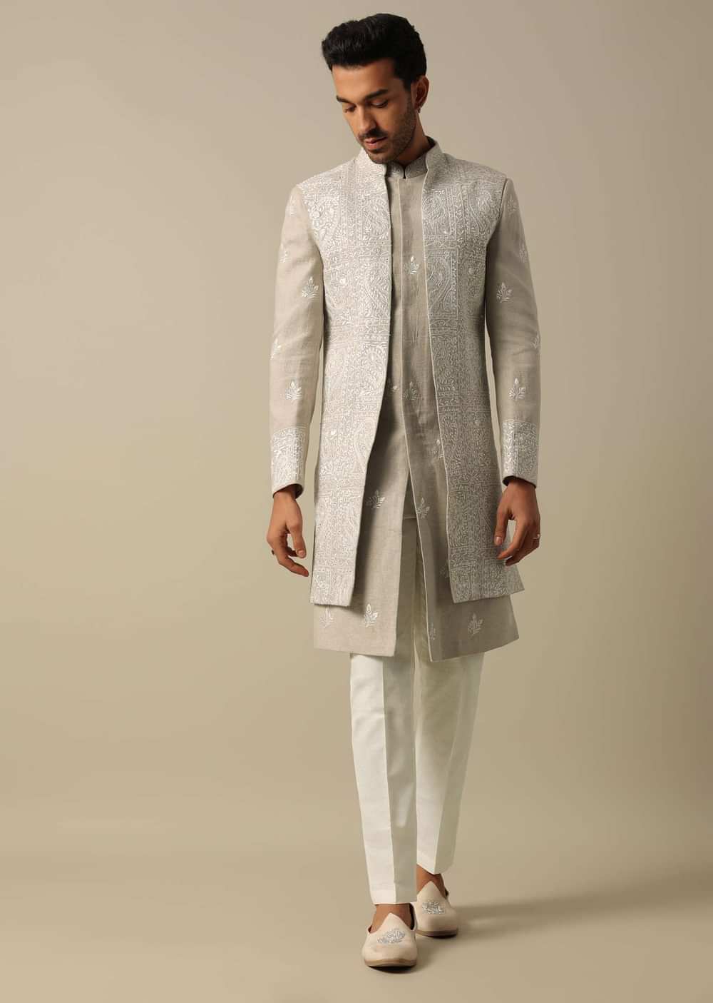 This men's Indowestern Sherwani Set in elegant beige linen is crafted to enhance your wedding style. This set is designed with intricate thread and Resham embroidery. The pack includes a sherwani jacket kurta and pant for a perfect fit. The set ensures a refined and memorable appearance at weddings and receptions. Awarded as the Most Trusted Brand, we're delivering styles you love, just as promised.
