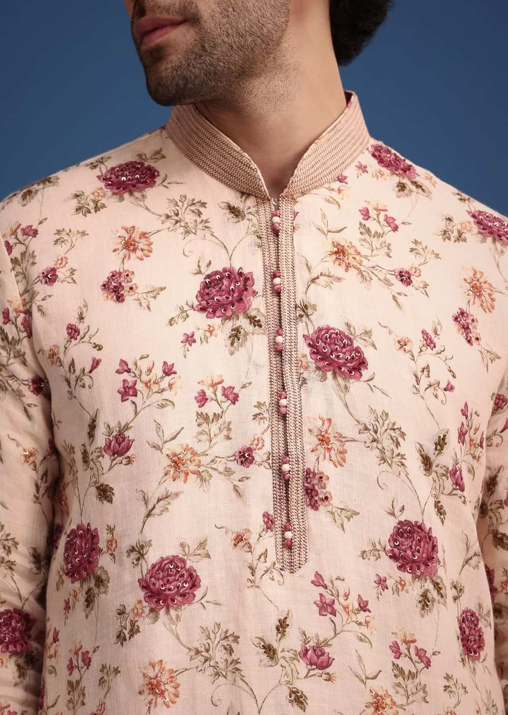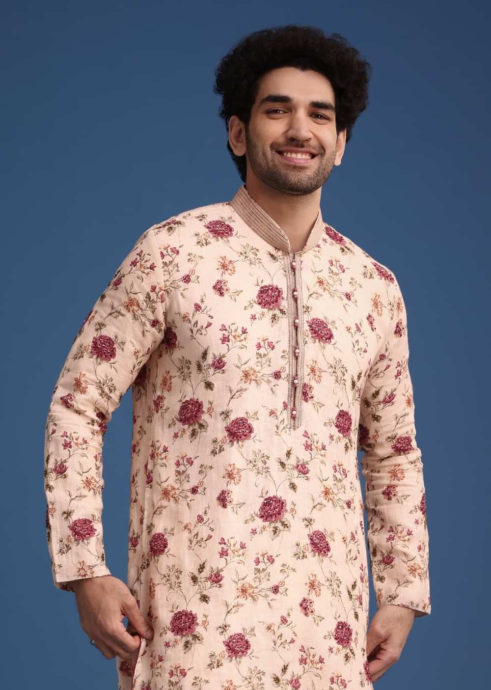 A Refined Beige Linen Kurta Set That Boasts Floral Motifs Woven Seamlessly Into Its Luxurious Fabric. The Understated Charm And Intricate Detailing Make It A Timeless Addition To Any Ethnic... More Product Details