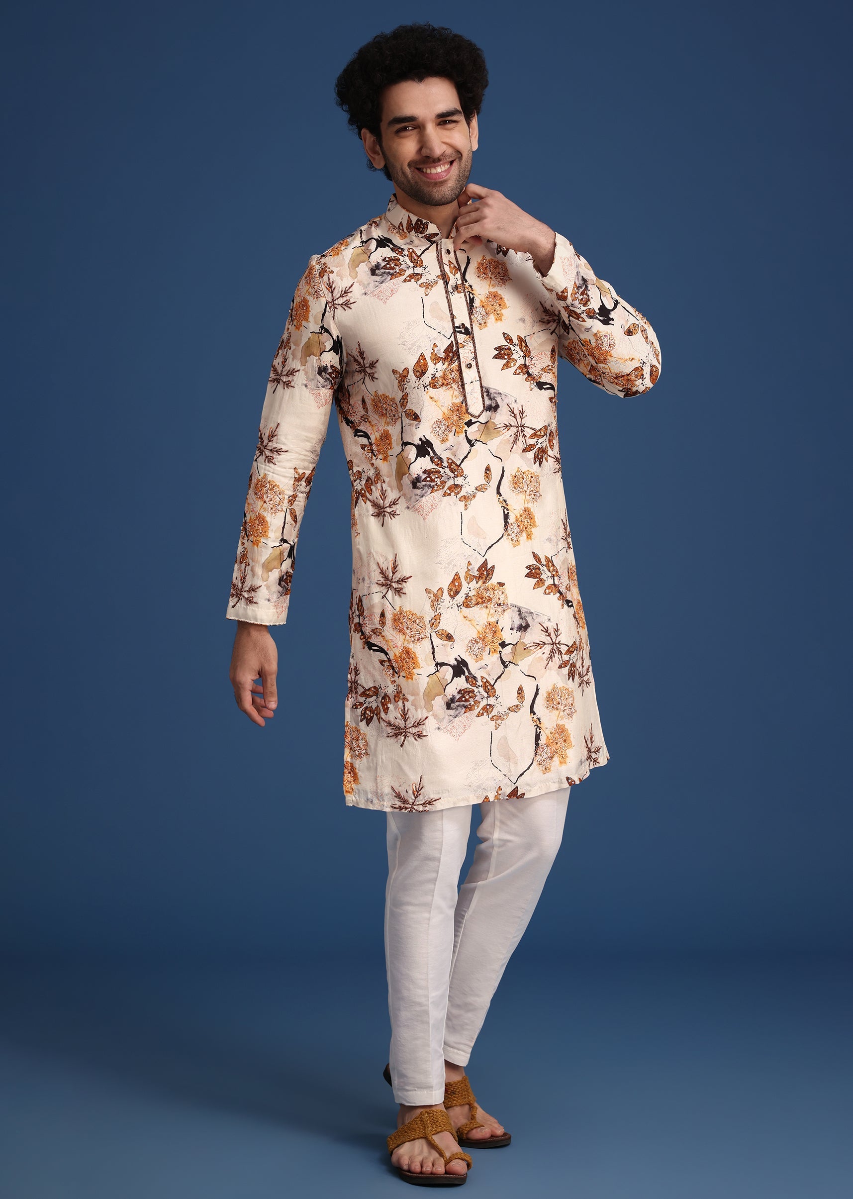 Beige Linen Printed Kurta Set With Leaf Motifs