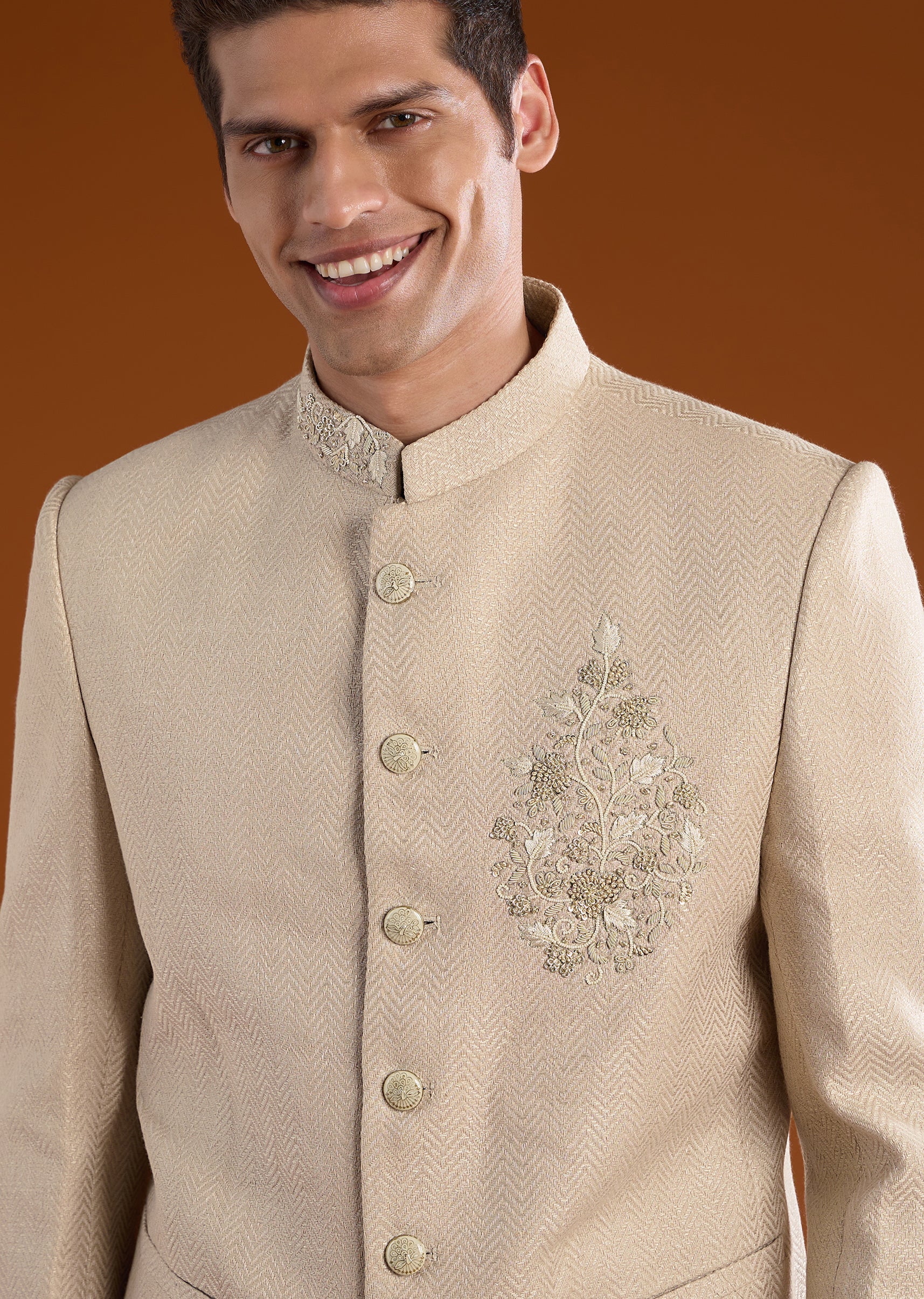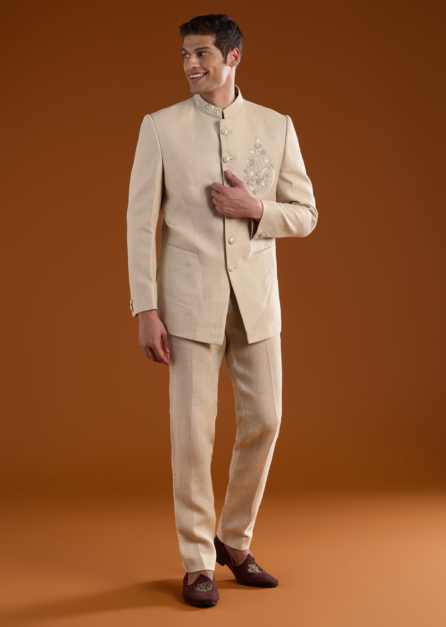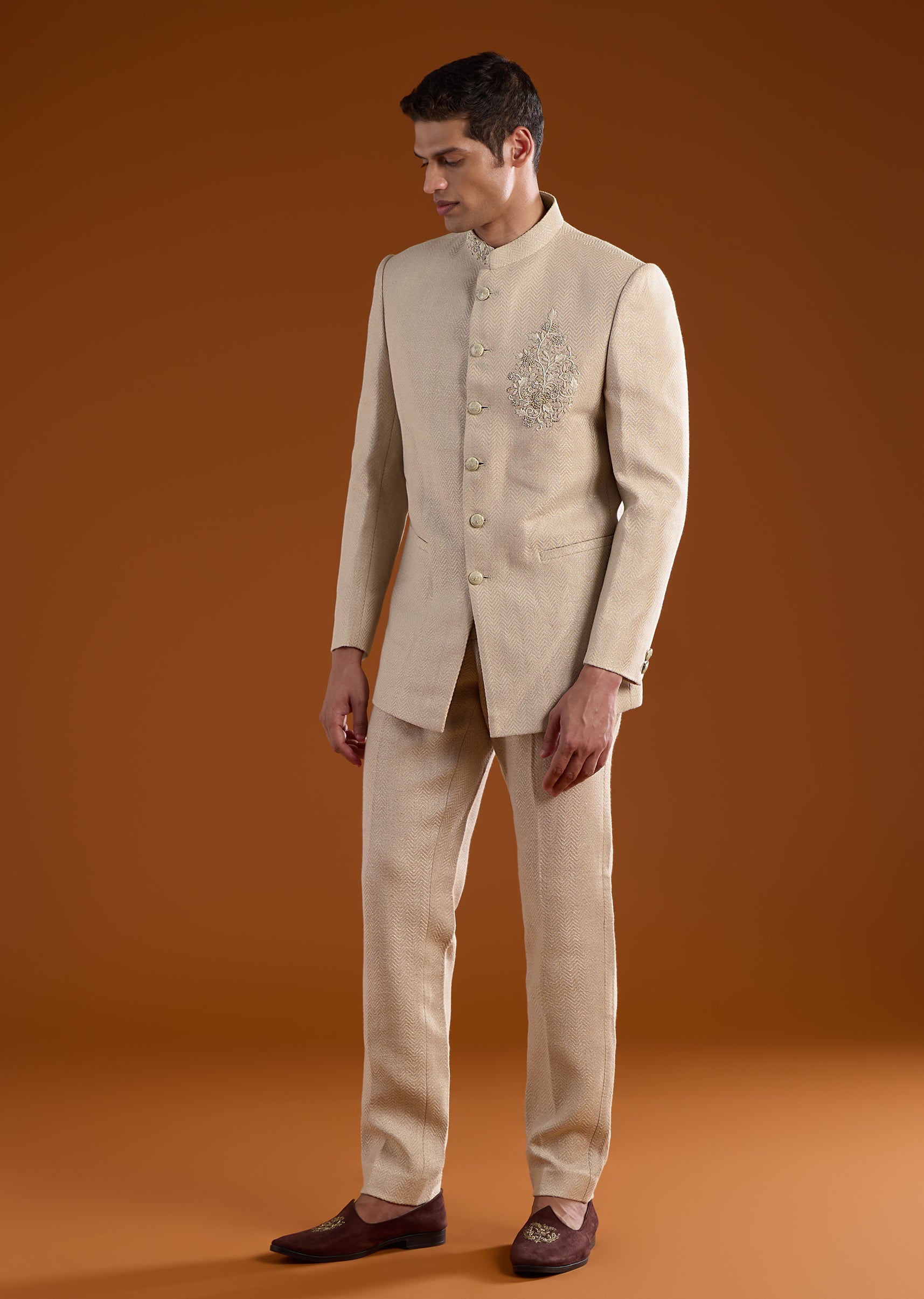 Beige Matka Silk Zardozi Embroidered Jodhpuri Set