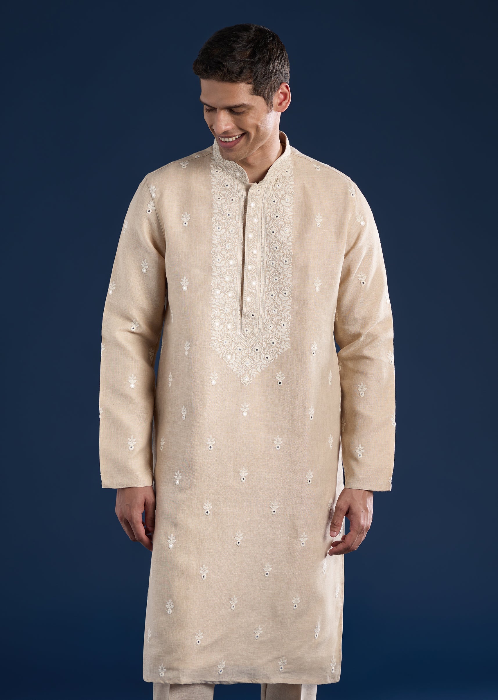 A refined pick for pooja and festive wear, this beige kurta set is crafted in silk and elevated with delicate resham thread and mirror detailing. Designed with a mandarin collar,... More Product Details