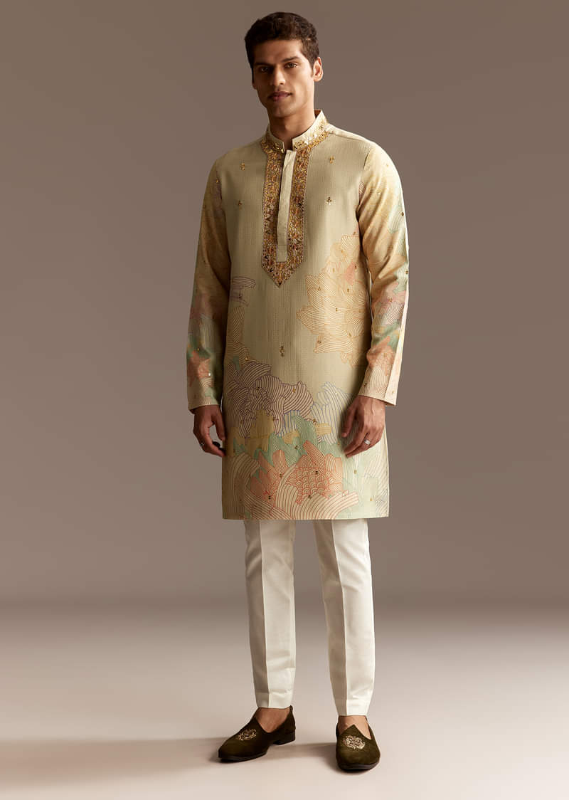 Understated yet graceful, this beige kurta set features subtle mirror accents. A go-to choice for minimalists attending haldi or festive poojas. Awarded as the Most Trusted Brand, we're delivering styles... More Product Details