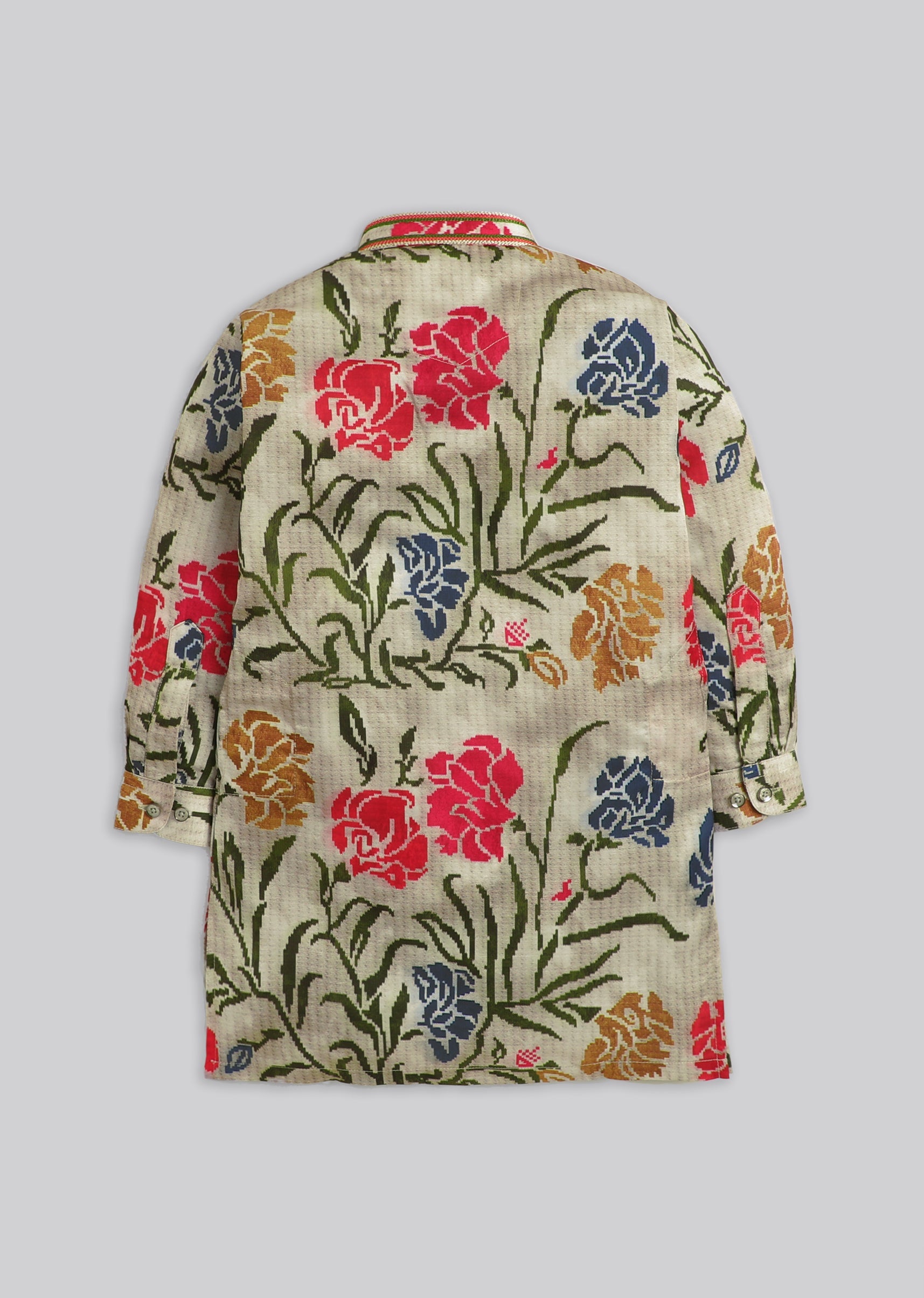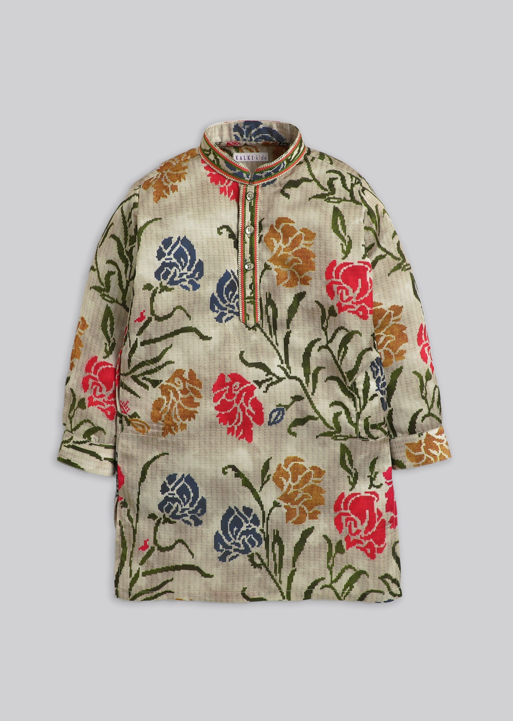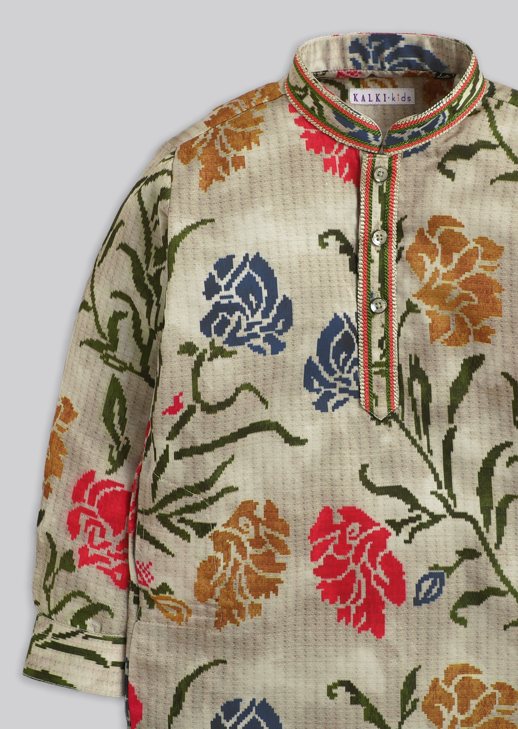 A silk boys’ kurta set with a beige base and multi floral print accents, finished with a mandarin collar and button front. Paired with matching pants—ideal for festive occasions. Awarded... More Product Details