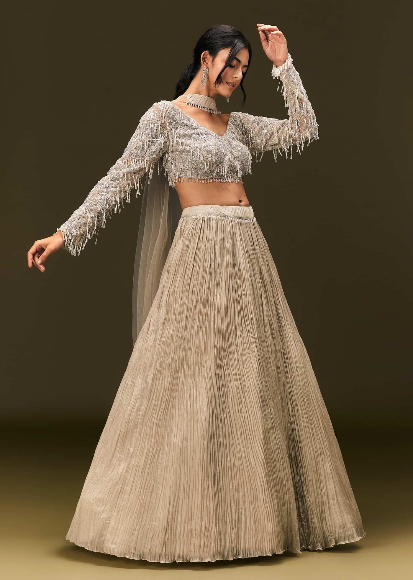 Beige Net Embroidered Blouse With Ruched Lehenga And Choker Dupatta