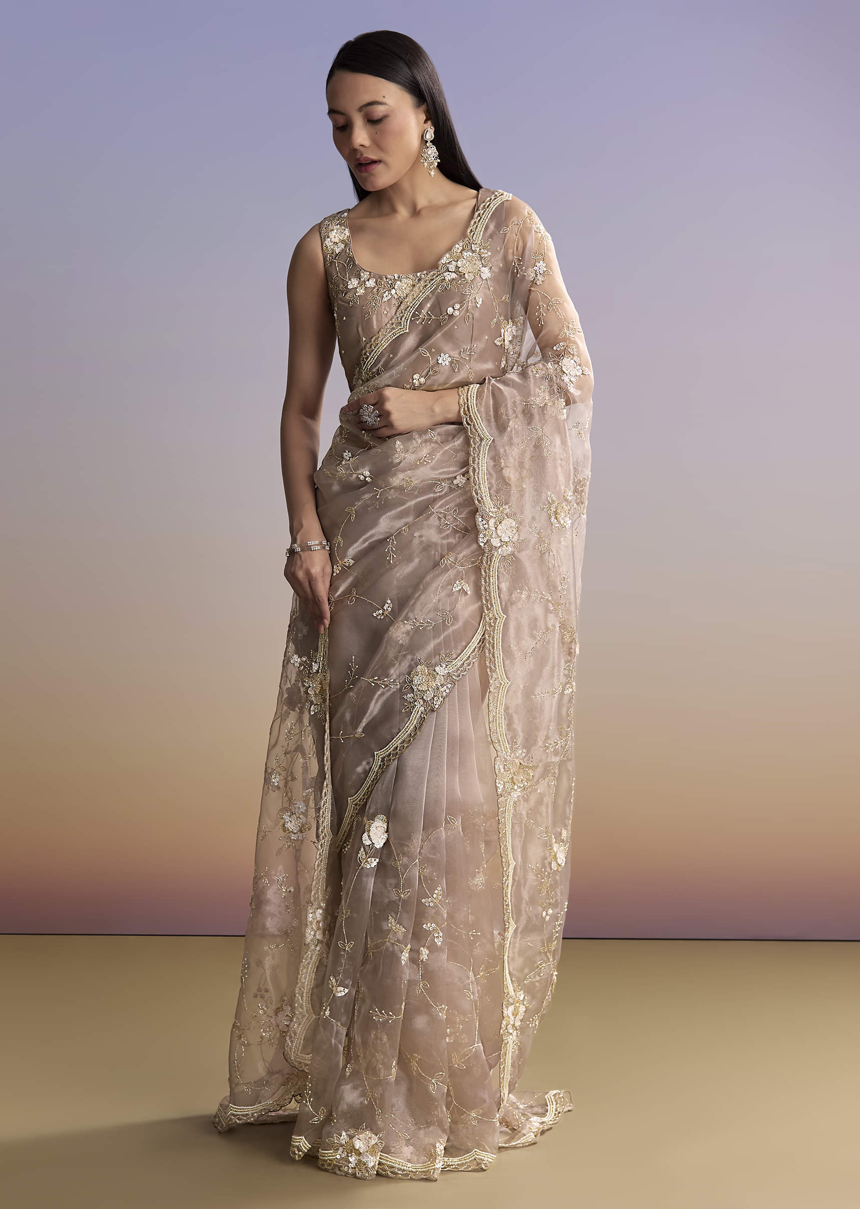 Graceful and light, this beige organza embroidered saree feels airy and chic. The scallop border, floral jaal, and heavy handwork in moti, cutdana, sequins, and beads bring richness to every fold. It lets you shine at a reception or sangeet without taking the spotlight away. Awarded as the Most Trusted Brand, we're delivering styles you love, just as promised.