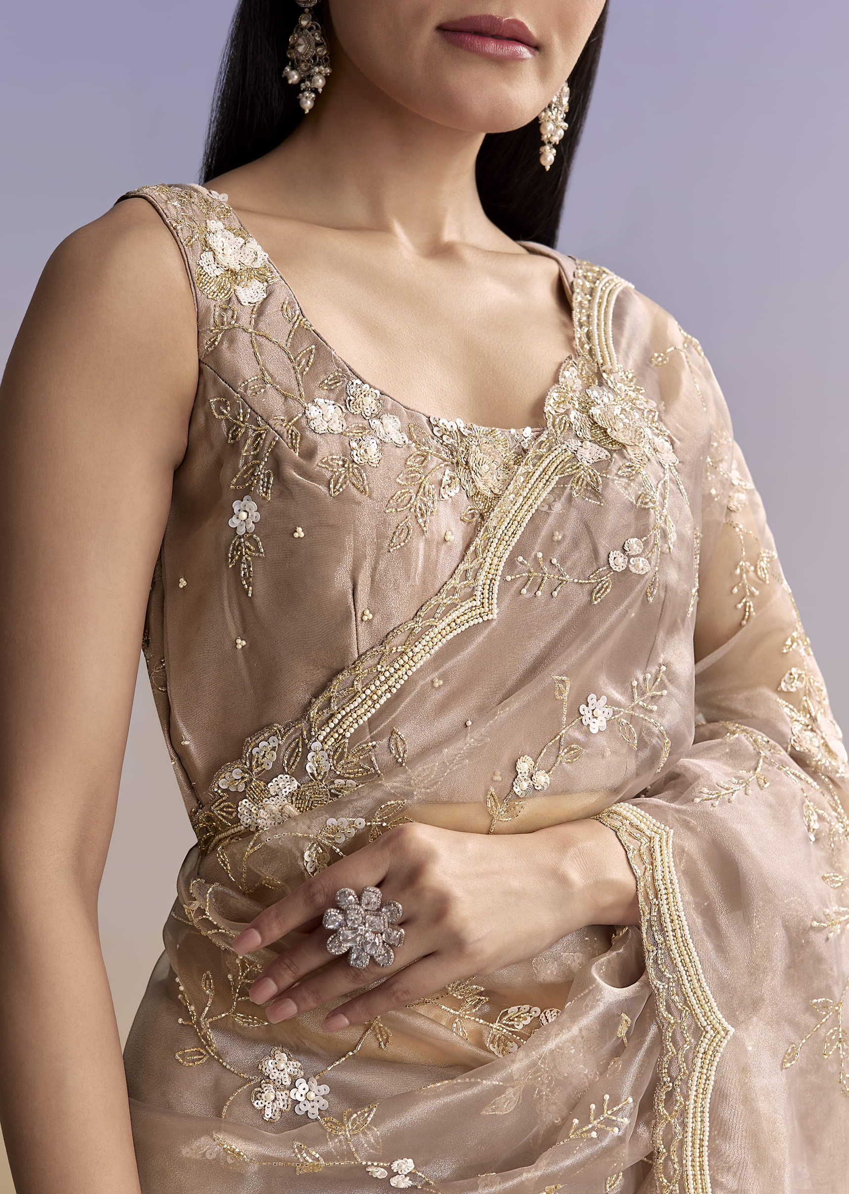 Beige Organza Embroidered Saree With Moti And Cutdana Work