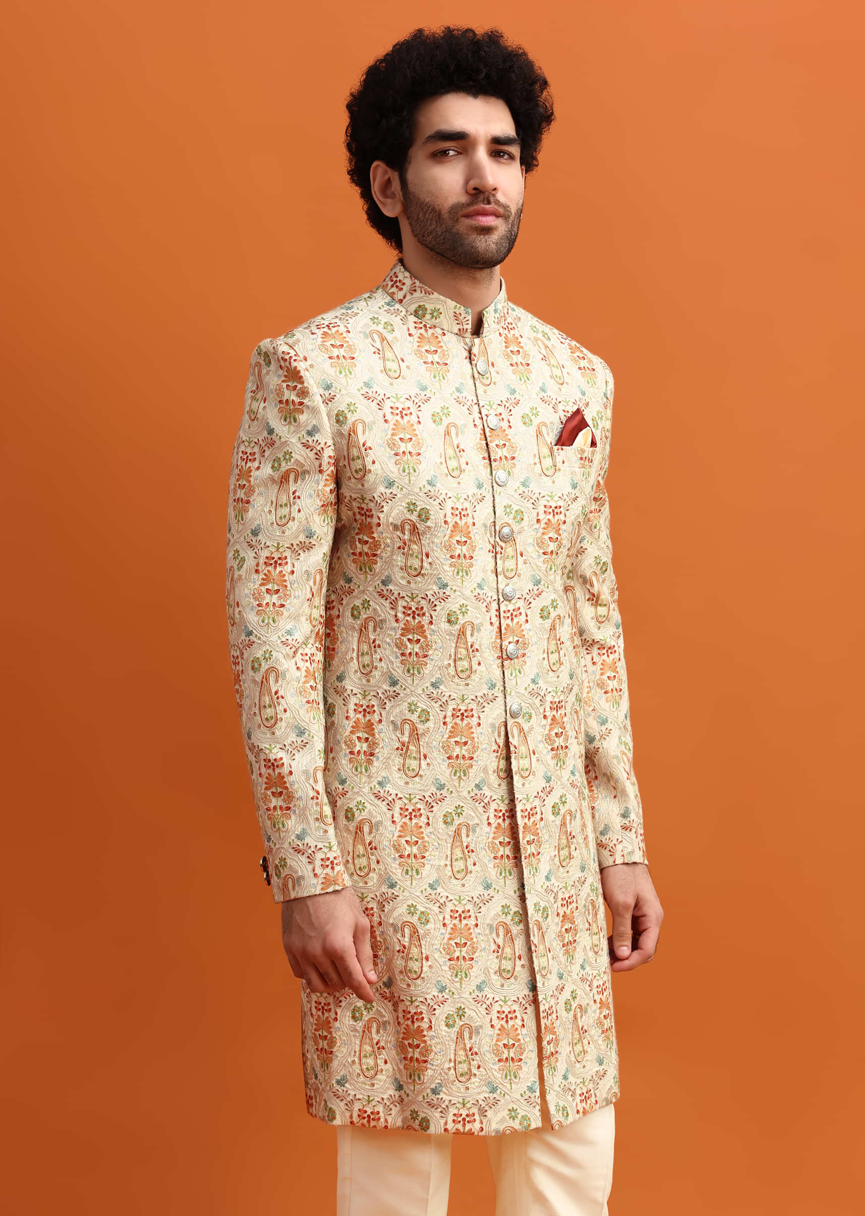 Beige Paisely Printed Sherwani With Resham Work For Men