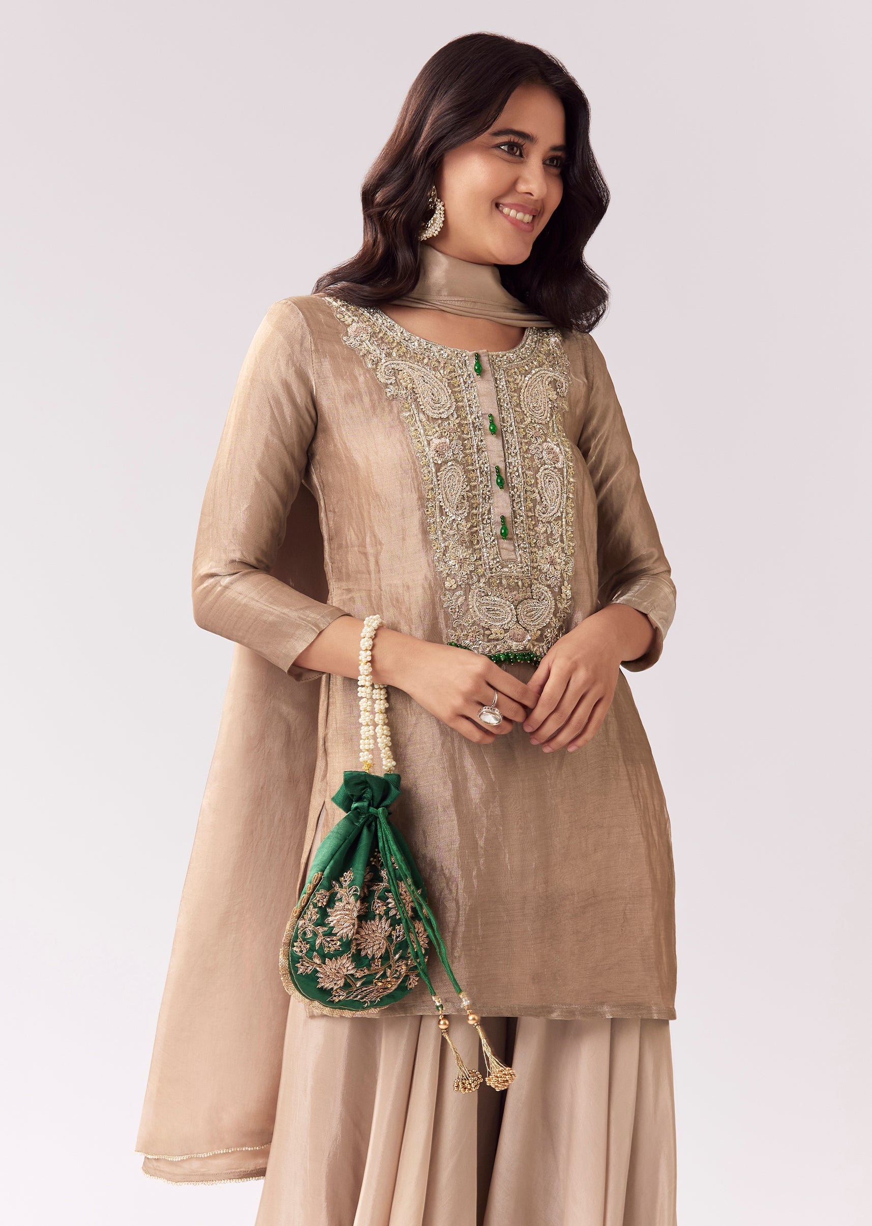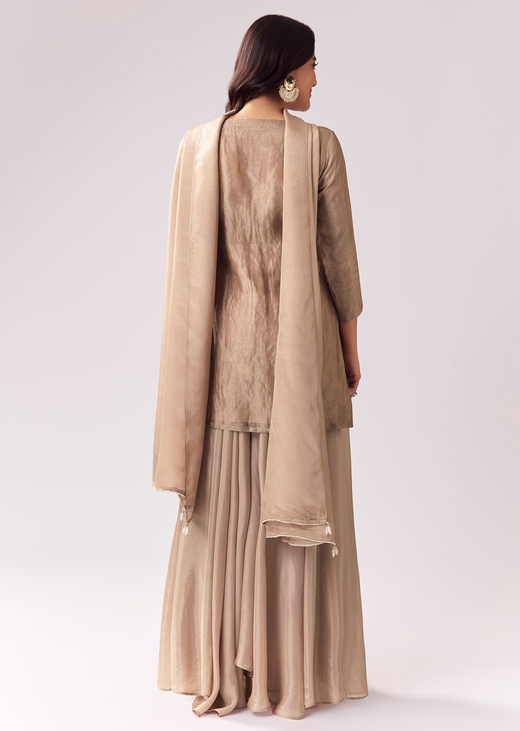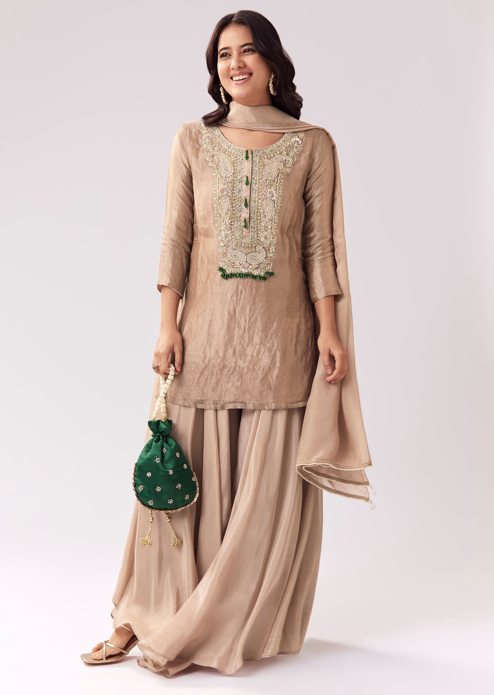 This beige palazzo suit blends classic festive styling with a refined, minimal silhouette. The kurta features zardozi and sequin work that adds rich detail without overpowering. 3/4 sleeves and a... More Product Details