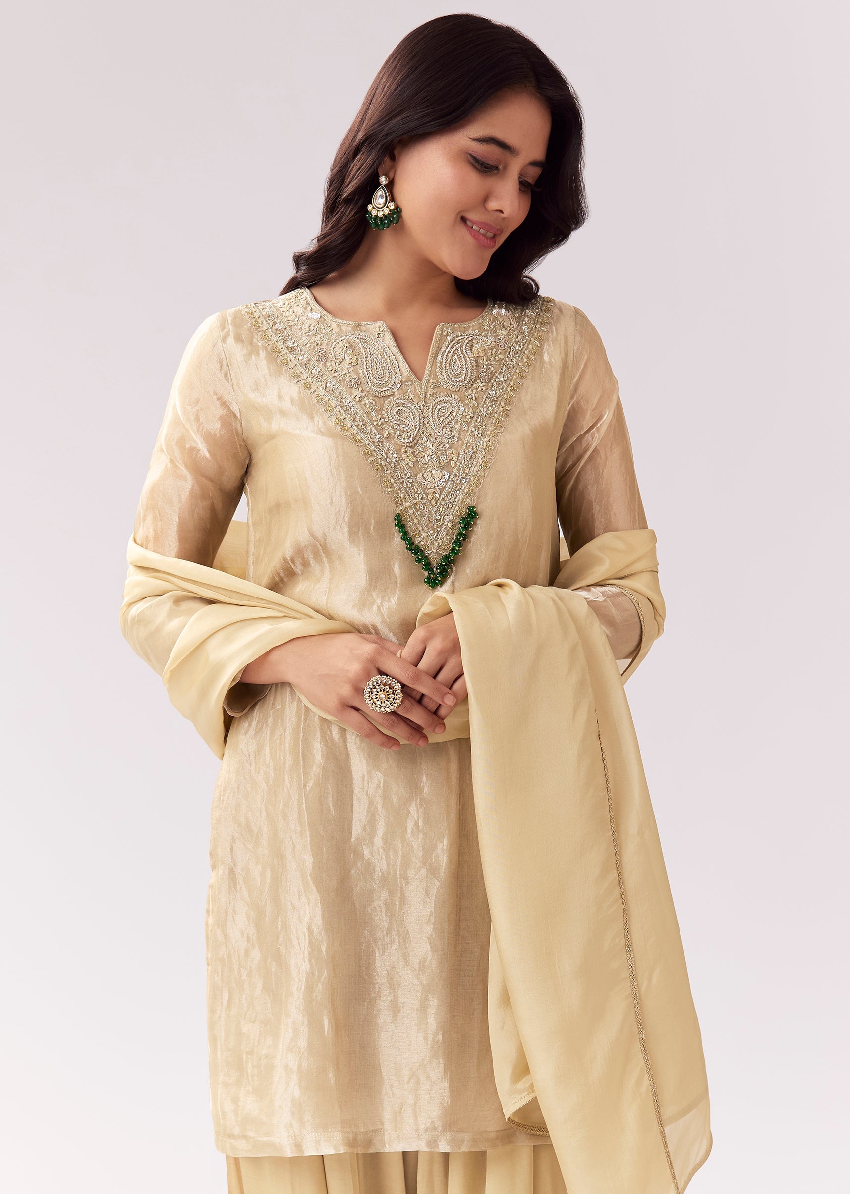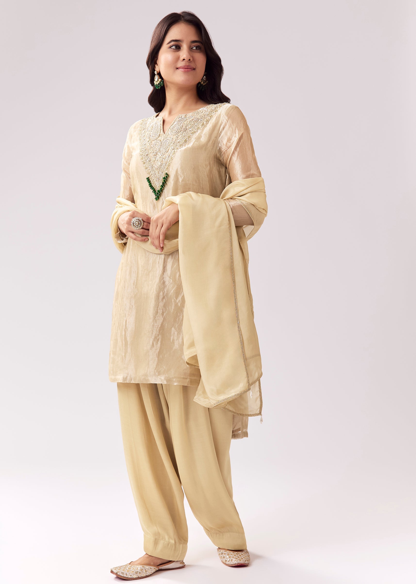This beige patiala suit is ideal for customers who want a softer, sophisticated festive look. The kurta features zardozi and sequin work for shimmer, while the notched neckline gives it... More Product Details
