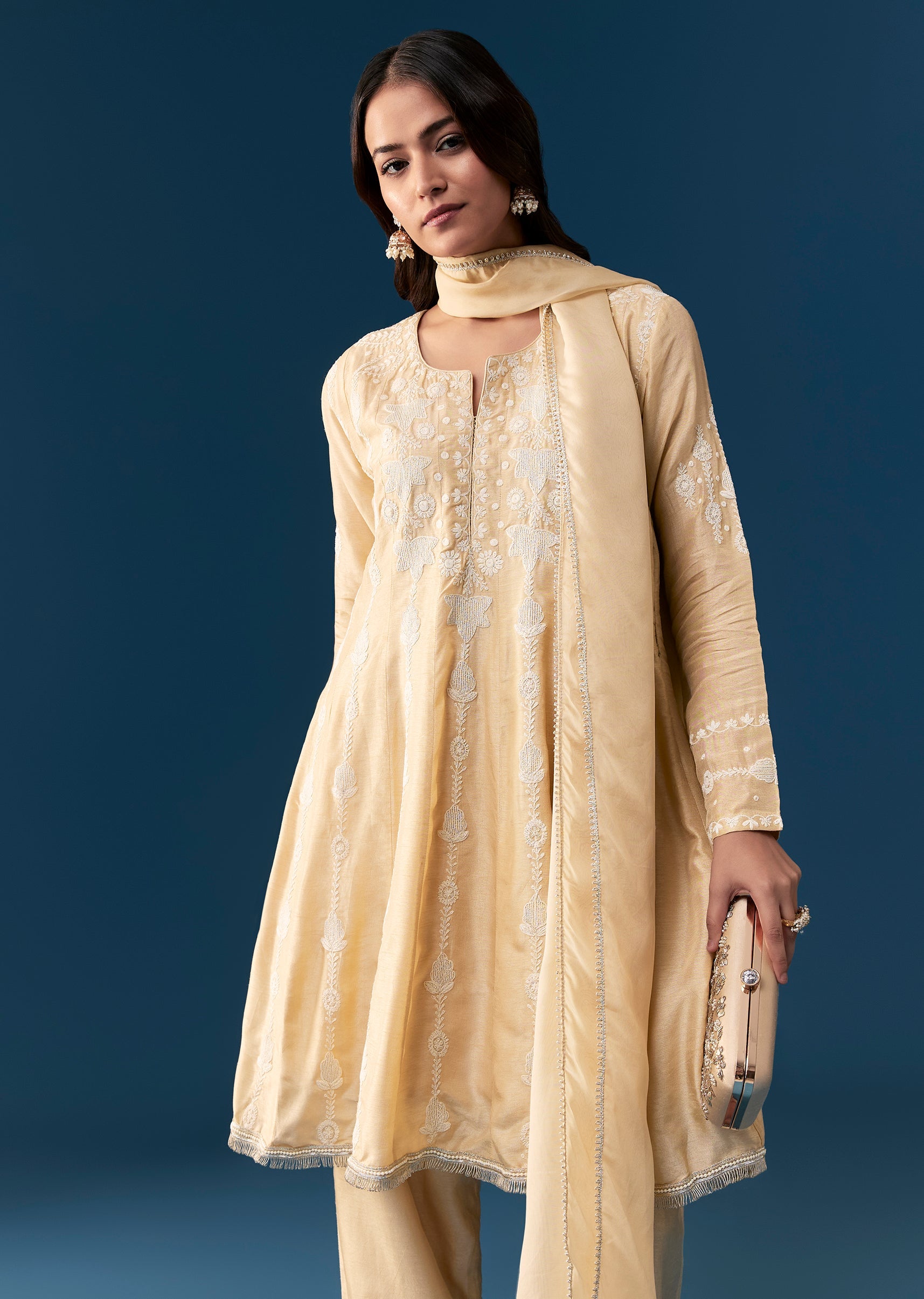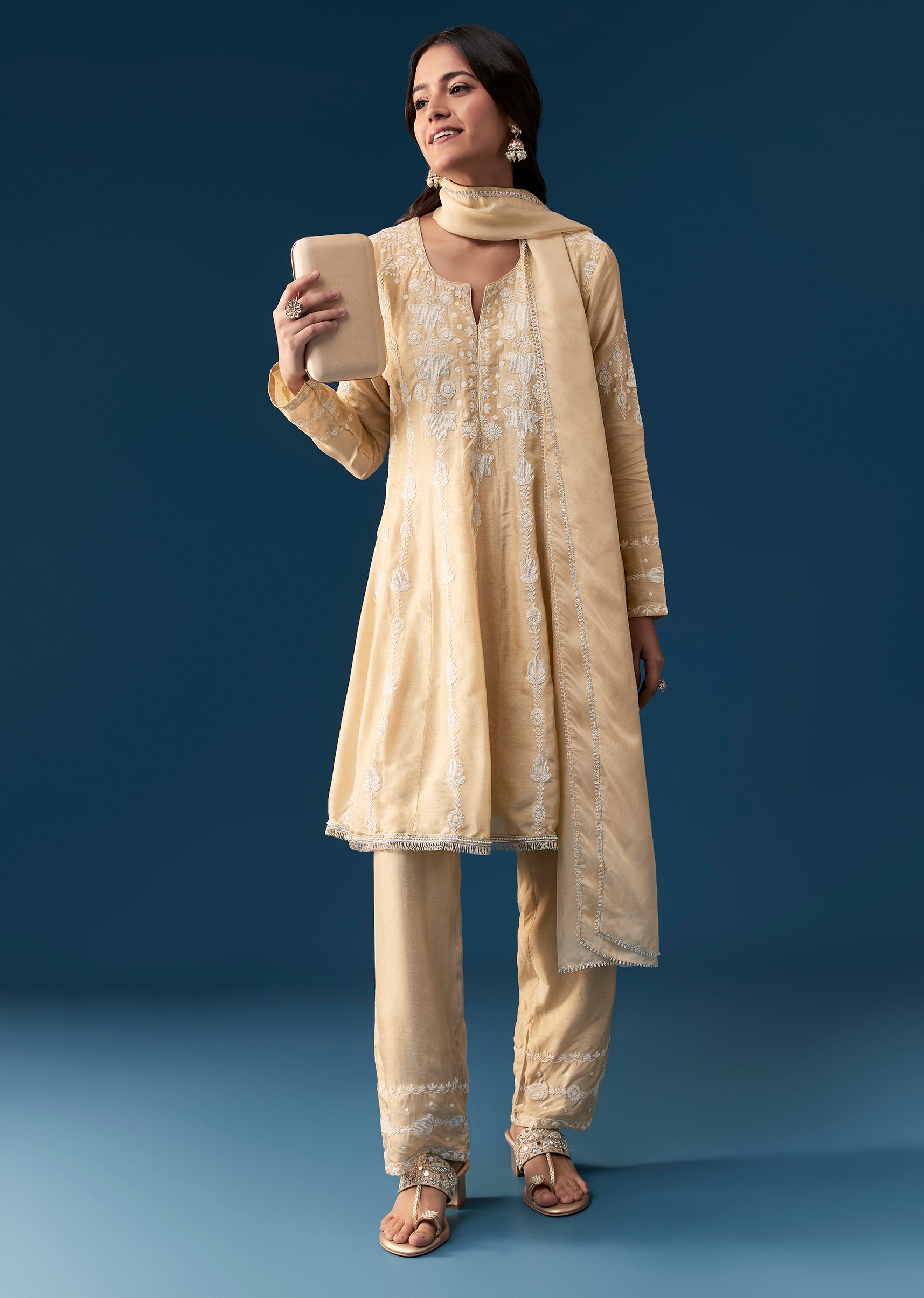 Beige Peplum Pakistani Style Anarkali Suit Thread Work