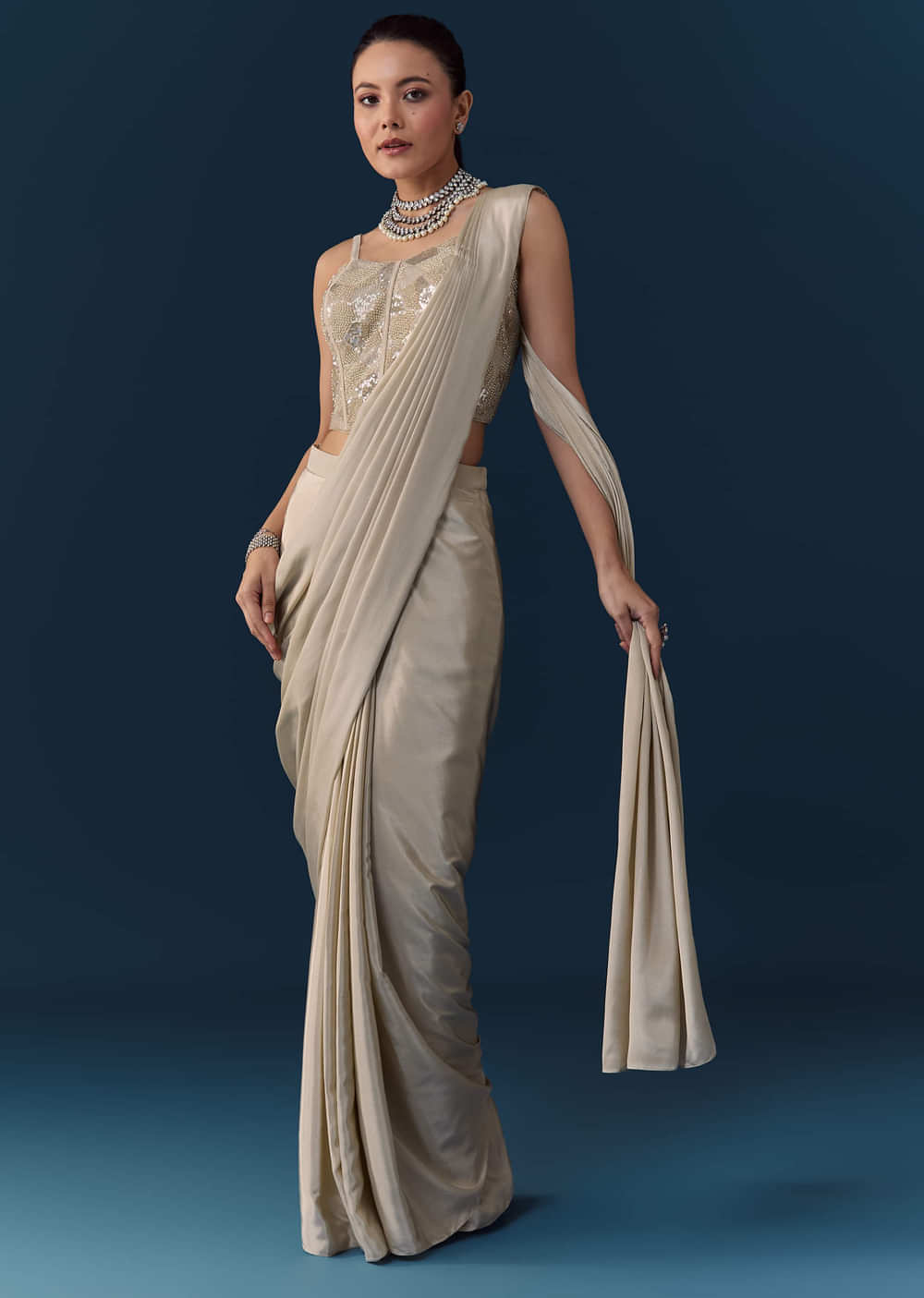 Beige Pre Pleated Saree with Sequin Corset Blouse