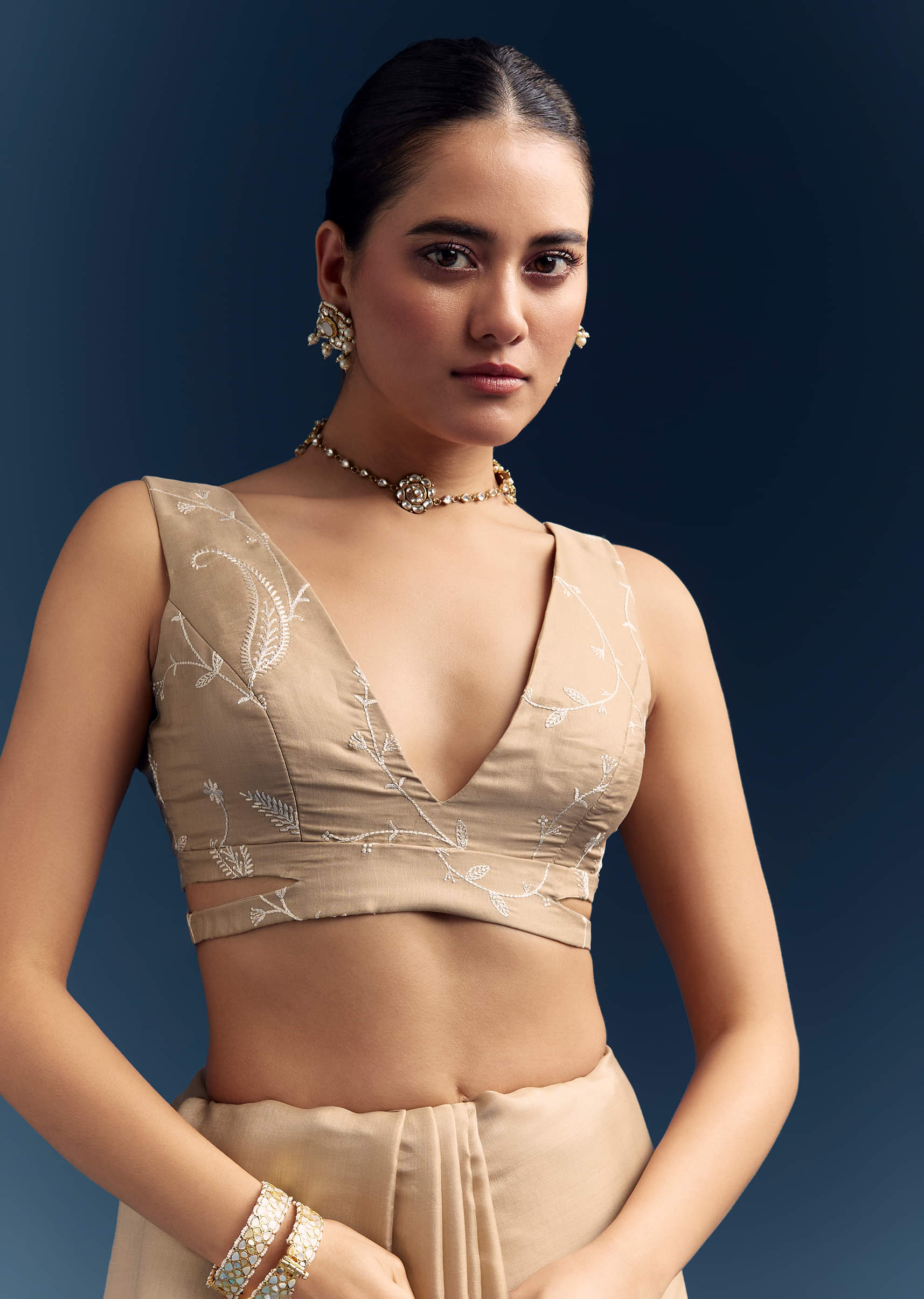 Under natural light, this beige satin cotton saree reflects a gentle sheen while staying cool against the skin. White resham embroidery and a scalloped edge keep the look crisp and... More Product Details