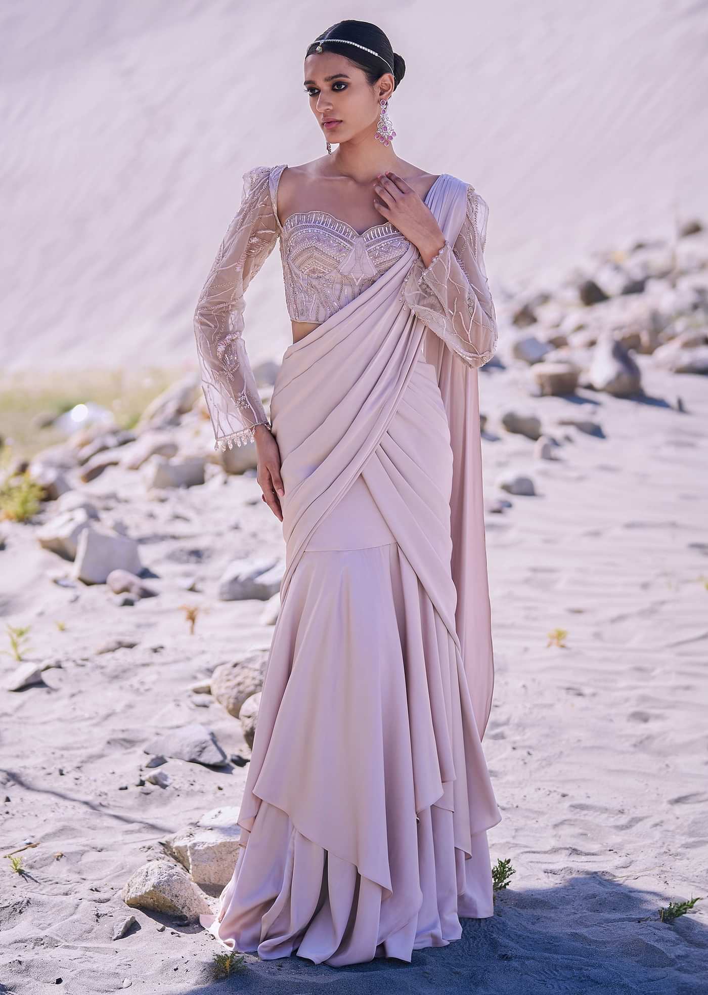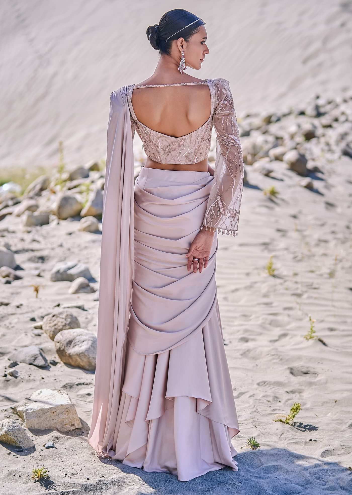 Beige Satin Pre Draped Saree With Embroidered Corset Blouse