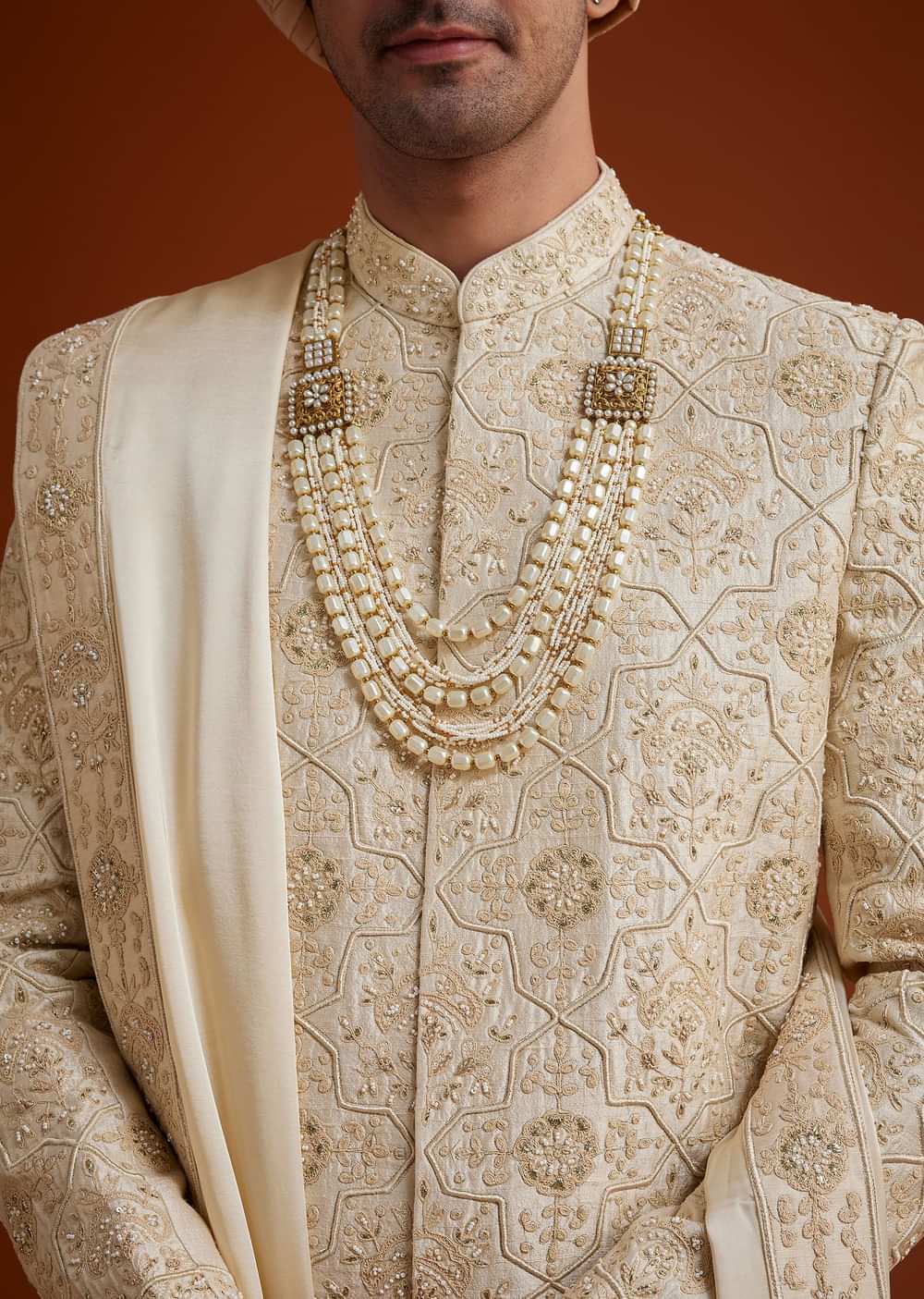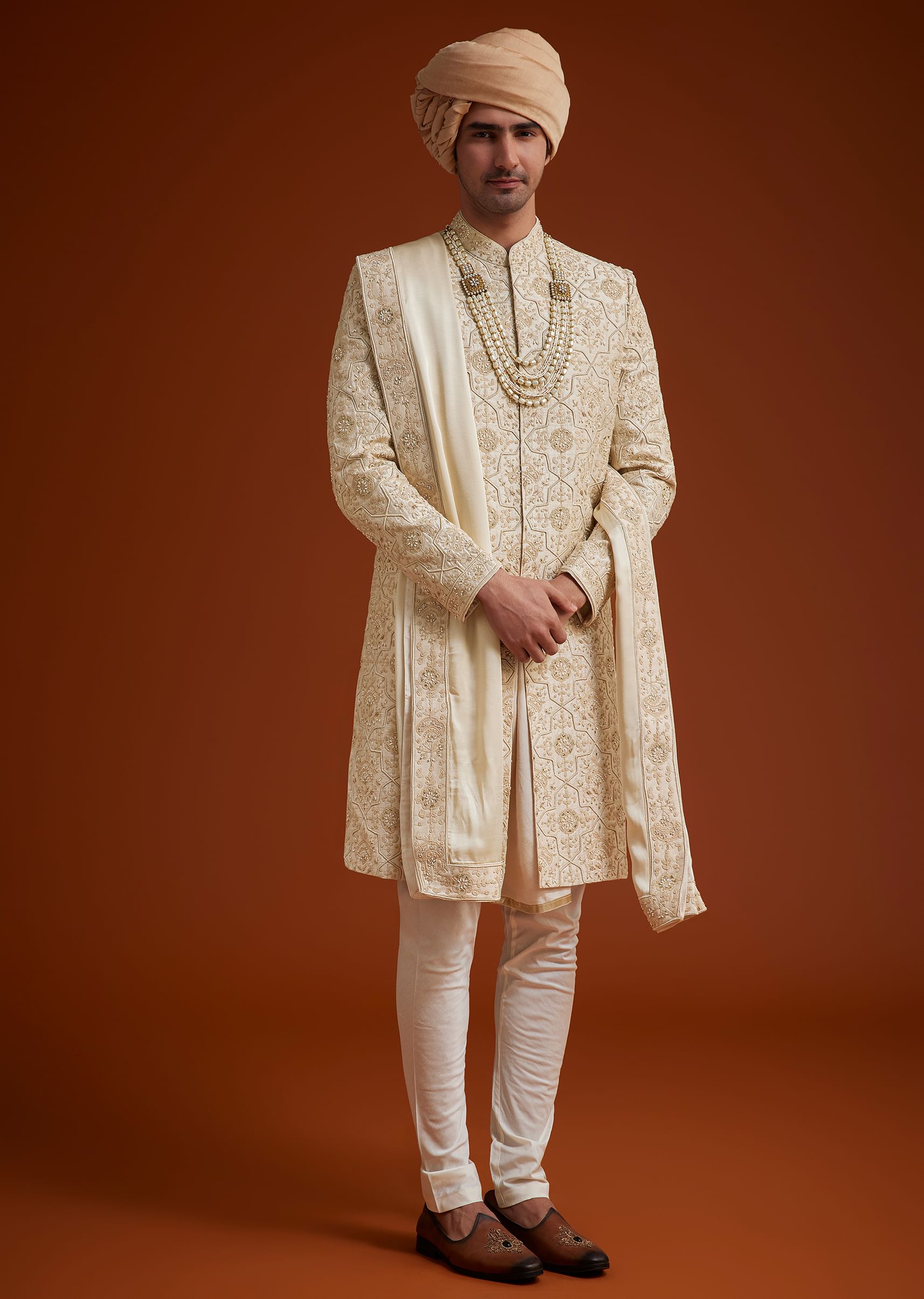 - This beige sherwani is a masterpiece of fine craftsmanship, featuring intricate dori and thread embroidery that runs seamlessly across the fabric.